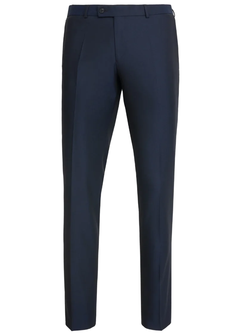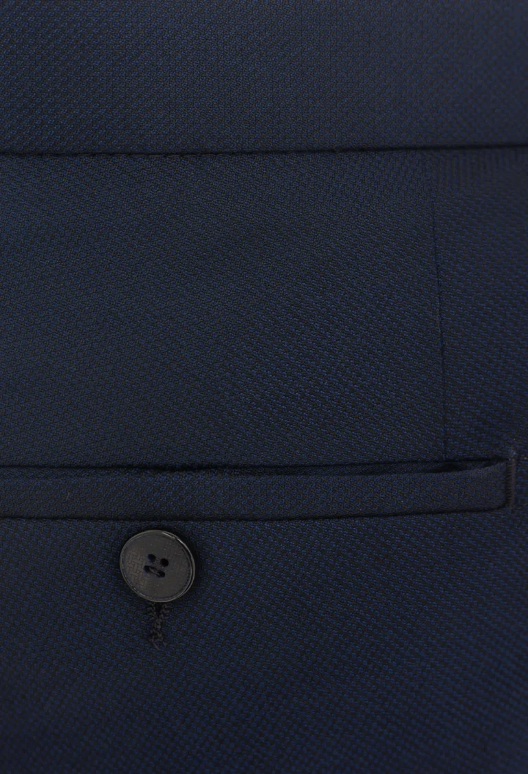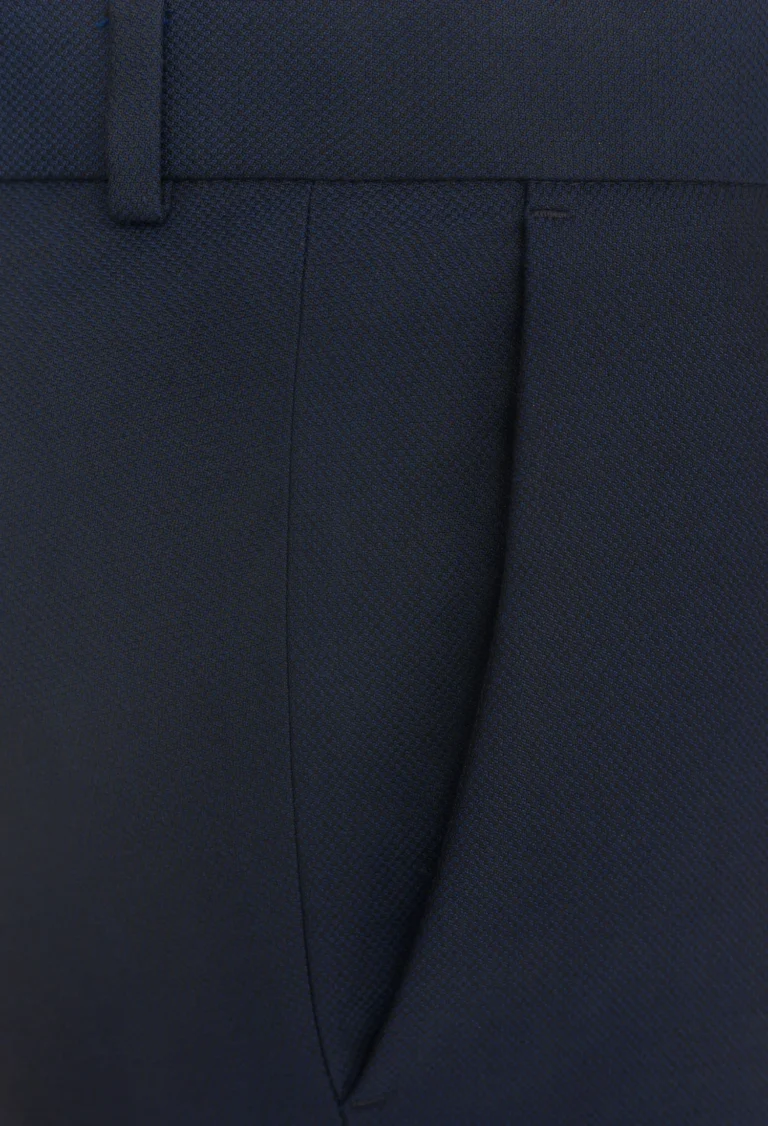 Spodnie klasyczne w kolorze granatowym z delikatnym mikrowzorem w podobnym odcieniu. Spodnie z kolanówką, zaprasowane na kant o wyszczuplonym kroju.