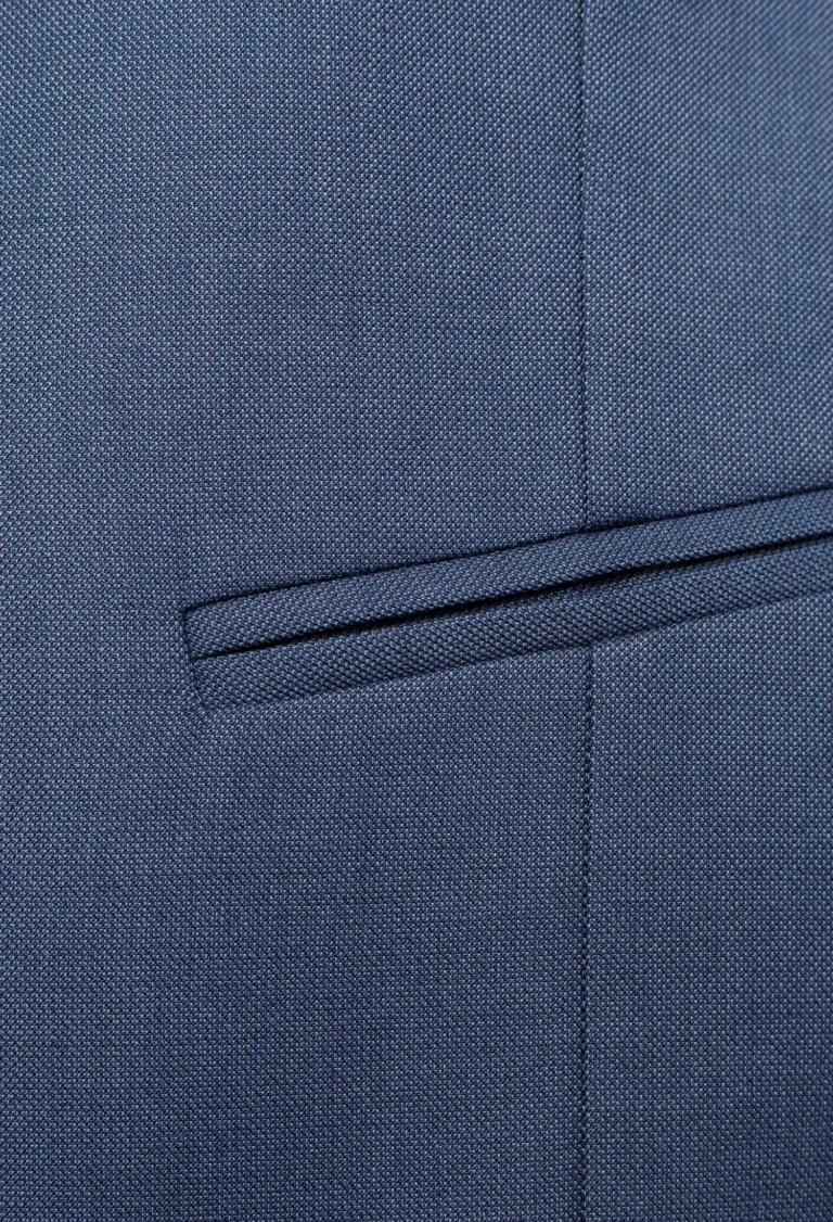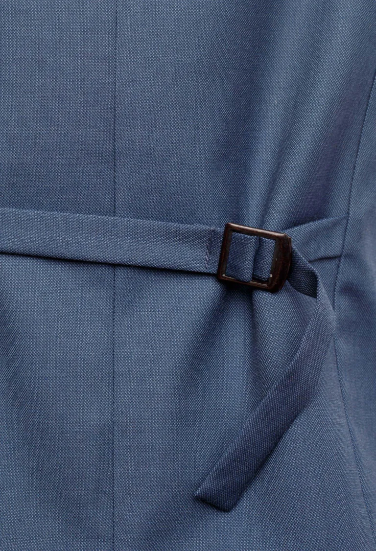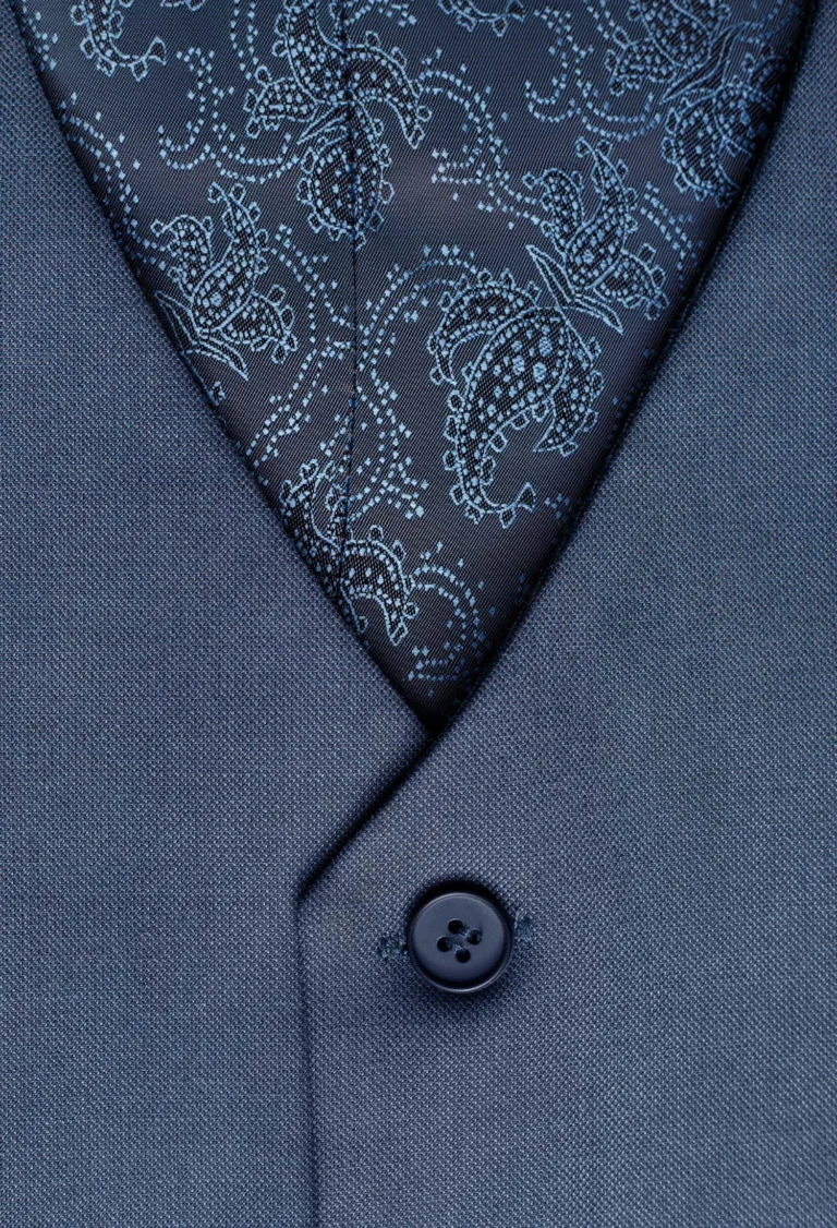 Kamizelka męska w kolorze niebieskim opalizująca szarymi tonami o ciekawym strukturalnym wzorze. Model jednorzędowy posiada dwie cięte kieszenie dwuwypustkowe, z tyłu wygodna regulacja na klamerkę. Kamizelka niesztampowa wykonana estetycznie, stanowi świetną propozycję do eleganckich wizytowych marynarek jak i casualowych. Doskonale podkreśla atuty męskiej sylwetki. Dobrze prezentuje się ze spodniami typu chino w różnych kolorach.