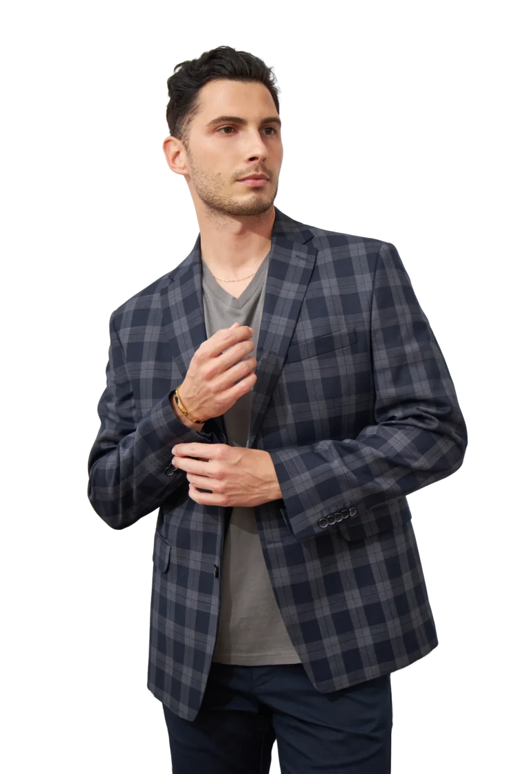 Marynarka w kratę w kolorze granatowo-popielatym. Model lekko dopasowany, marynarka jednorzędowa, proste klapy, dwie kieszenie z patkami plus tradycyjna butonierka, z tyłu dwa rozcięcia. Wyrób utrzymany w stylu Dress Code, świetnie pasuje do wielu stylizacji.
