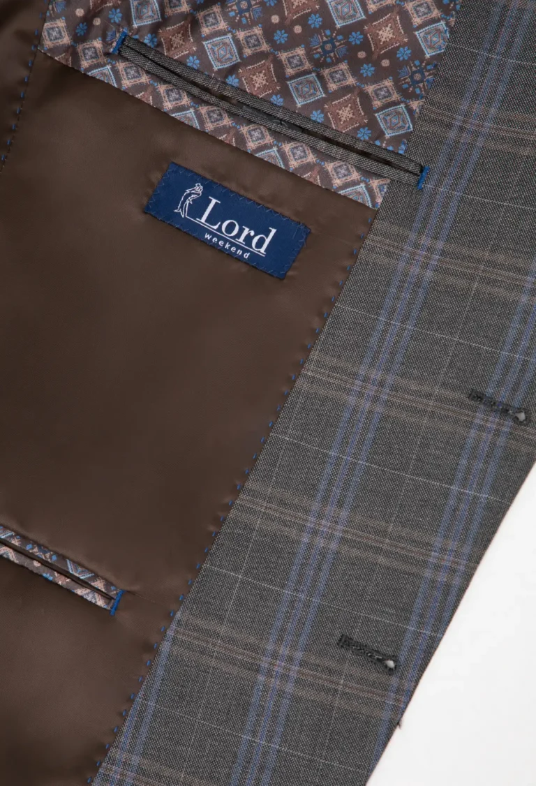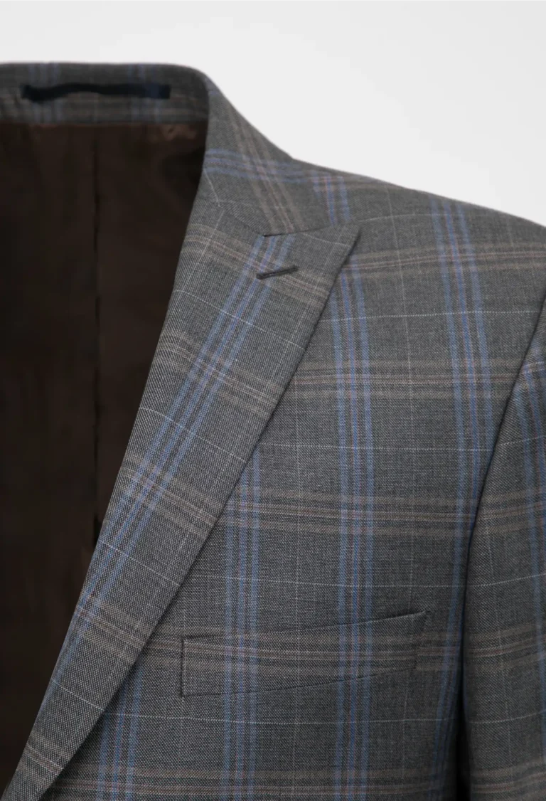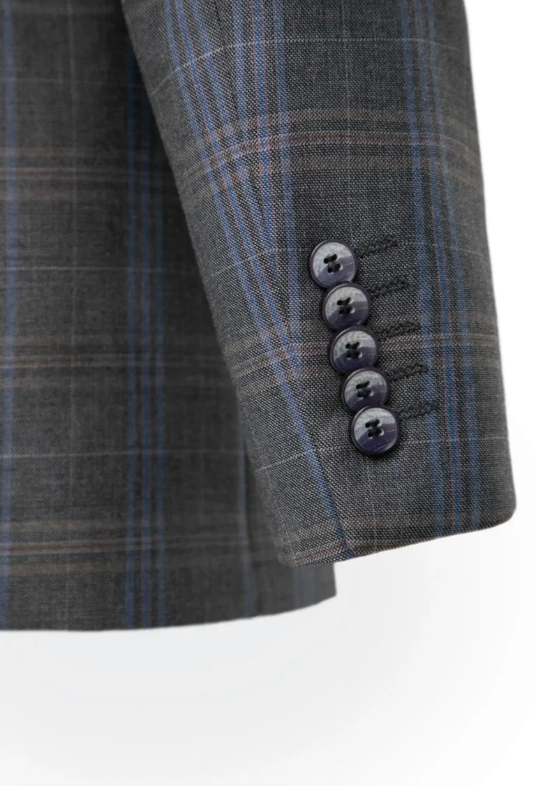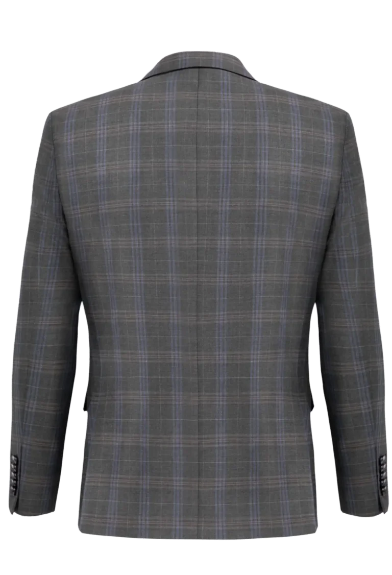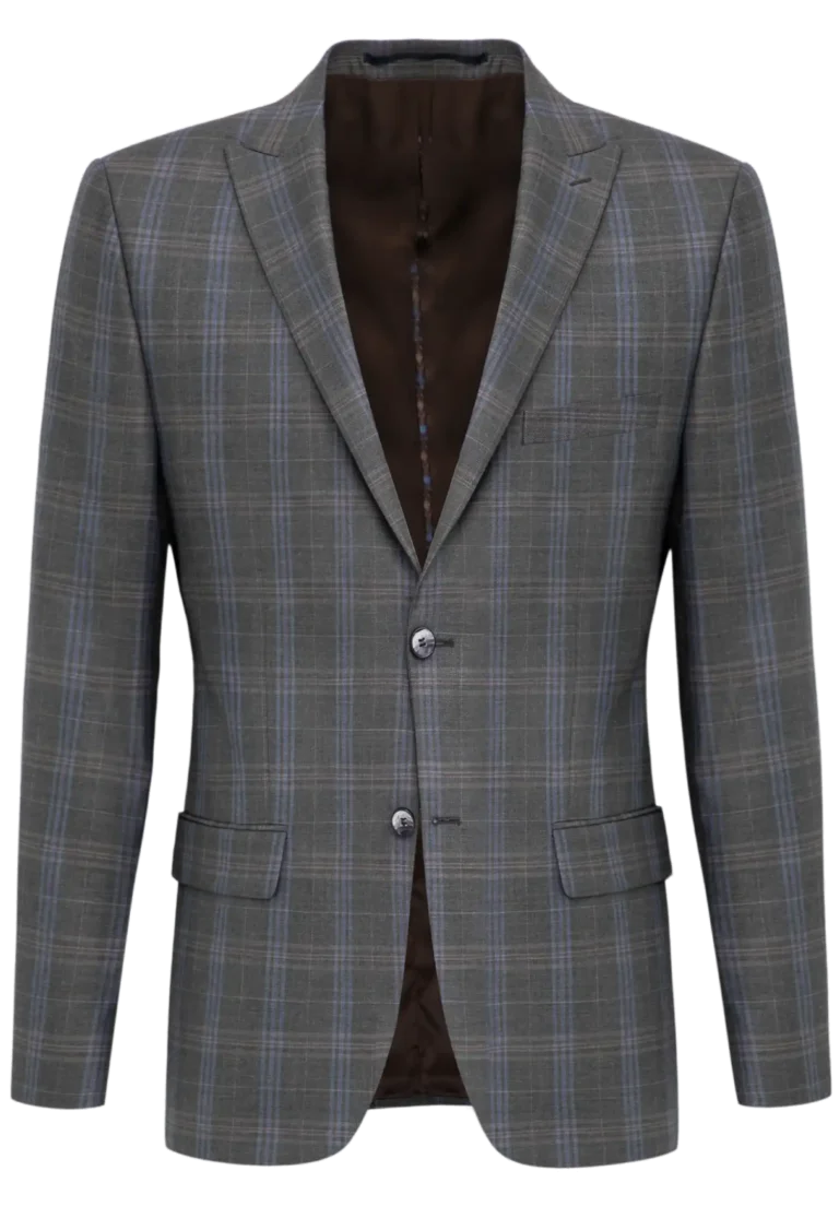 Klasyczna marynarka popielata w delikatną beżowo-niebieską kratę. Marynarka całoroczna idealnie wpasowuje się w obecne trendy w modzie.