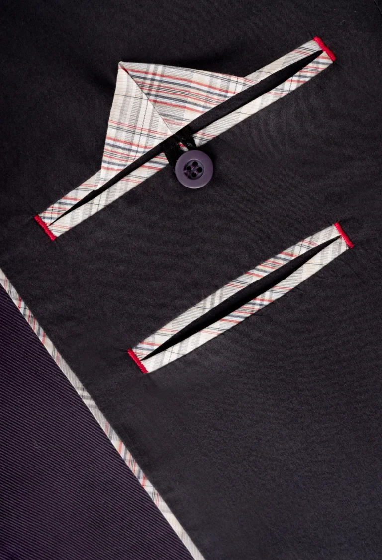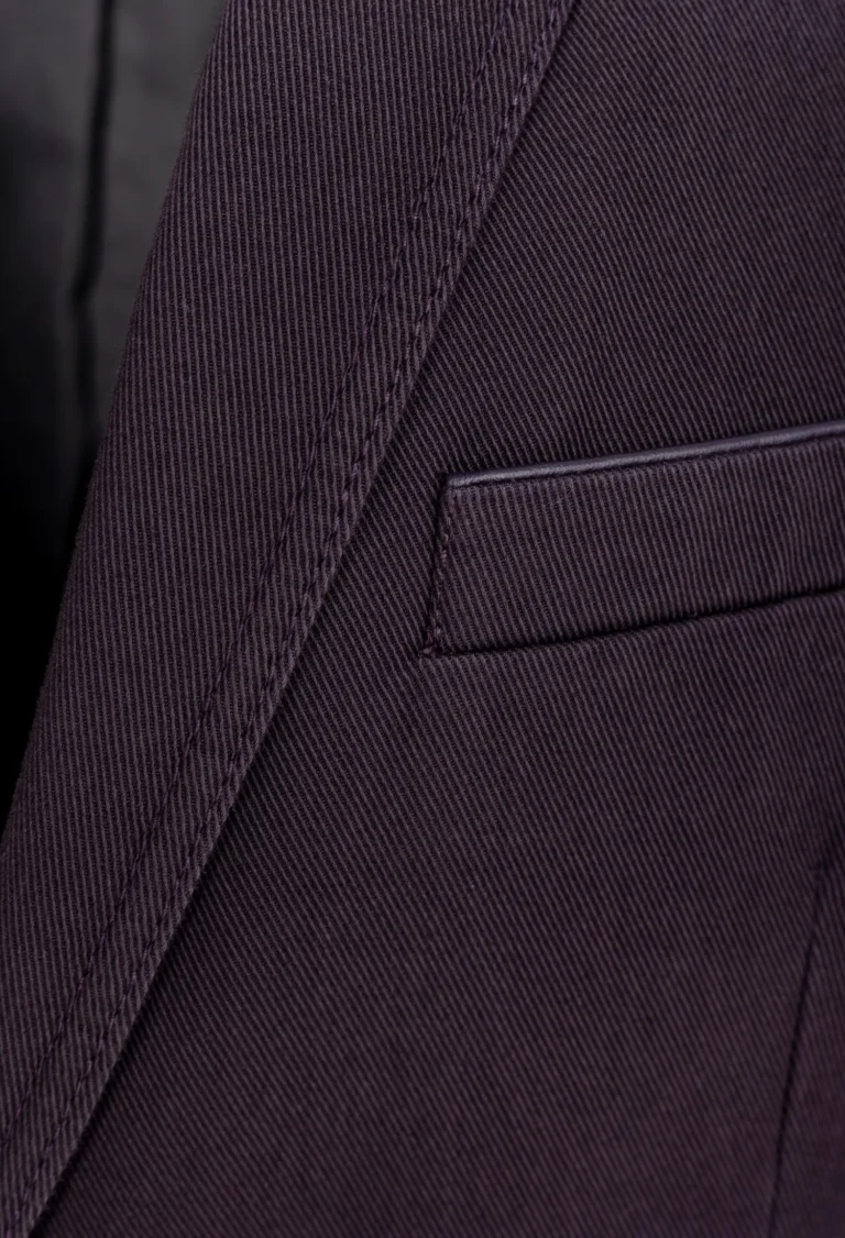 Marynarka w kolorze śliwkowym, bawełniana, może być całoroczna. Kieszenie naszywane, małe kieszonki wykończone lamówką ze skórki.