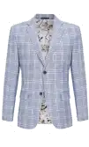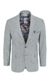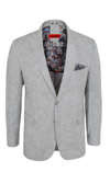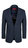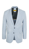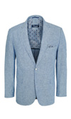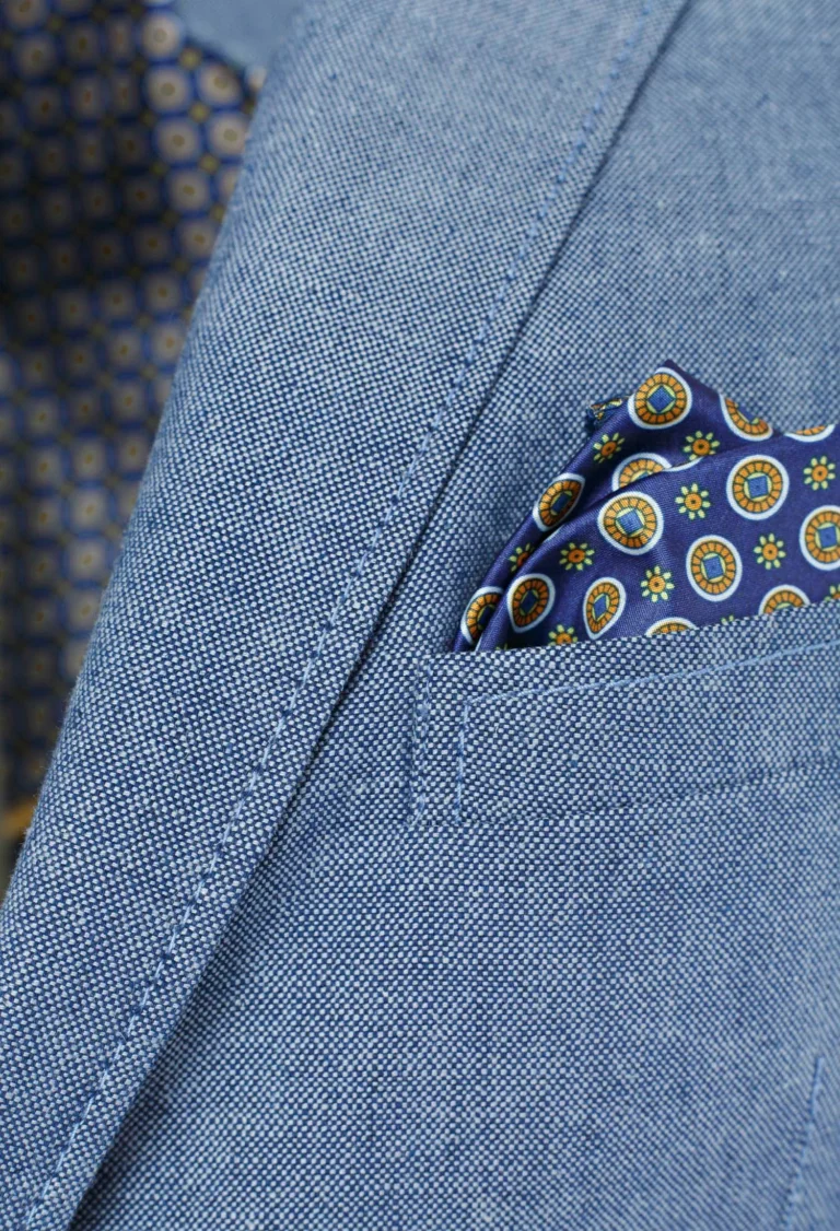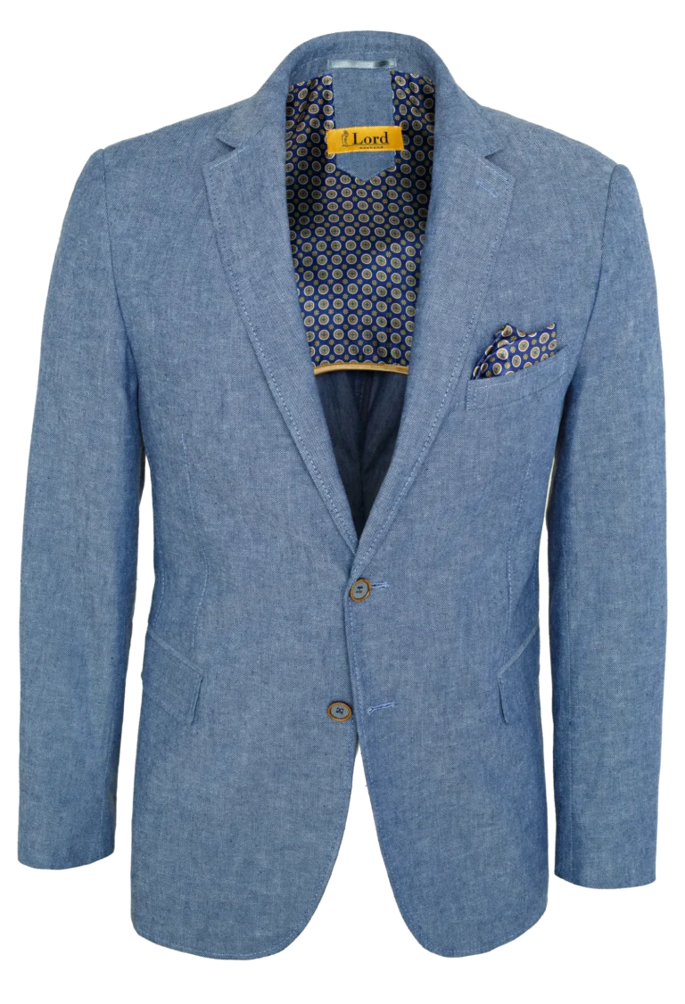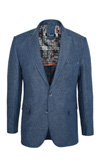 Marynarka sportowa w kolorze niebieskim, wykonana dla mężczyzn ceniących komfort i styl. Model jednorzędowy zapinany na dwa guziki z dwoma rozcięciami z tyłu, klapy proste. Szwy marynarki lamowane, co podkreśla staranne wykonanie. Kołnierz od spodu podszyty kolorowym filcem. Marynarka utrzymana w stylu casualowym, świetnie nadaje się na każdą okazje.