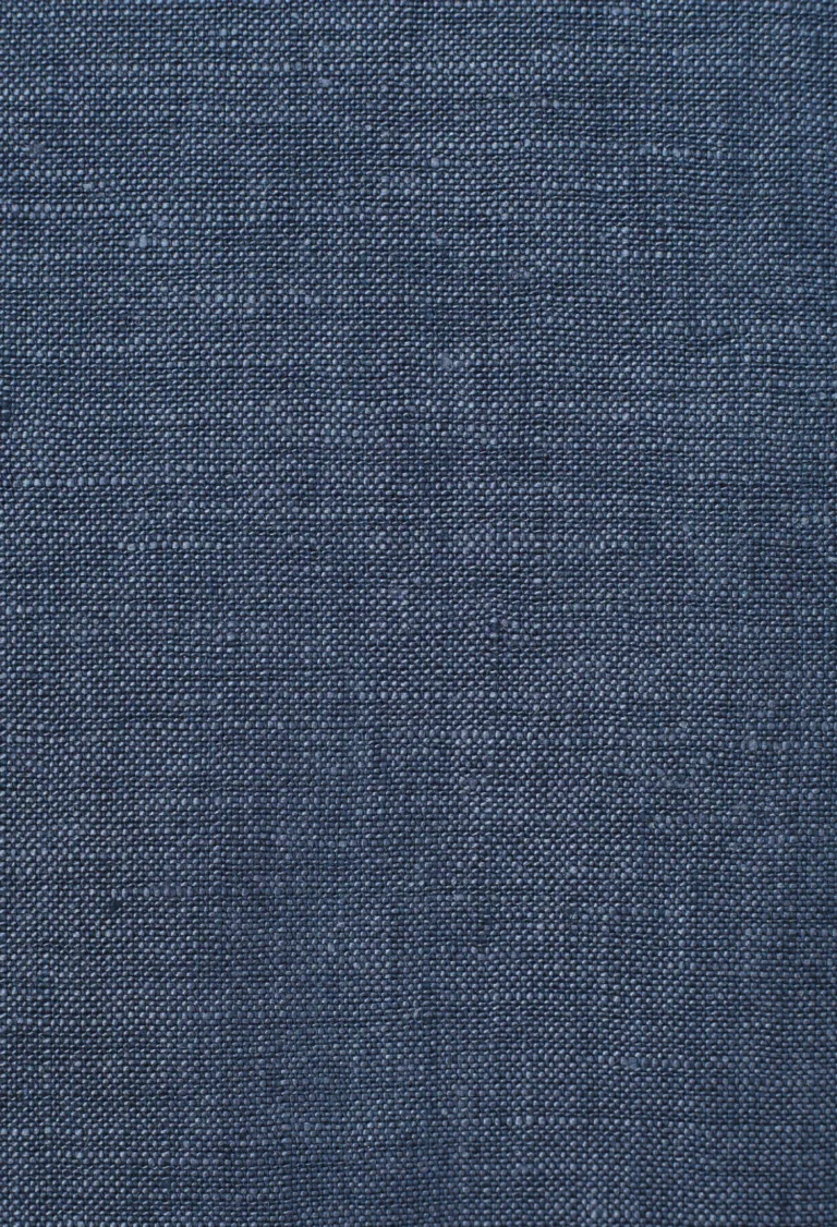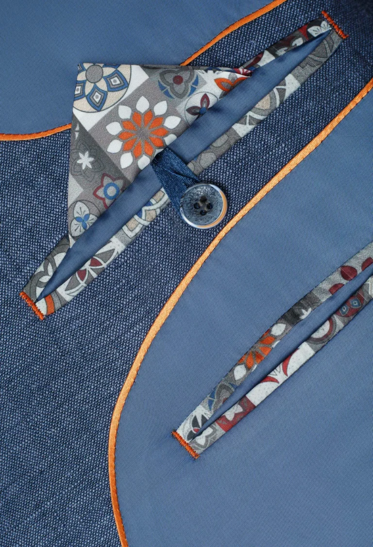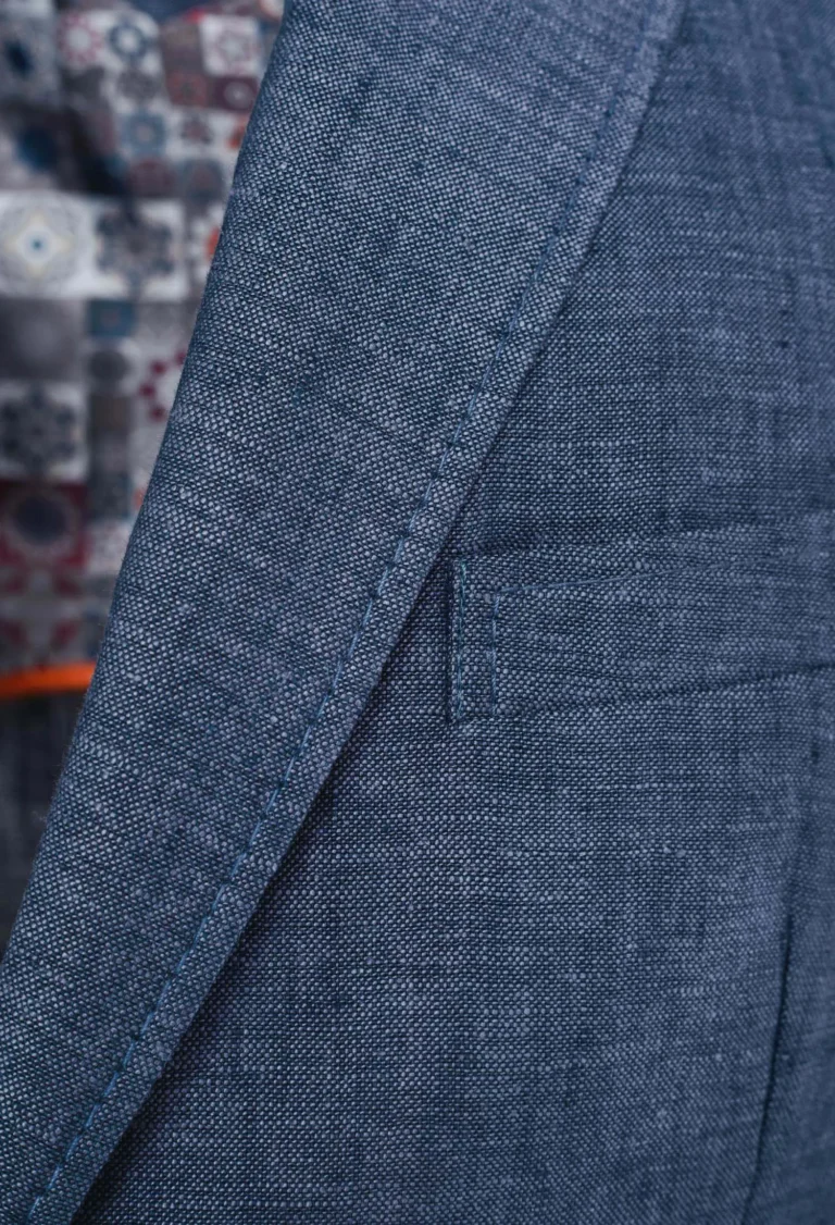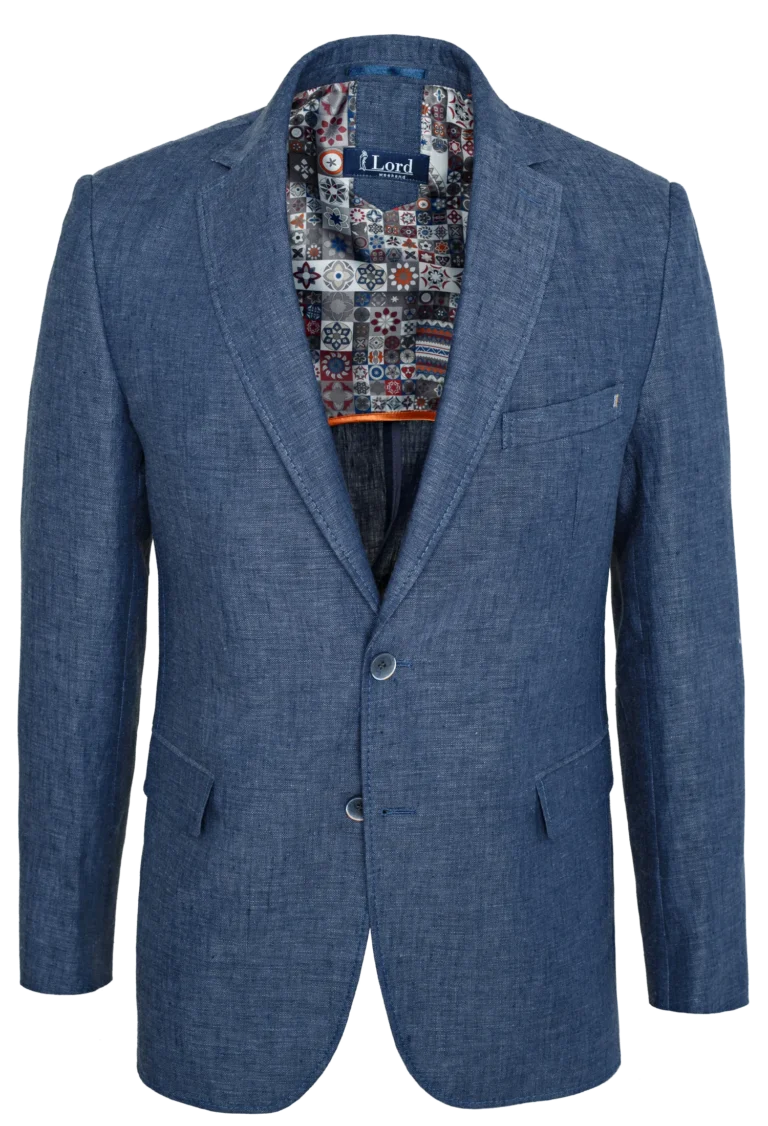 Marynarka męska w kolorze niebieskim, została wykonana z przewiewnego lnu. Proste klapy, zapięcie na dwa guziki, kieszenie z patkami oraz dwa rozcięcia z tyłu, ozdobne stebnowanie. Wykończona kolorową podszewką do połowy pleców z ozdobnymi wypustkami. Uniwersalność koloru sprawia, że łatwo można dobrać do niej dodatki. Jest doskonałym wyborem na lato. Ponadczasowa, zawsze modna.