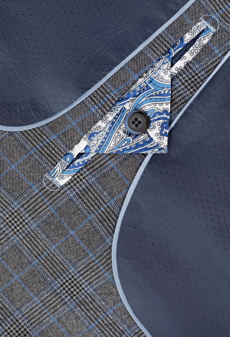 Marynarka całoroczna w kratę, popielato-czarną z ozdobną niebieską nitką. Dostępna w dużych rozmiarach. Tkanina miła w dotyku, miękka, odporna na zagniecenie. Model klasyczny, dopasowany, z dwoma rozcięciami z tyłu świetne pasuje do wielu stylizacji.