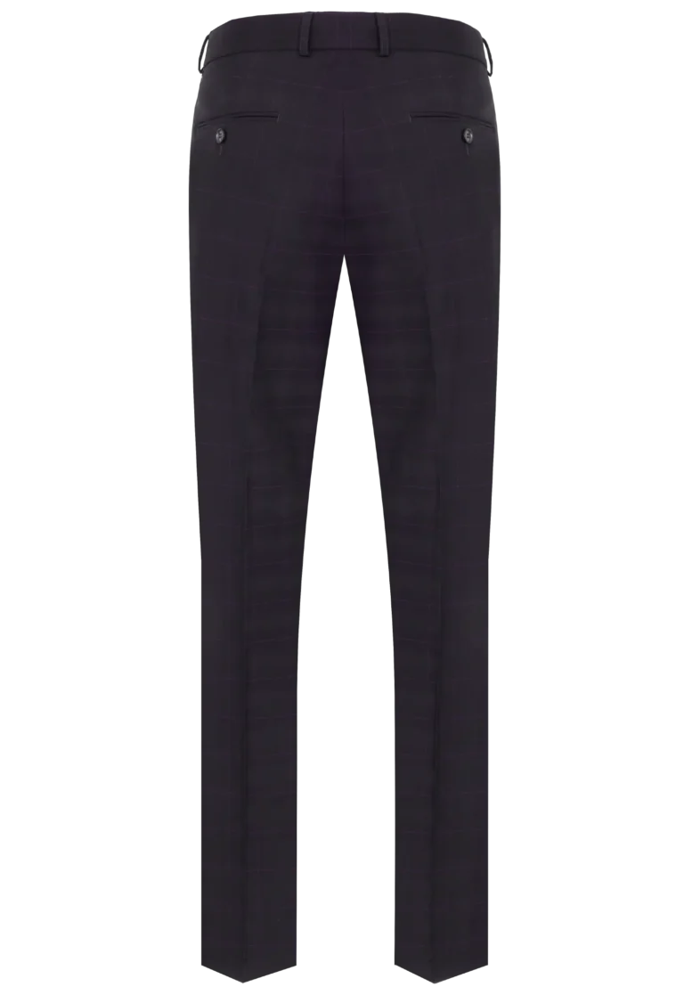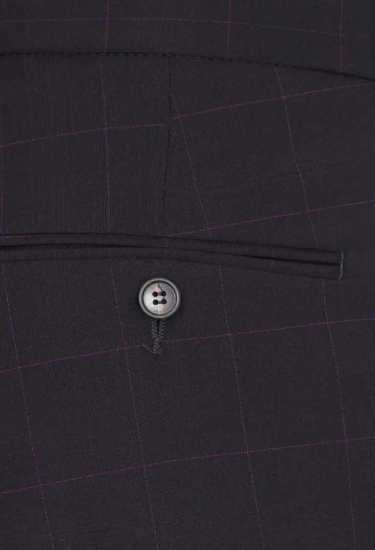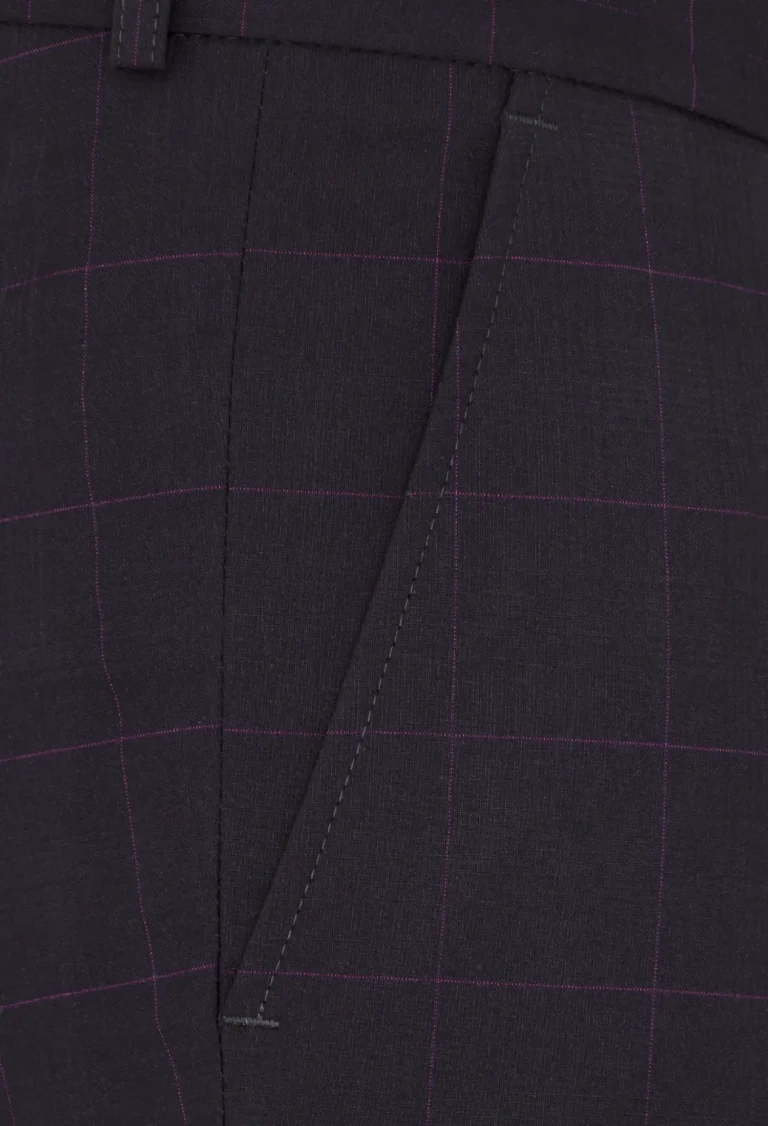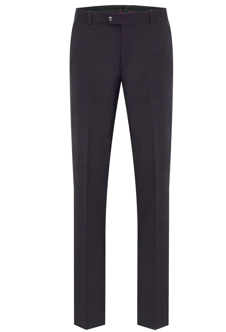 Spodnie klasyczne w kolorze brązowym w kratkę z widoczną bordową nitką. Posiadają w przodzie dwie kieszenie skośne z tyłu dwie kieszenie cięte zapinane na guzik, zaprasowane na kant z kolanówką, pasek z gurtem. Konstrukcja jest wyszczuplona z lekko zwężaną nogawką dołem.