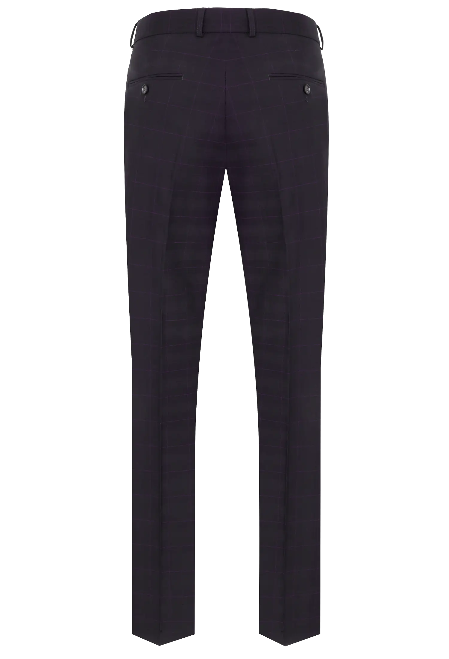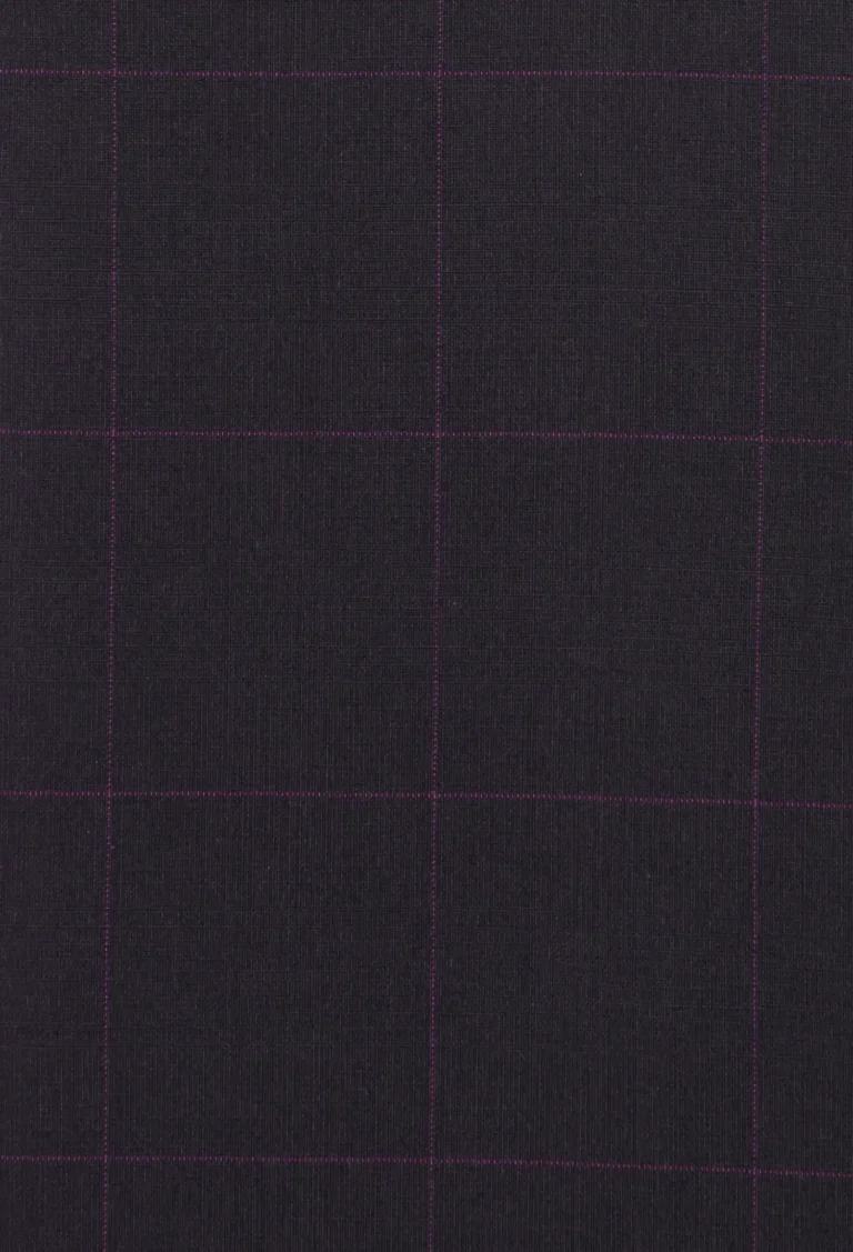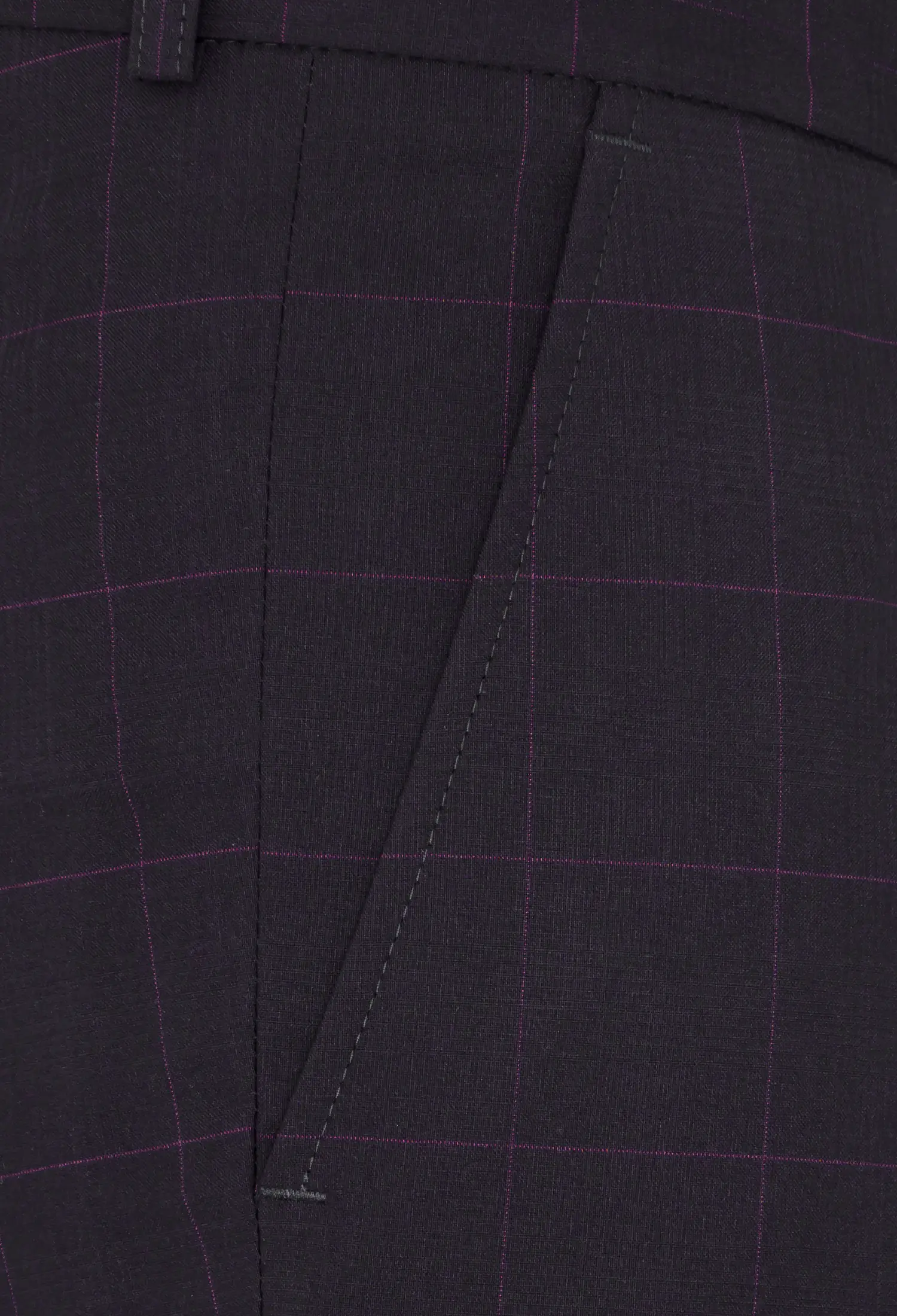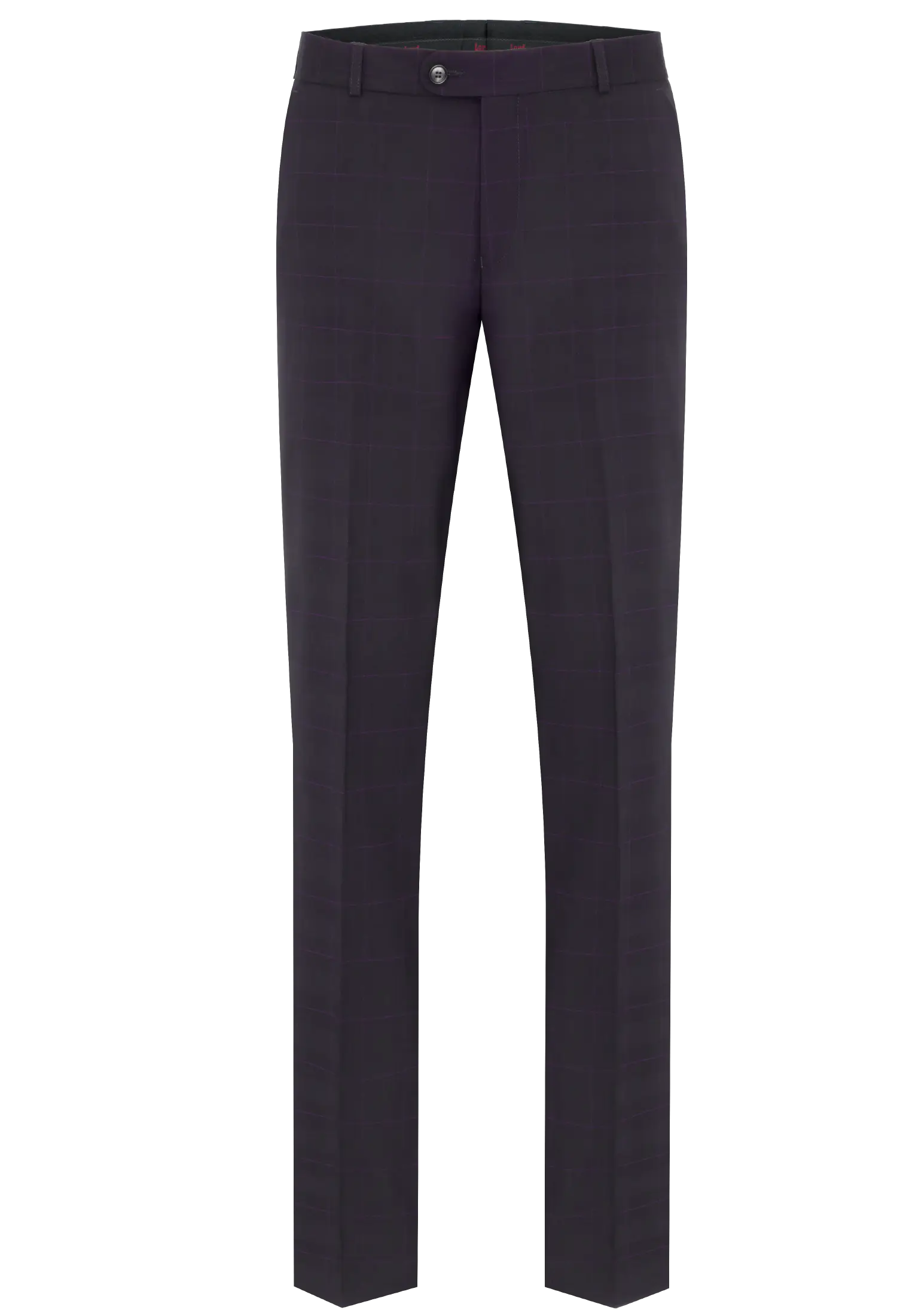 Spodnie klasyczne w kolorze brązowym w kratkę z widoczną bordową nitką. Posiadają w przodzie dwie kieszenie skośne z tyłu dwie kieszenie cięte zapinane na guzik, zaprasowane na kant z kolanówką, pasek z gurtem. Konstrukcja jest wyszczuplona z lekko zwężaną nogawką dołem.