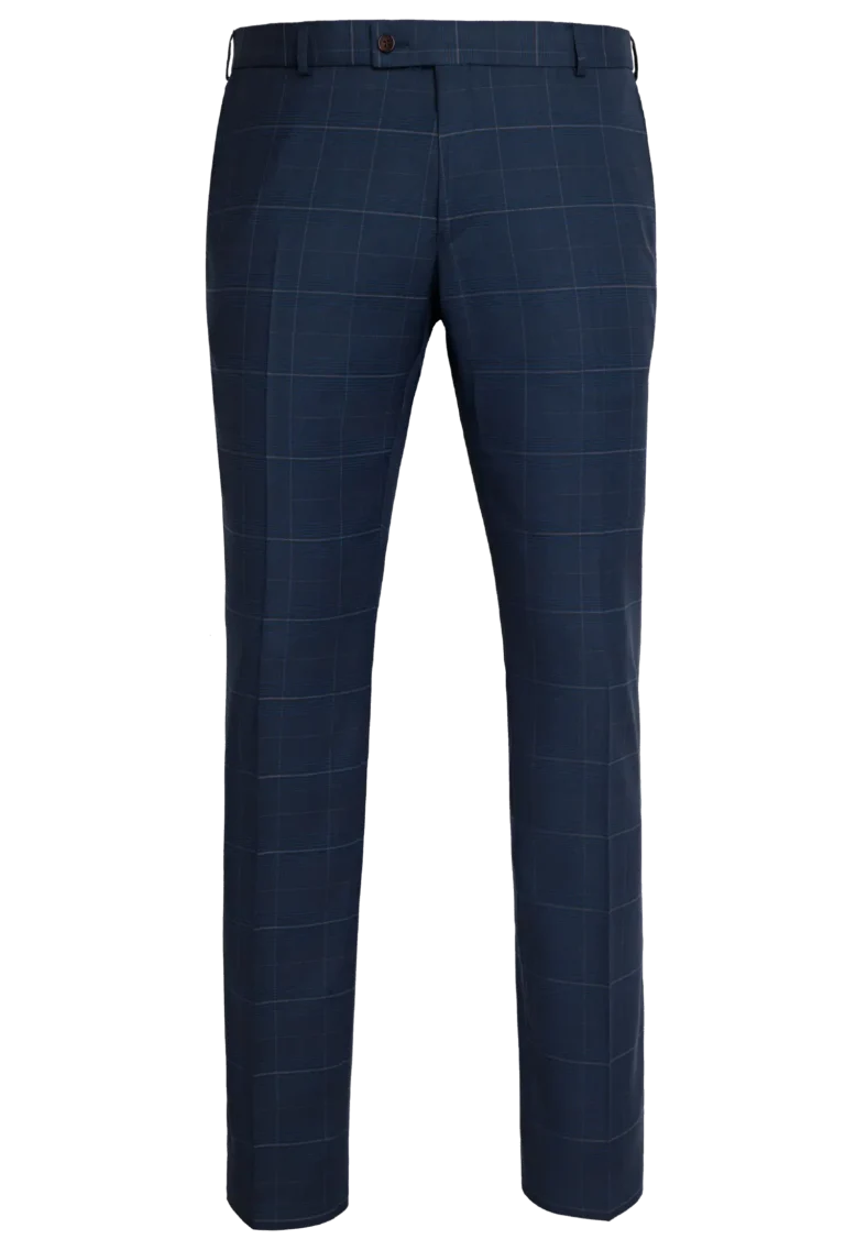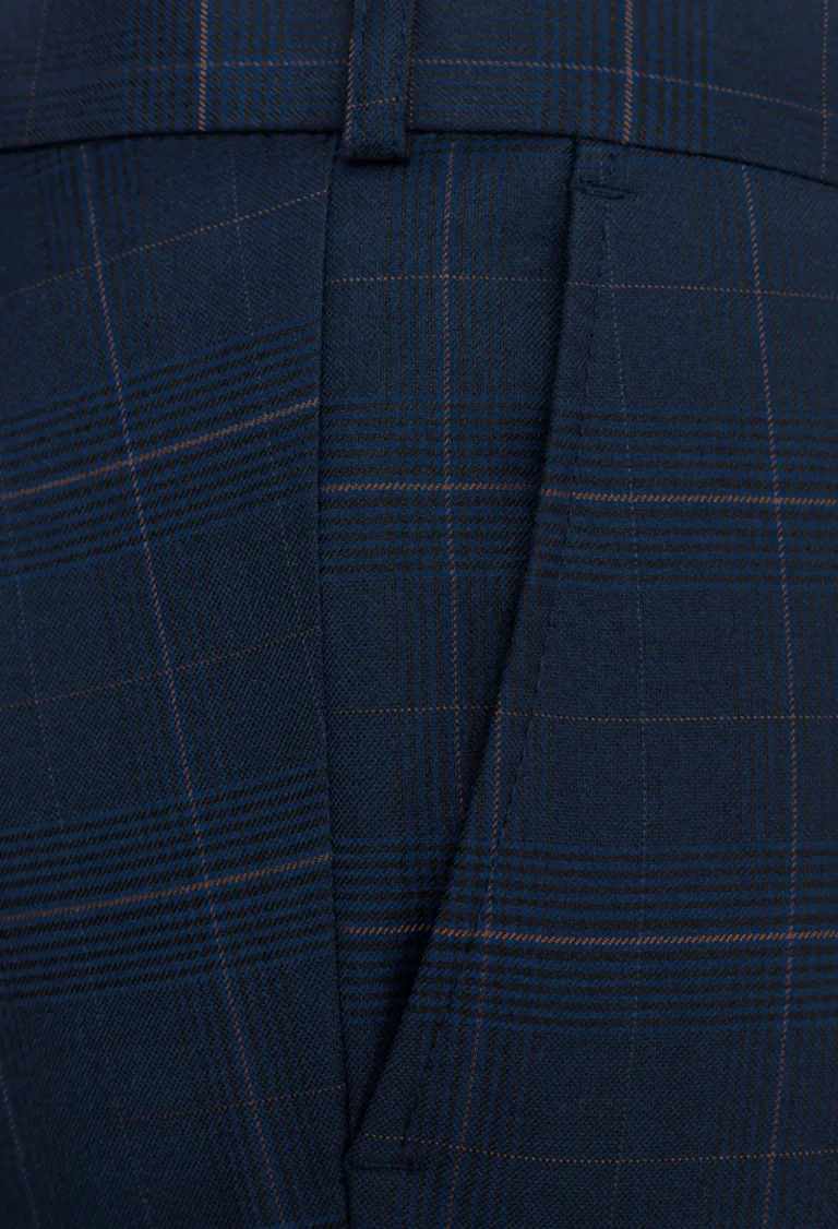 Spodnie klasyczne granatowe w kratkę z delikatną ozdobną nitką w kolorze bordowym. Spodnie z kolanówką, zaprasowane na kant o wyszczuplonym kroju.