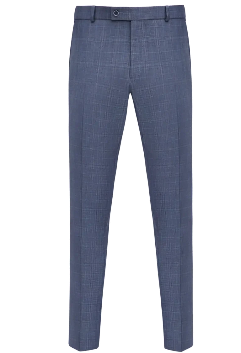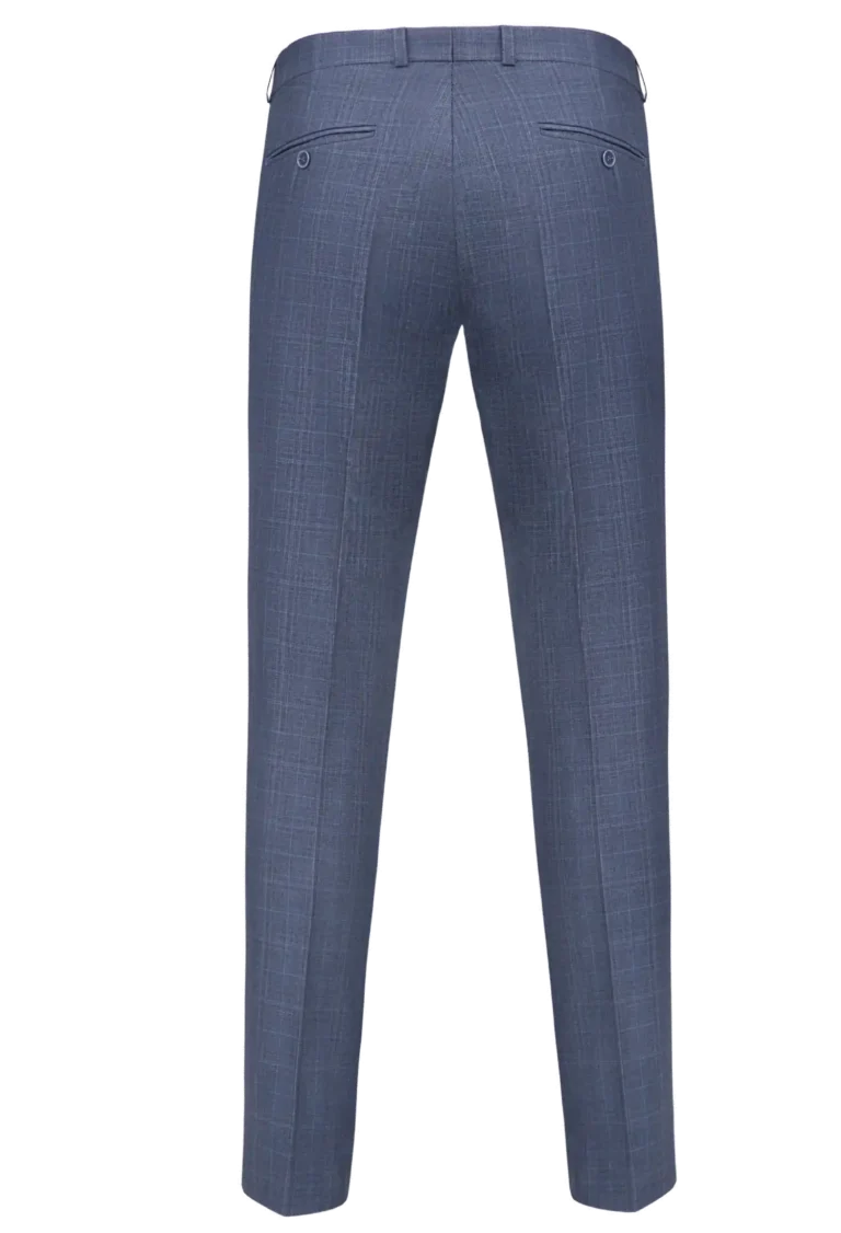 Spodnie klasyczne w kolorze jasno-granatowym w niebieską kratkę, posiadają w przodzie dwie kieszenie skośne z tyłu dwie kieszenie cięte zapinane na guzik, zaprasowane na kant z kolanówką, pasek z gurtem.