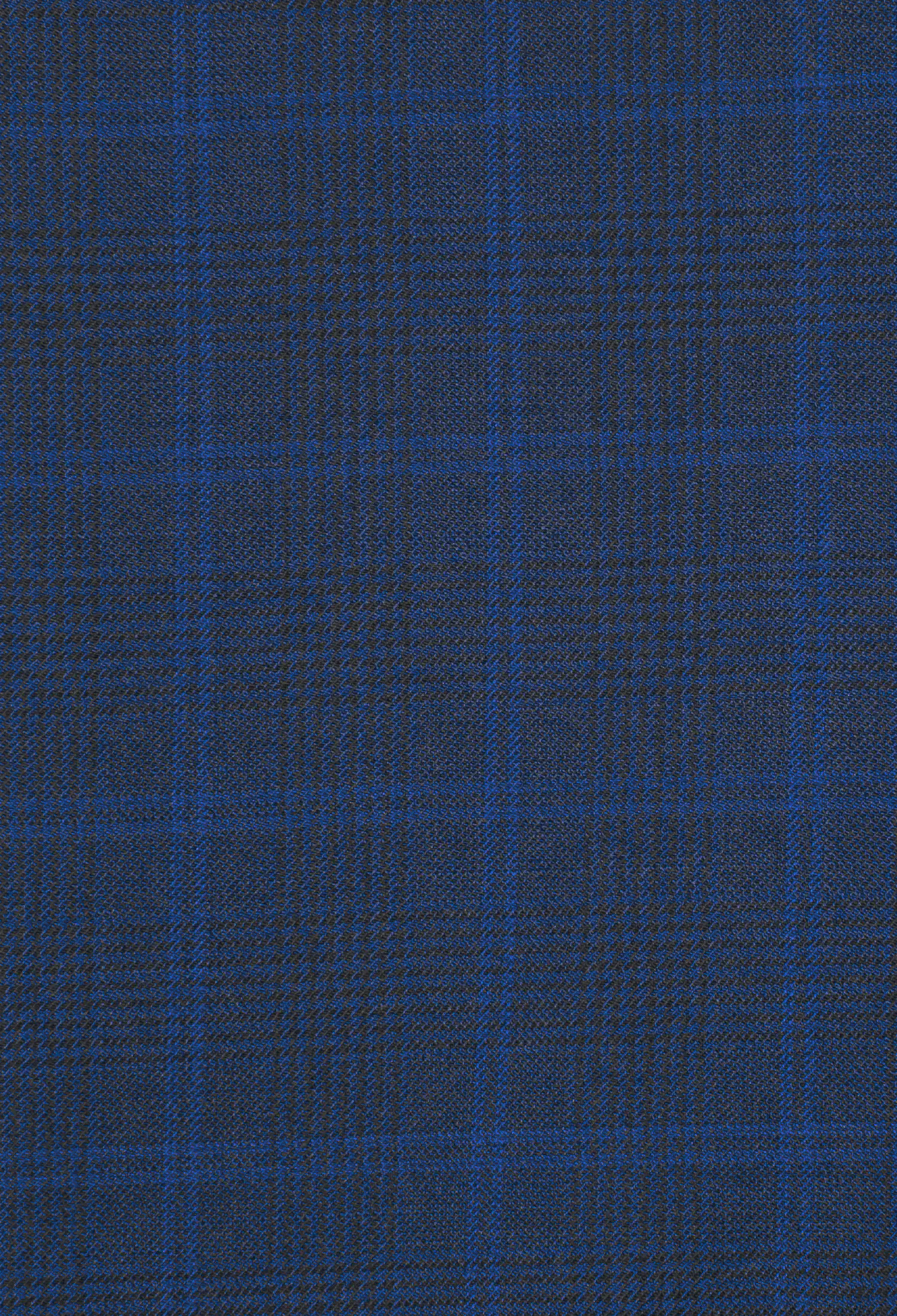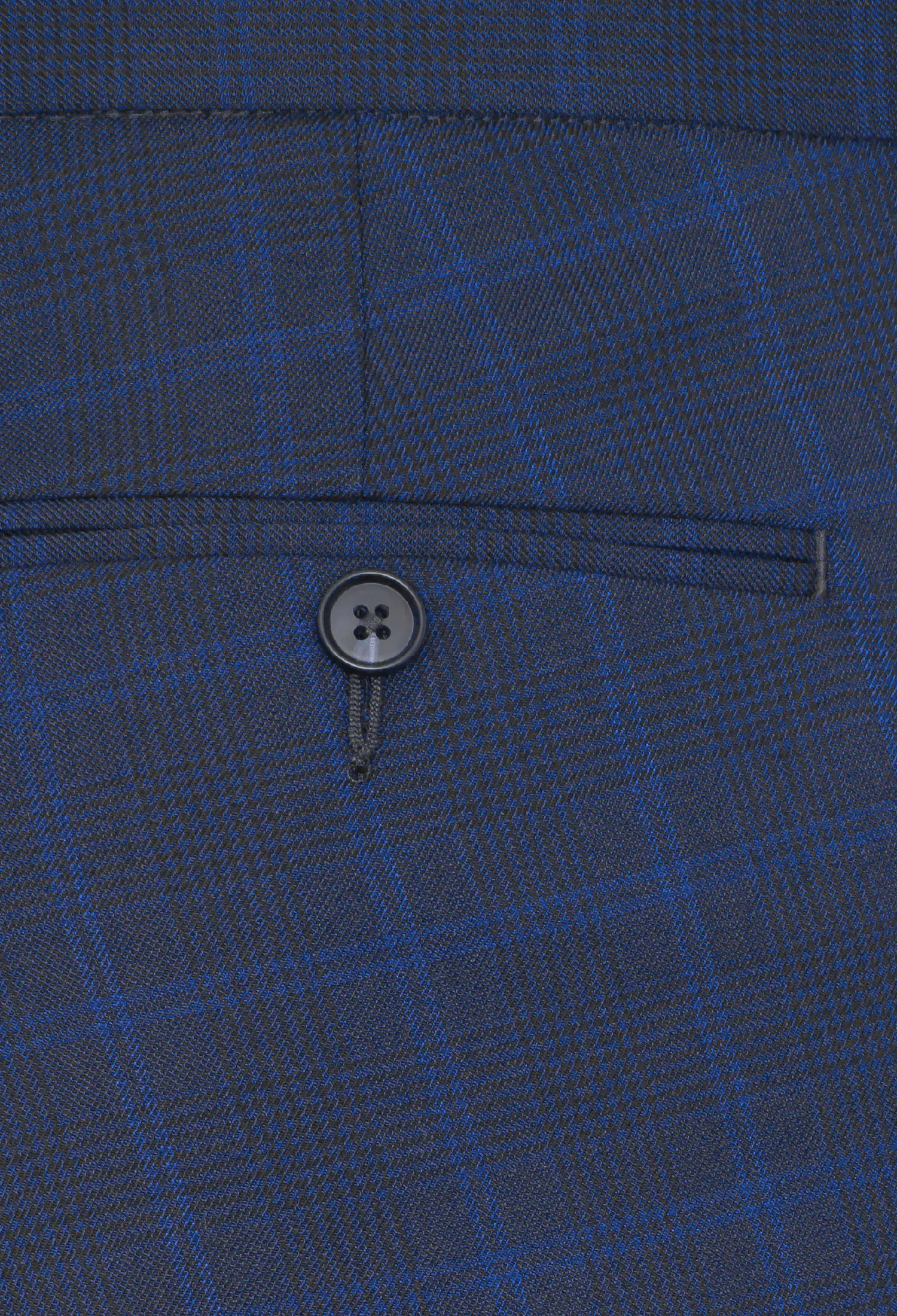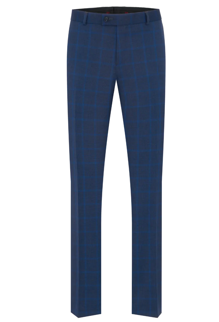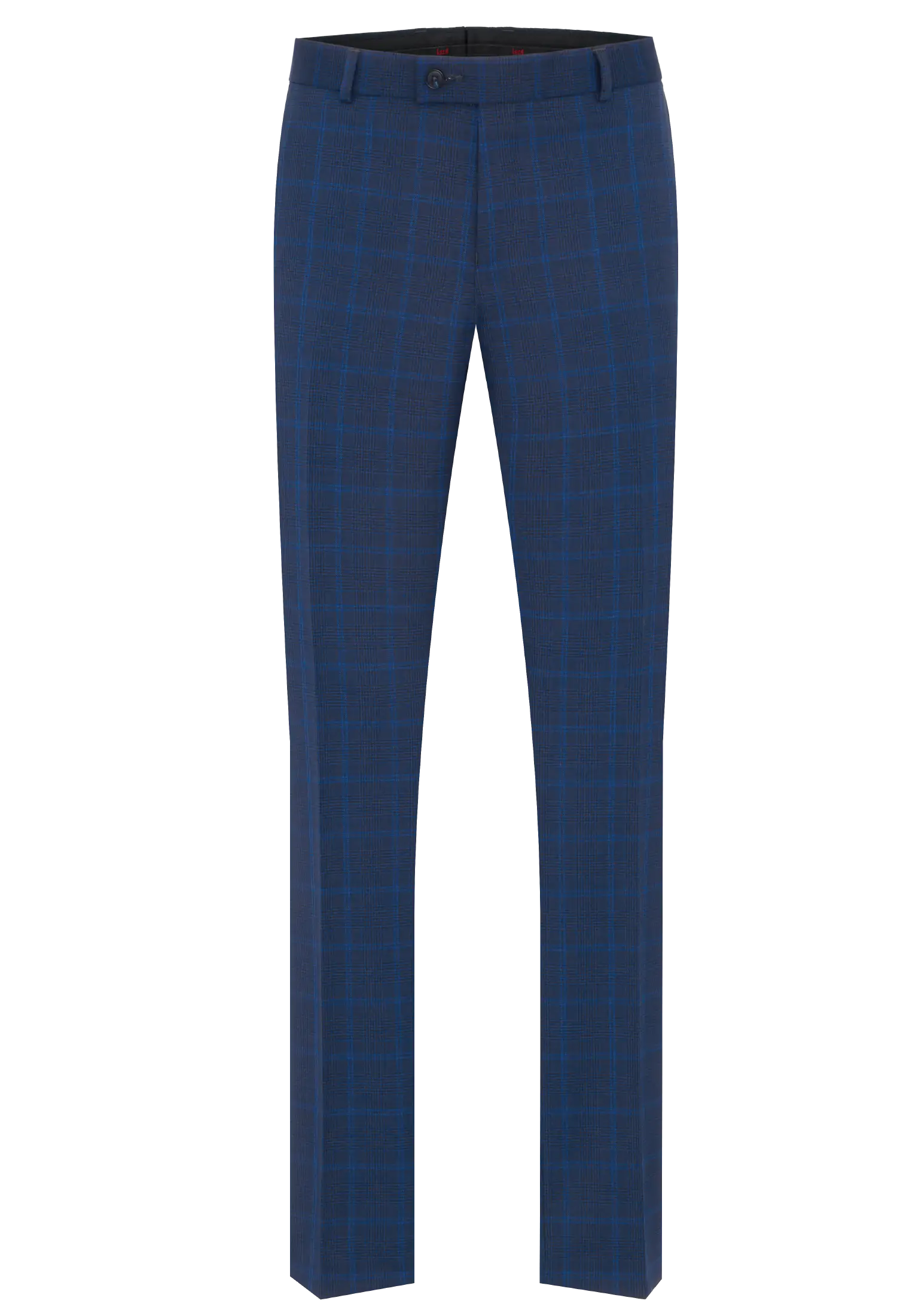Spodnie klasyczne w kolorze granatowym w wyraźną kratkę z widoczną niebieską nitką. Posiadają w przodzie dwie kieszenie skośne z tyłu dwie kieszenie cięte zapinane na guzik, zaprasowane na kant z kolanówką, pasek z gurtem. Konstrukcja jest wyszczuplona z lekko zwężaną nogawką dołem.