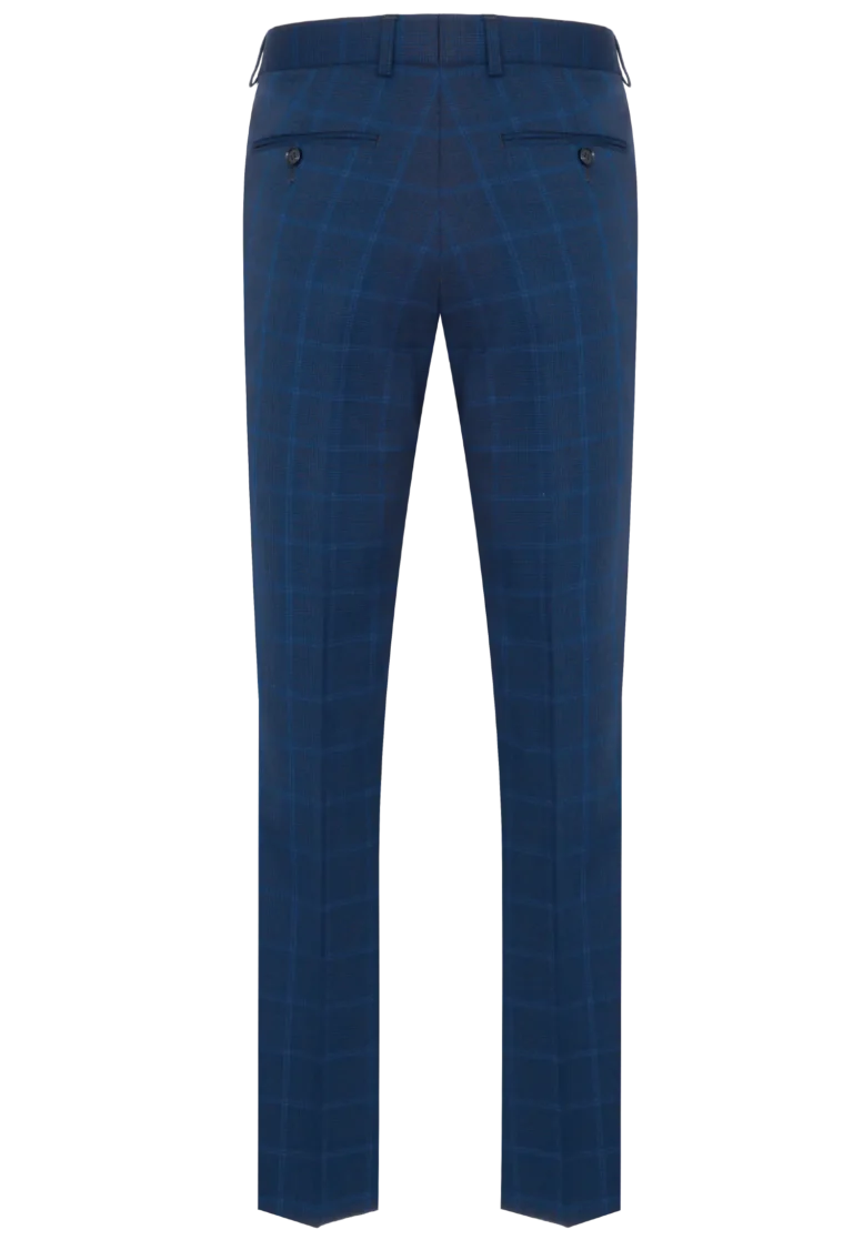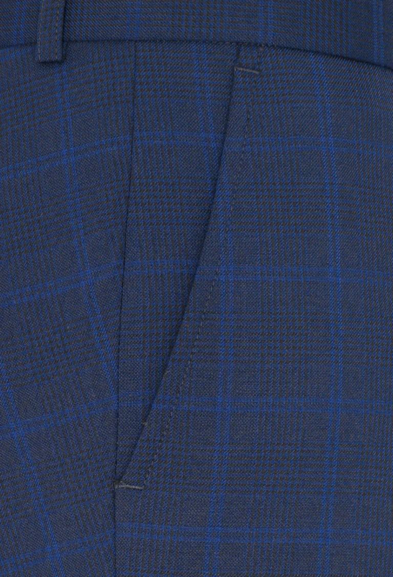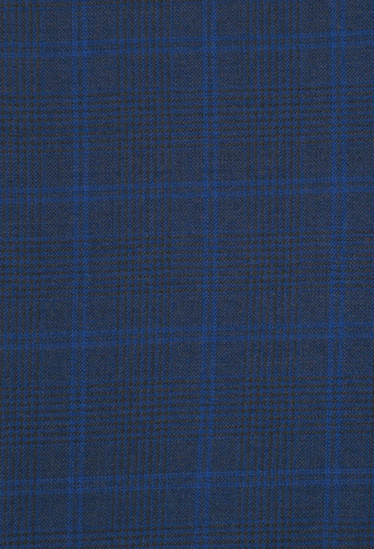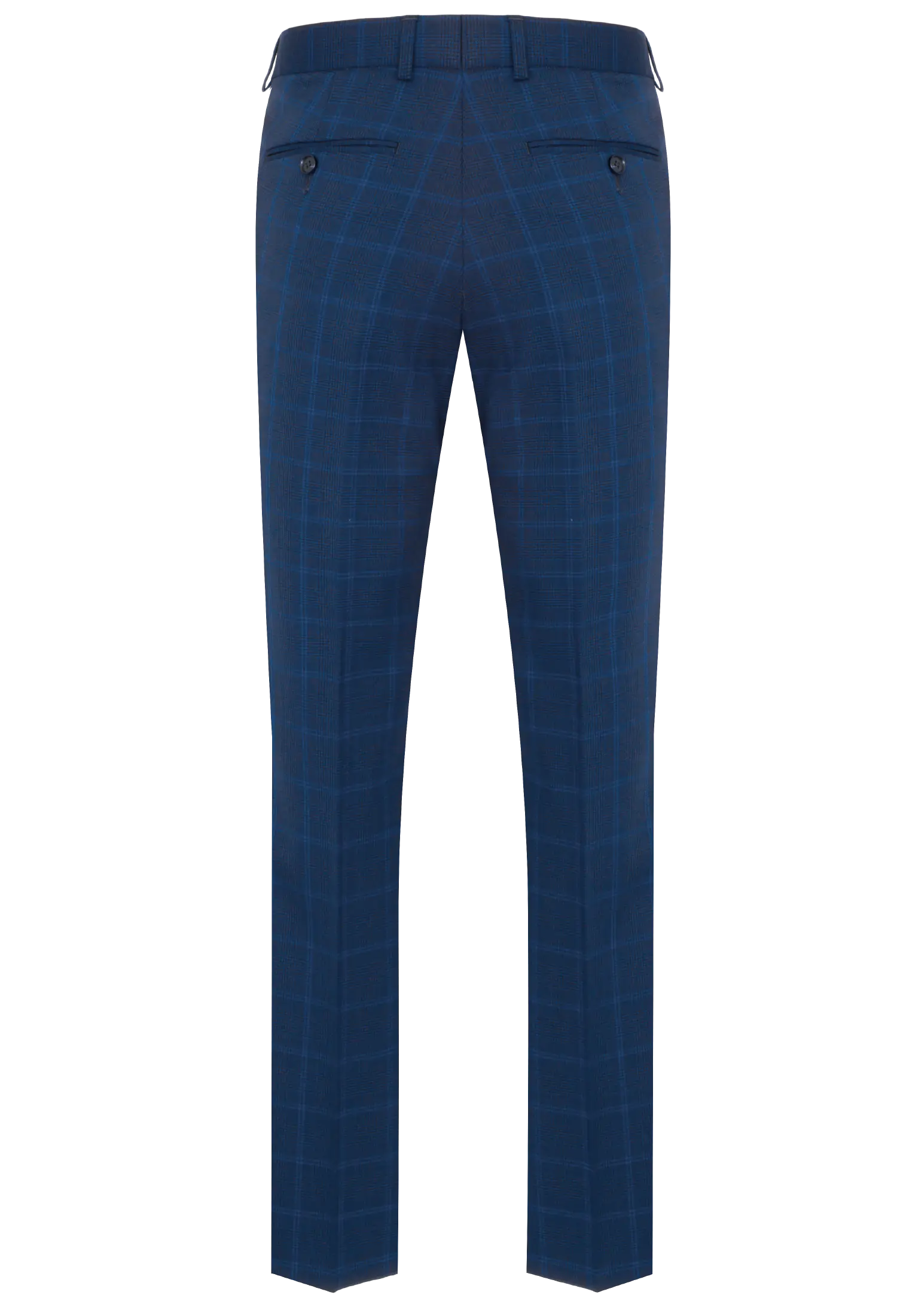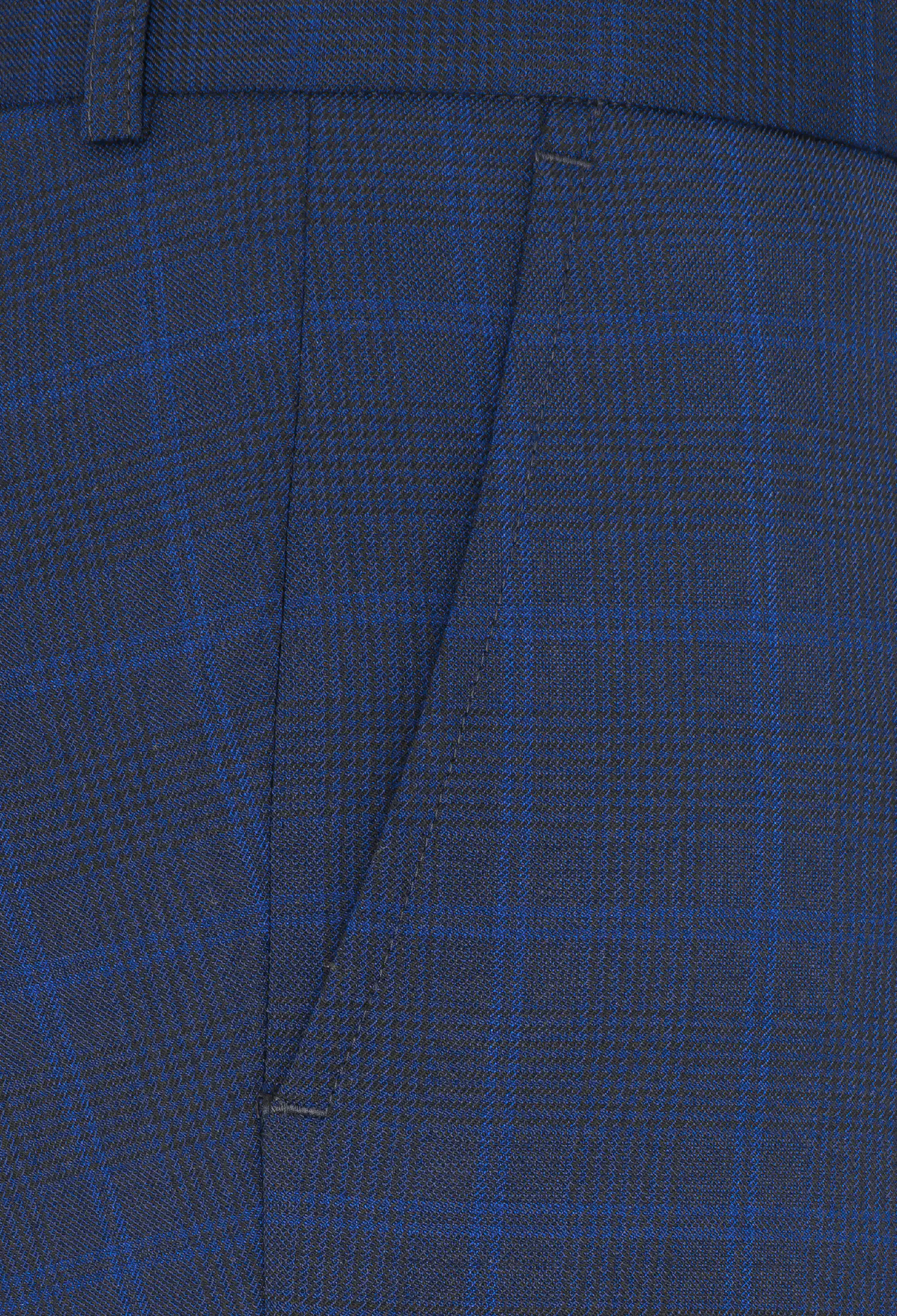 Spodnie klasyczne w kolorze granatowym w wyraźną kratkę z widoczną niebieską nitką. Posiadają w przodzie dwie kieszenie skośne z tyłu dwie kieszenie cięte zapinane na guzik, zaprasowane na kant z kolanówką, pasek z gurtem. Konstrukcja jest wyszczuplona z lekko zwężaną nogawką dołem.