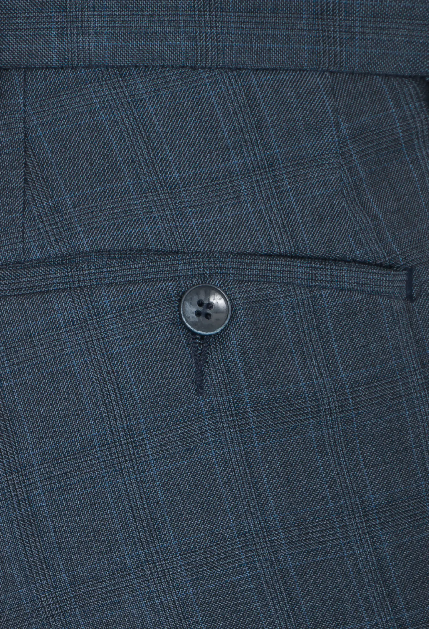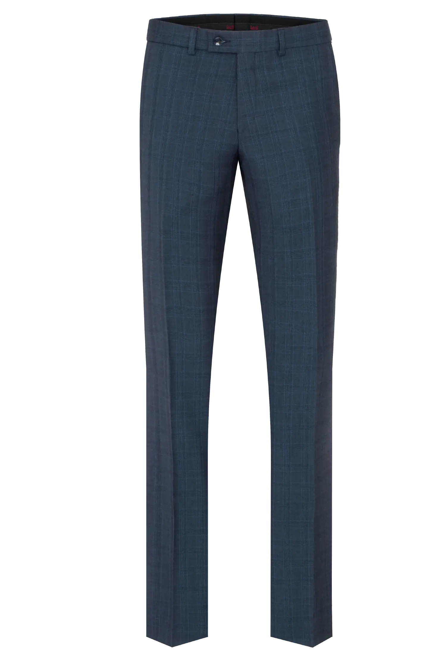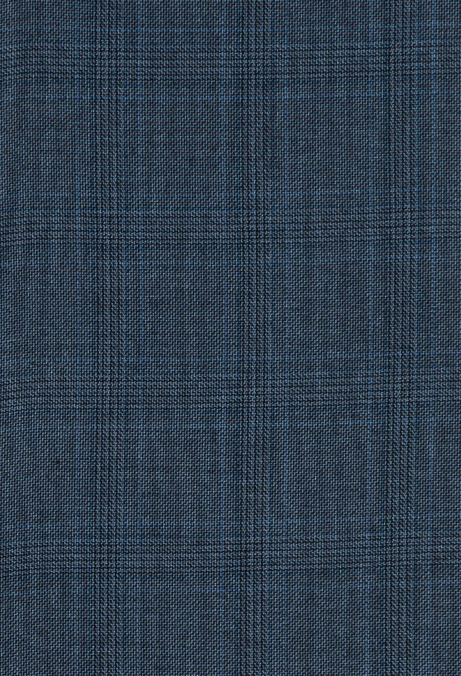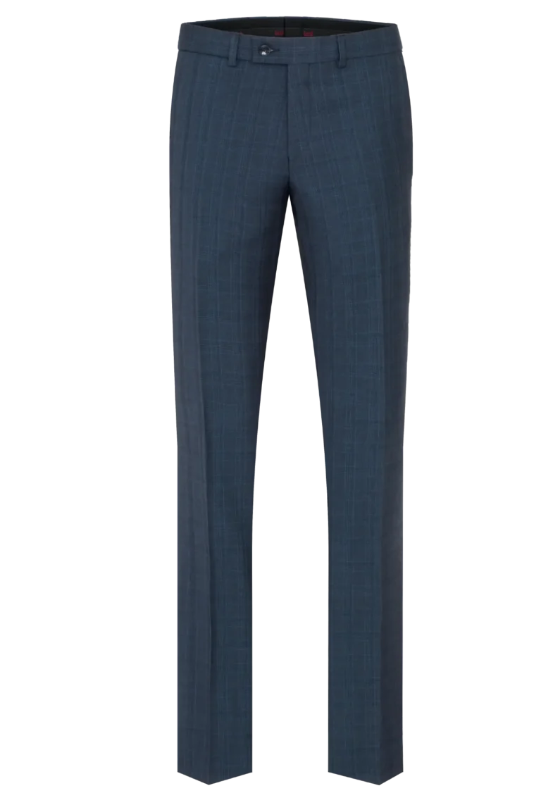 Spodnie klasyczne w kolorze granatowo-niebieskim w bardzo delikatną kratkę z widocznymi nitkami w kolorze czarnym i niebieskim. Spodnie z kolanówką, zaprasowane na kant, pasek z gurtem. Konstrukcja jest wyszczuplona z lekko zwężaną nogawką dołem.