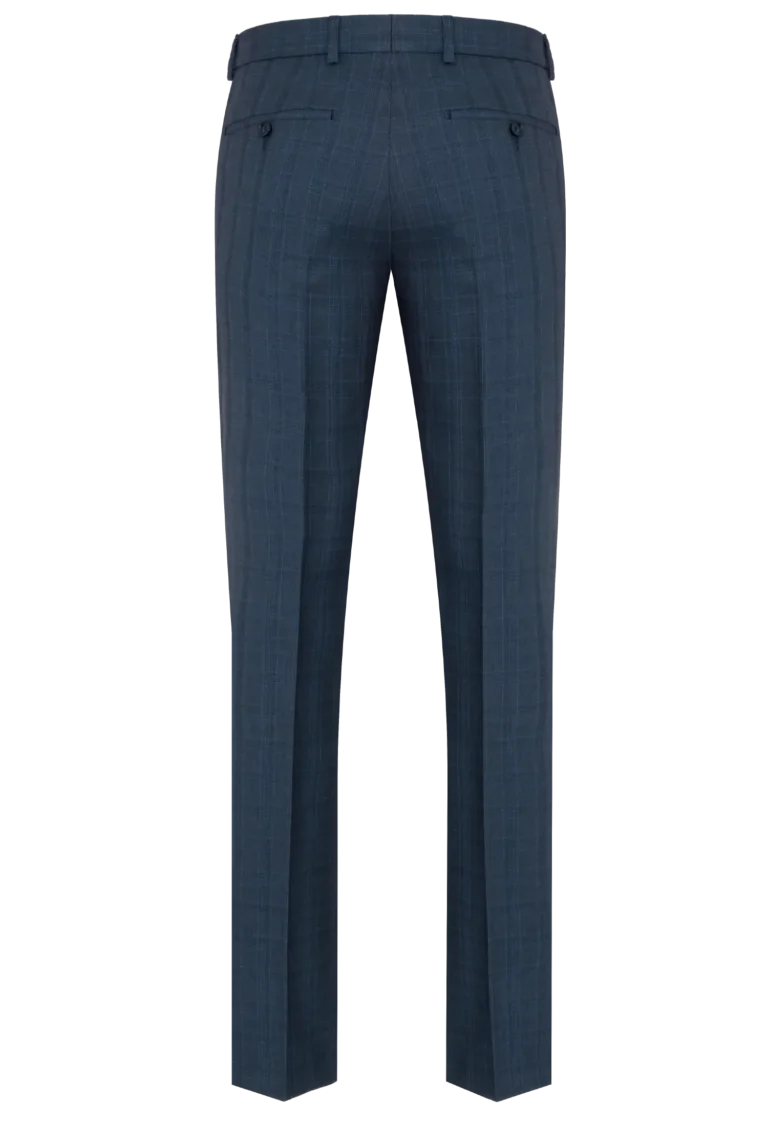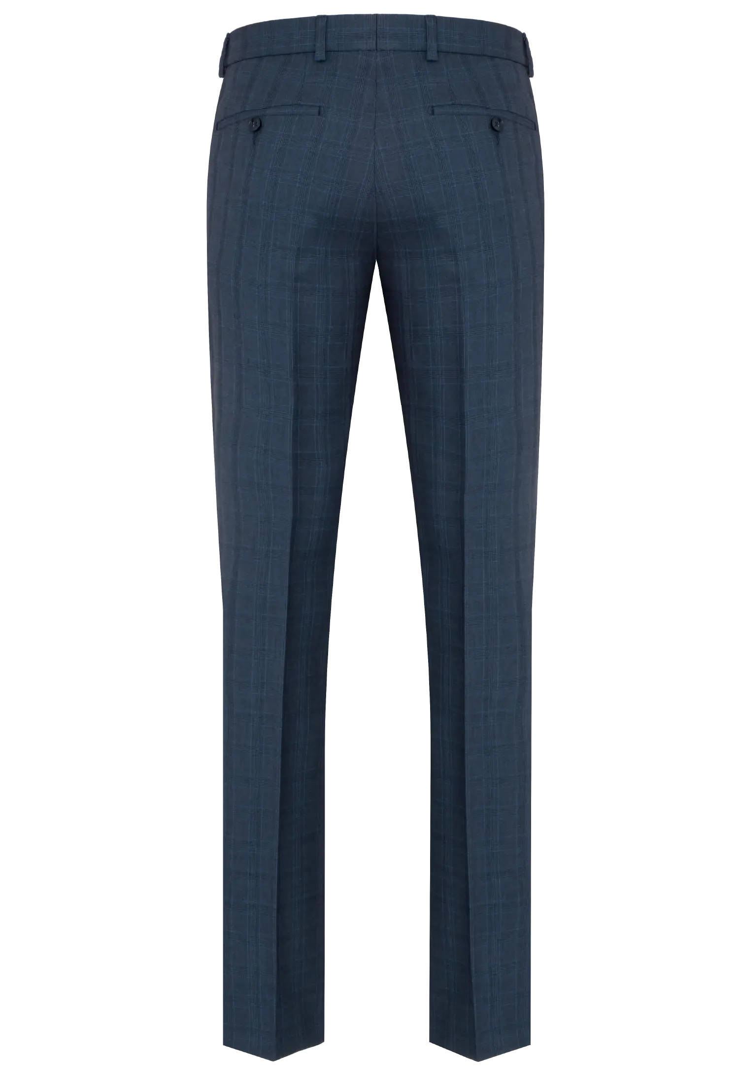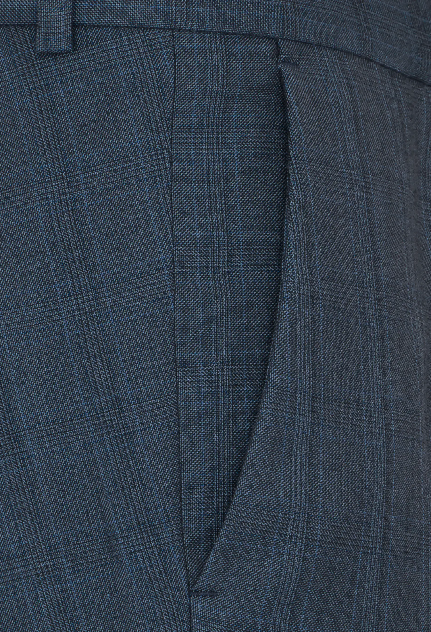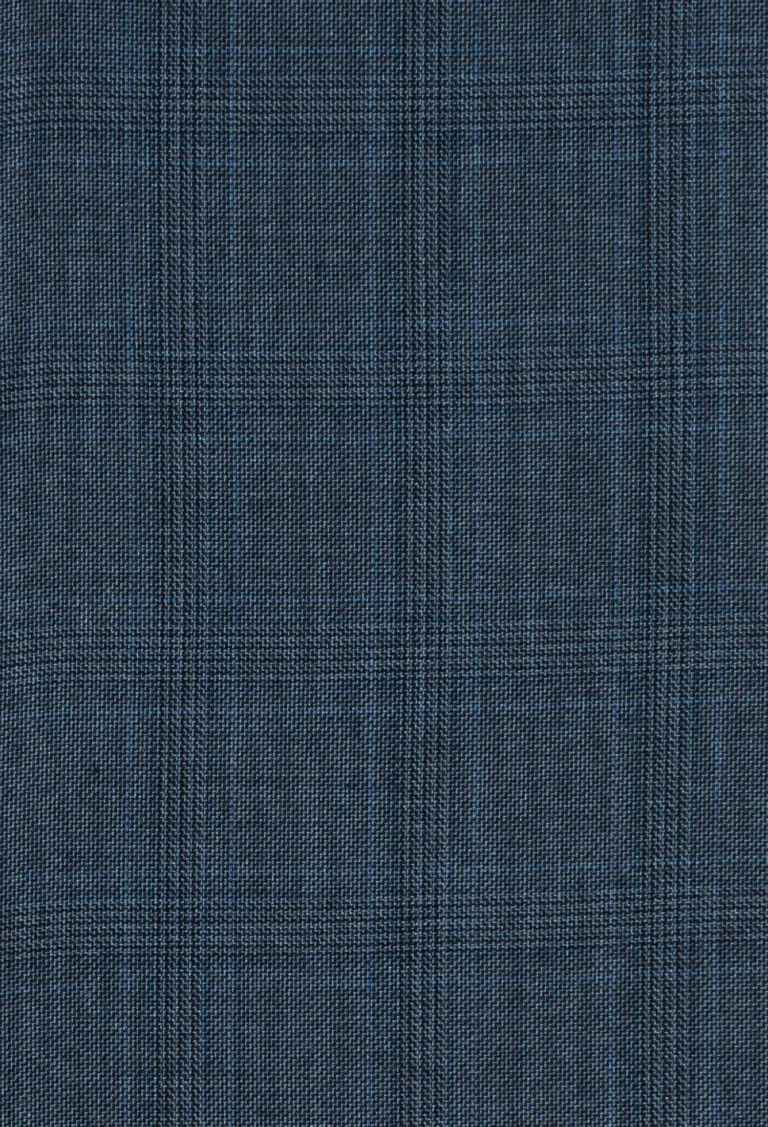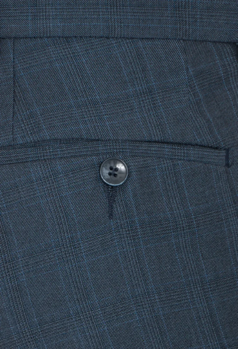 Spodnie klasyczne w kolorze granatowo-niebieskim w bardzo delikatną kratkę z widocznymi nitkami w kolorze czarnym i niebieskim. Spodnie z kolanówką, zaprasowane na kant, pasek z gurtem. Konstrukcja jest wyszczuplona z lekko zwężaną nogawką dołem.