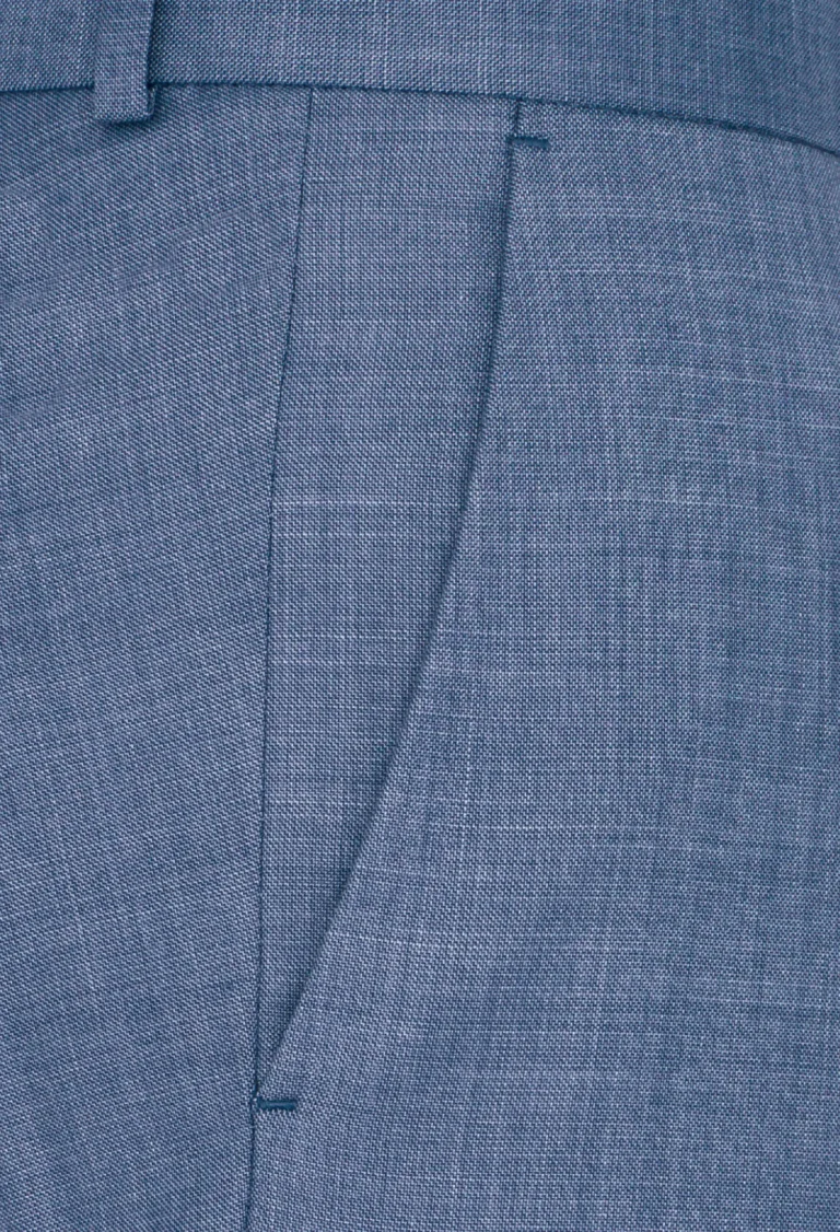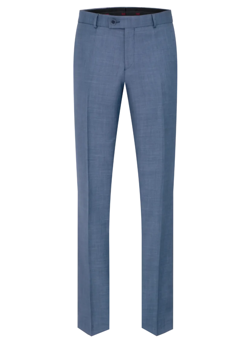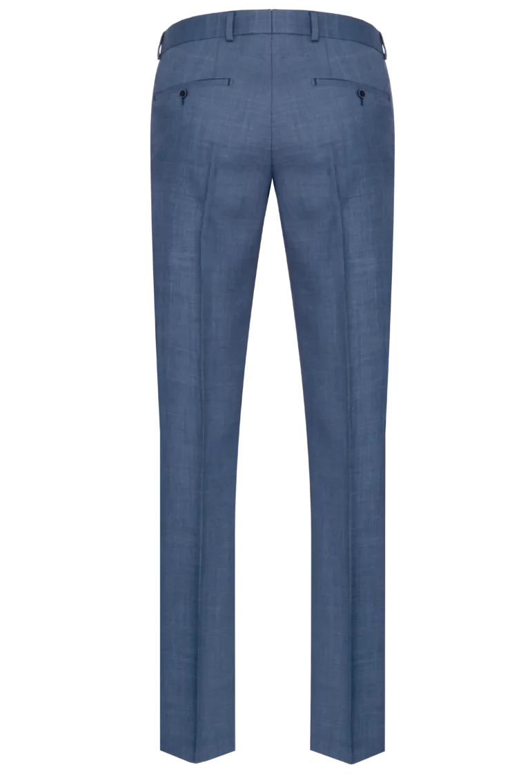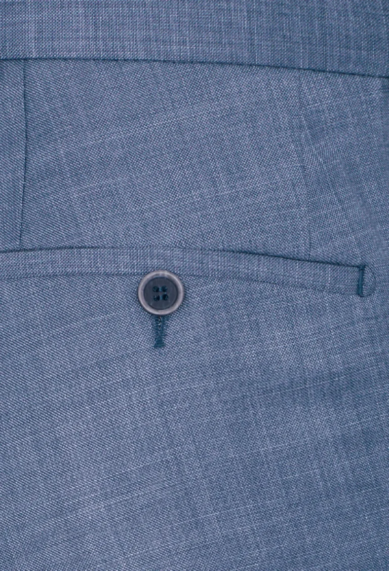 Klasyczne spodnie garniturowe w kolorze niebieskim. Posiadają w przodzie dwie kieszenie skośne, z tyłu dwie kieszenie zapinane na guzik, zaprasowane na kant z kolanówką, pasek