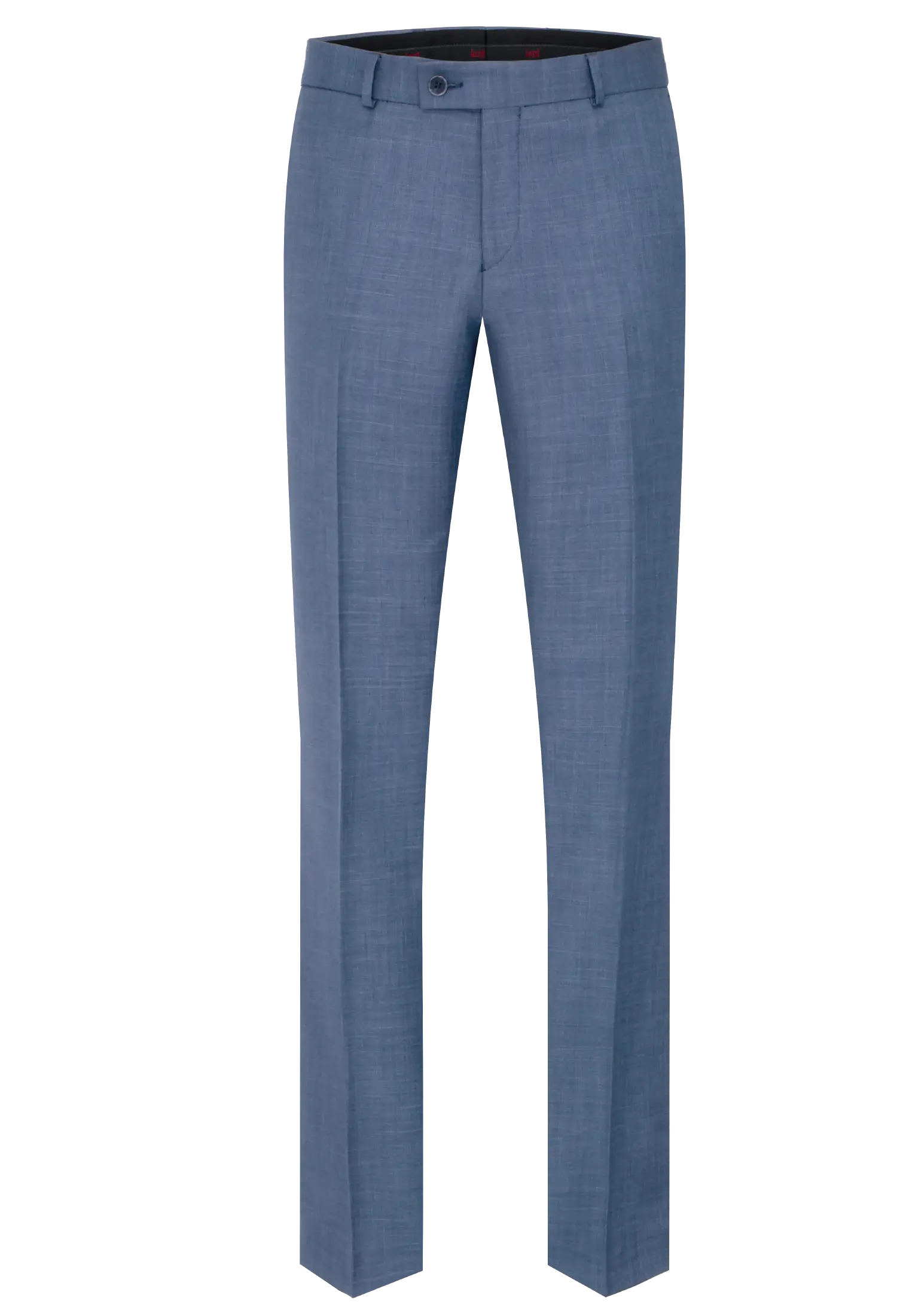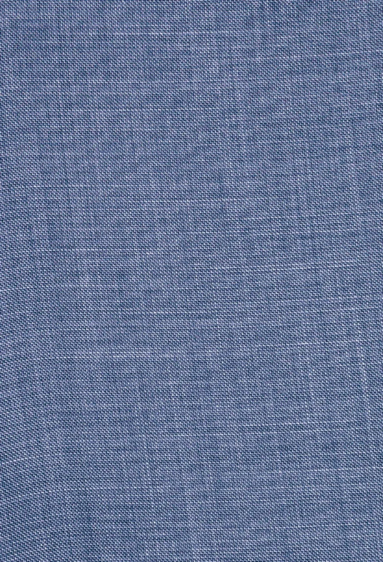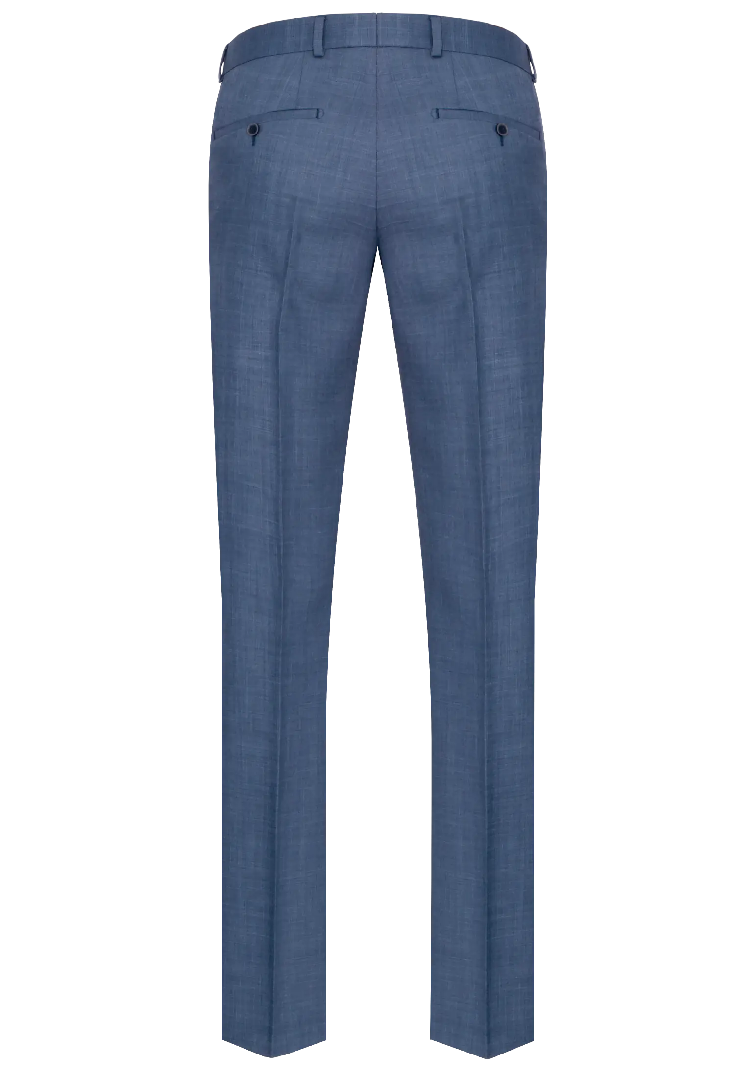 Klasyczne spodnie garniturowe w kolorze niebieskim. Posiadają w przodzie dwie kieszenie skośne, z tyłu dwie kieszenie zapinane na guzik, zaprasowane na kant z kolanówką, pasek