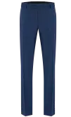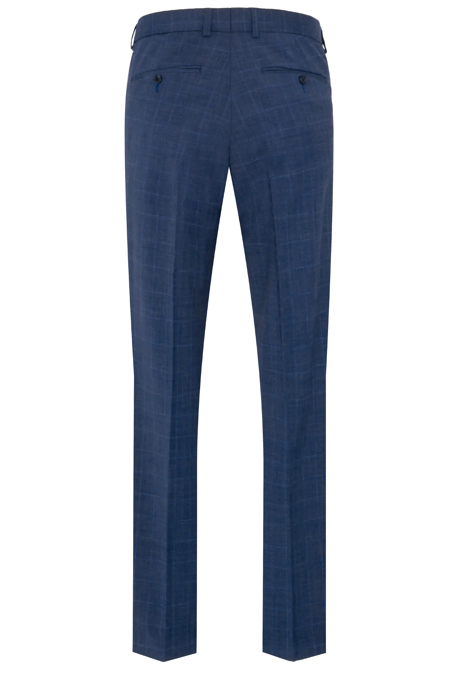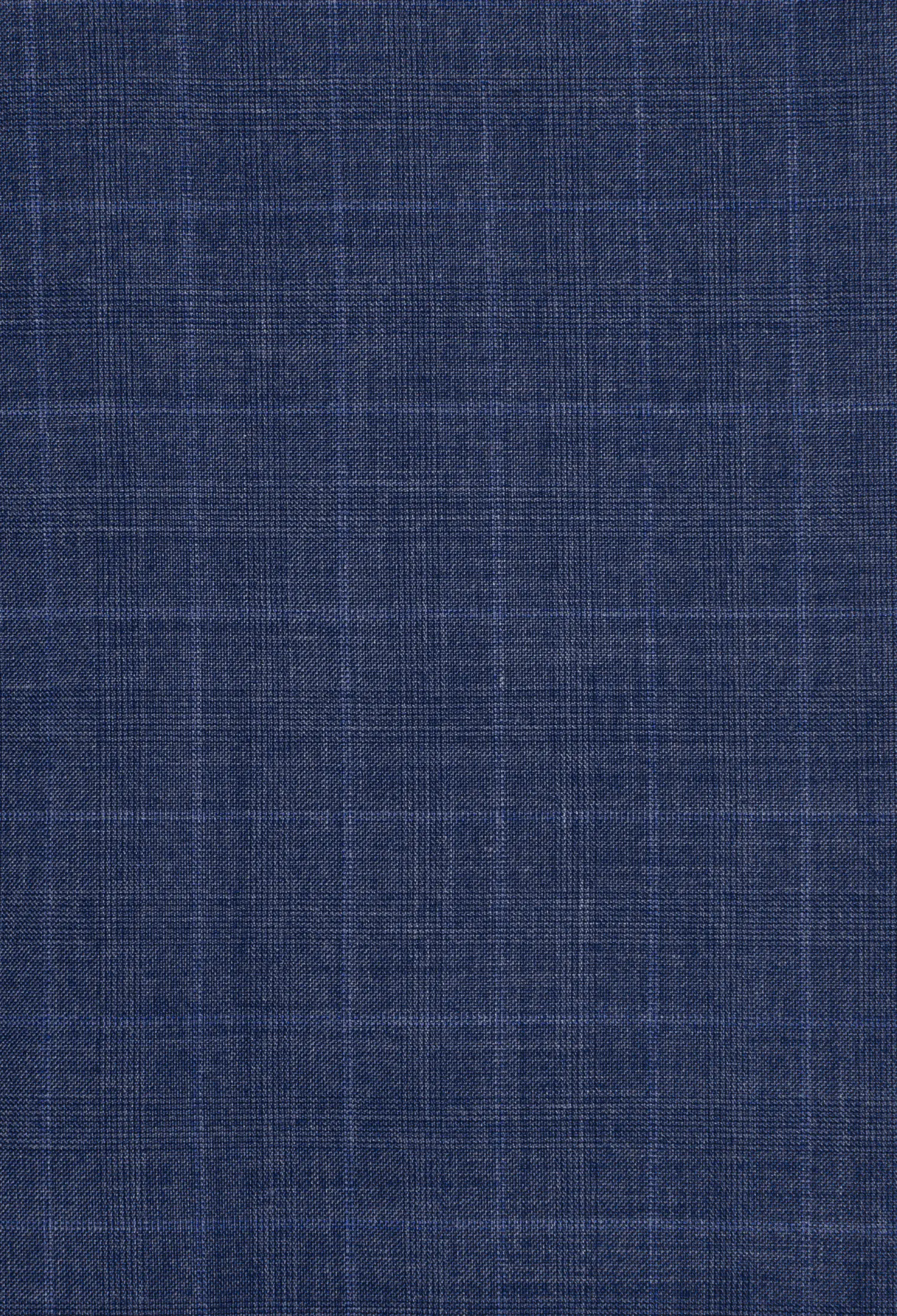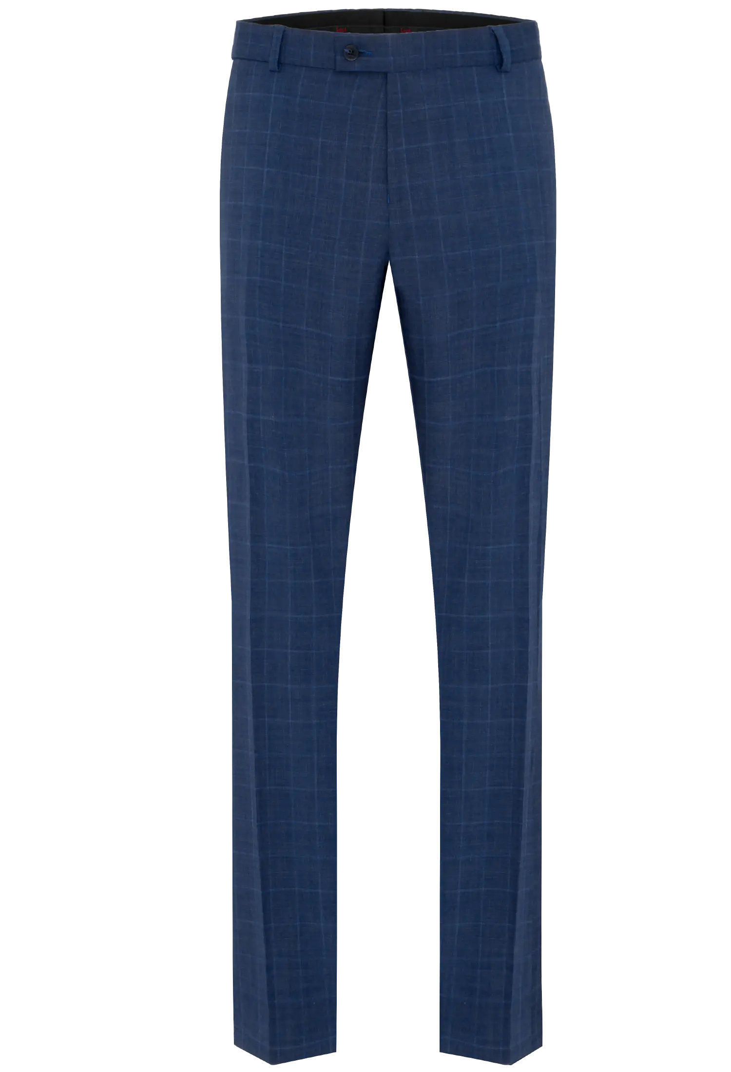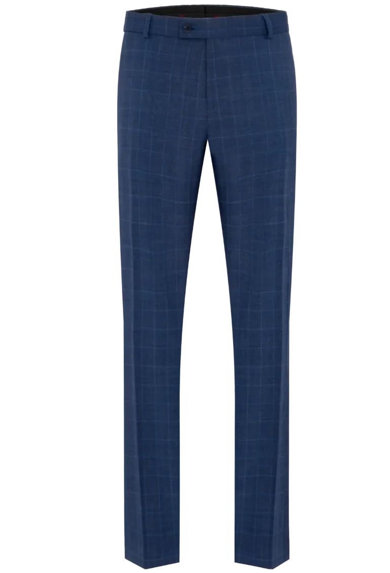 Spodnie klasyczne w kolorze niebieskim w delikatną niebieską kratę. Posiadają w przodzie dwie kieszenie skośne z tyłu dwie kieszenie cięte zapinane na guzik, zaprasowane na kant