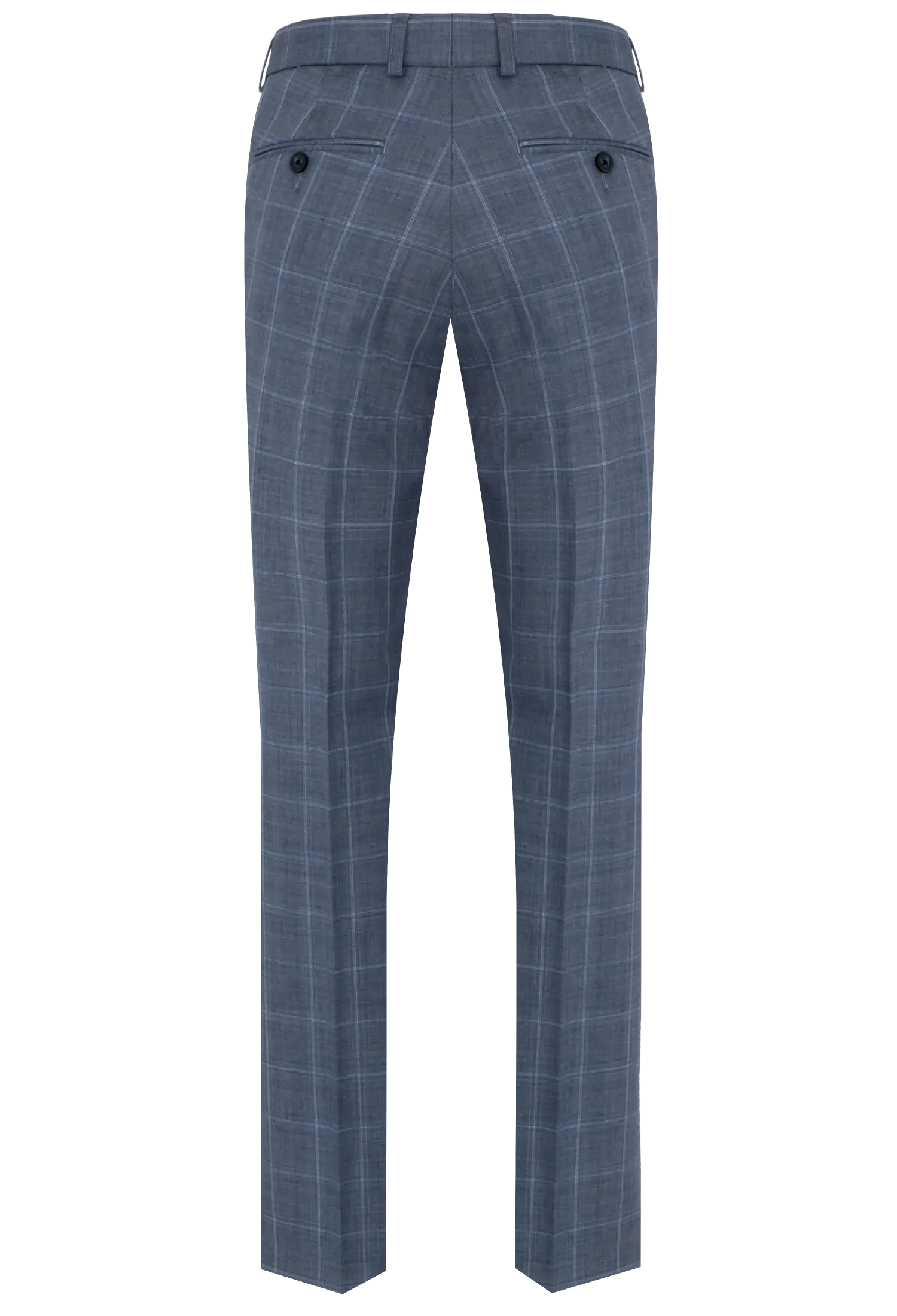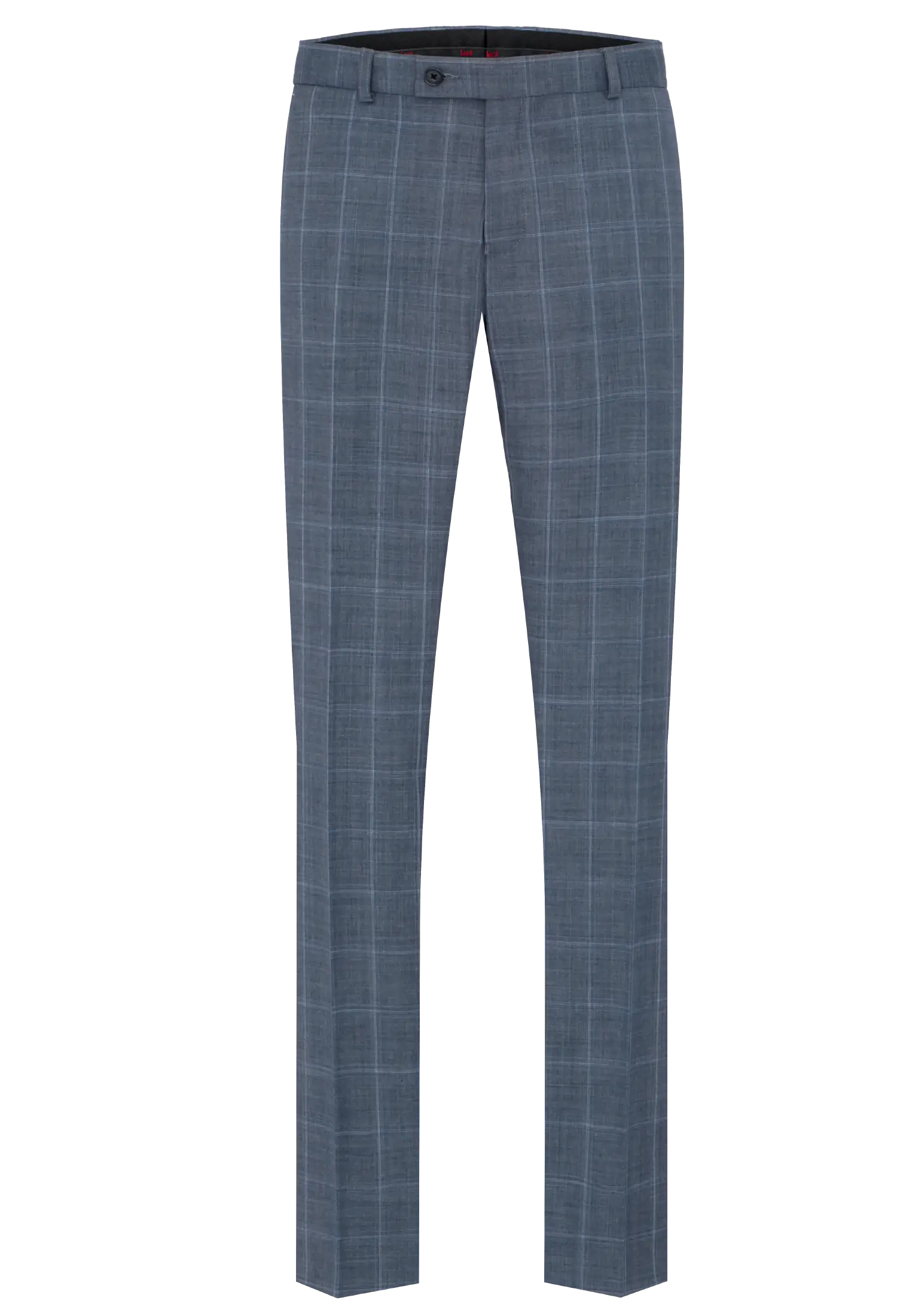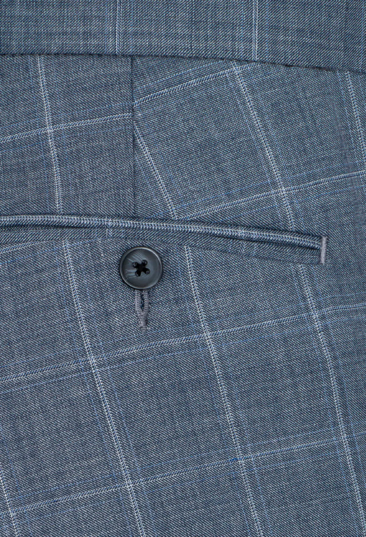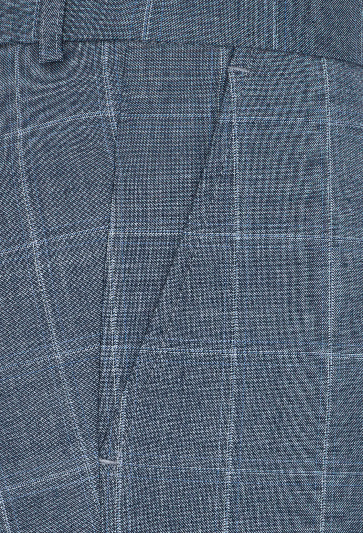Spodnie klasyczne w kolorze popielatym w bardzo wyraźną kratkę. Posiadają w przodzie dwie kieszenie skośne z tyłu dwie kieszenie cięte zapinane na guzik, zaprasowane na kant