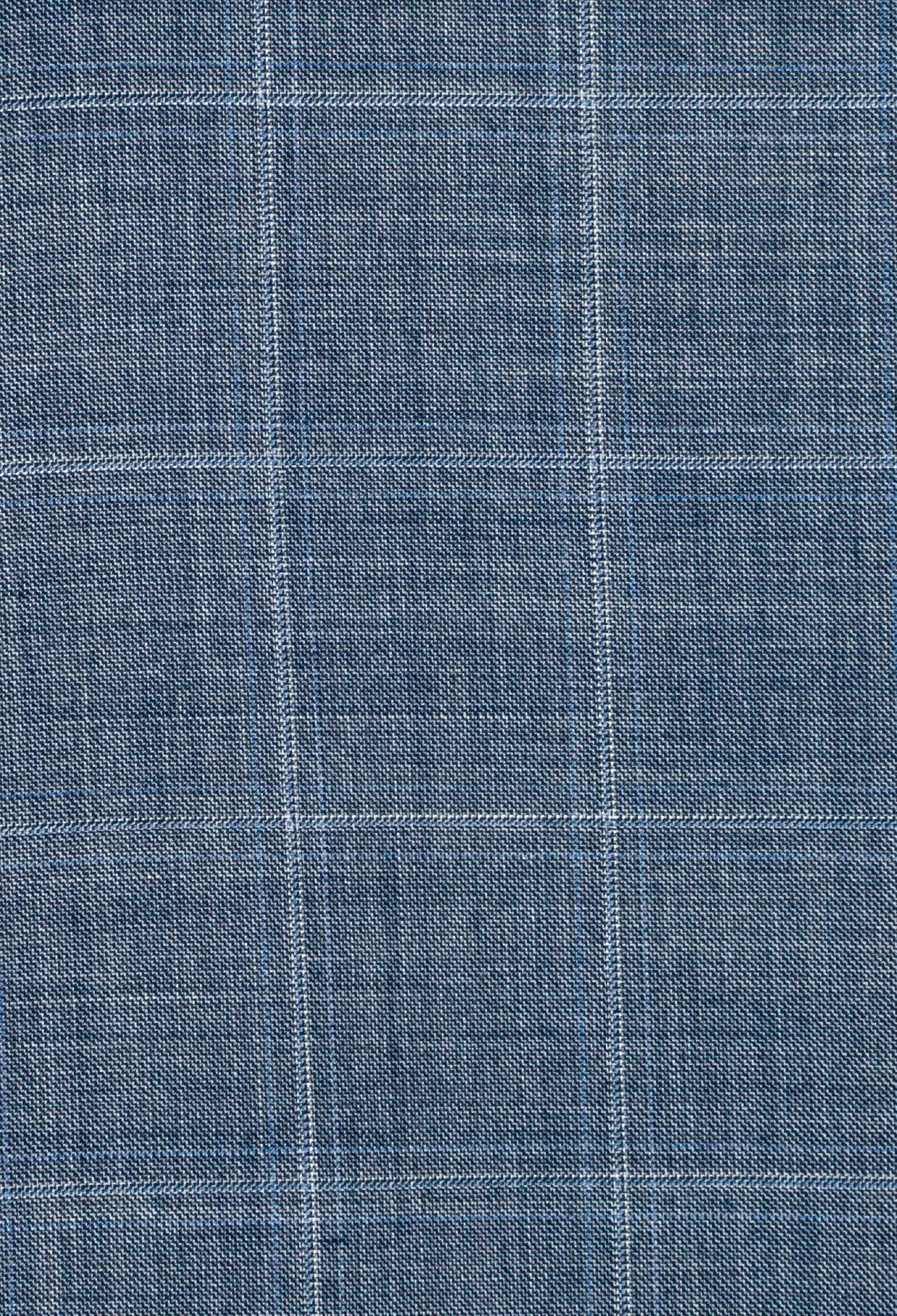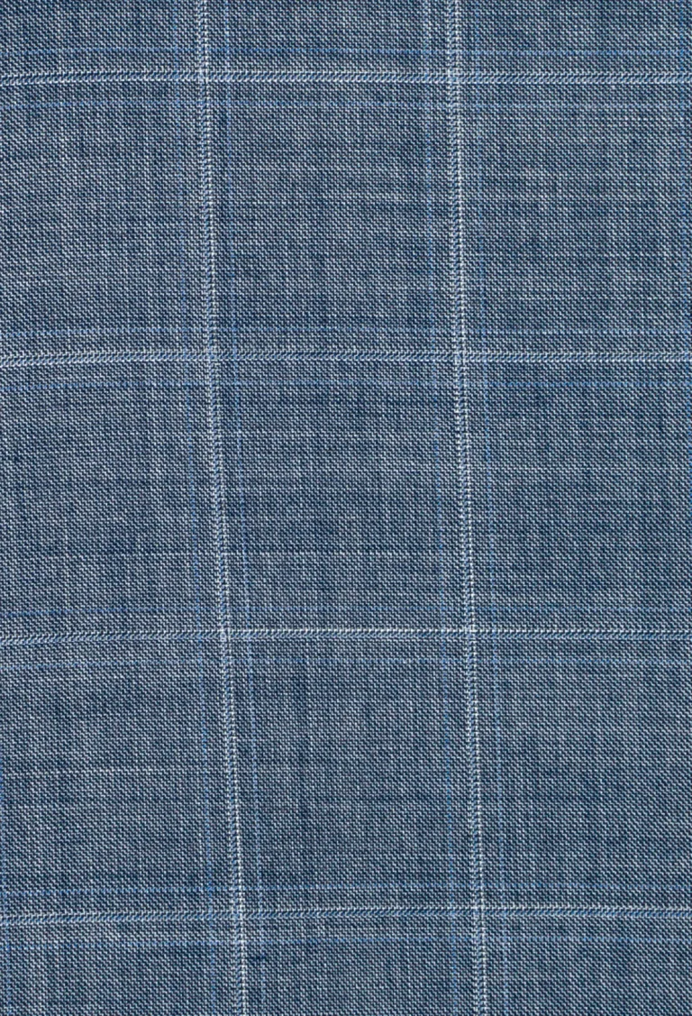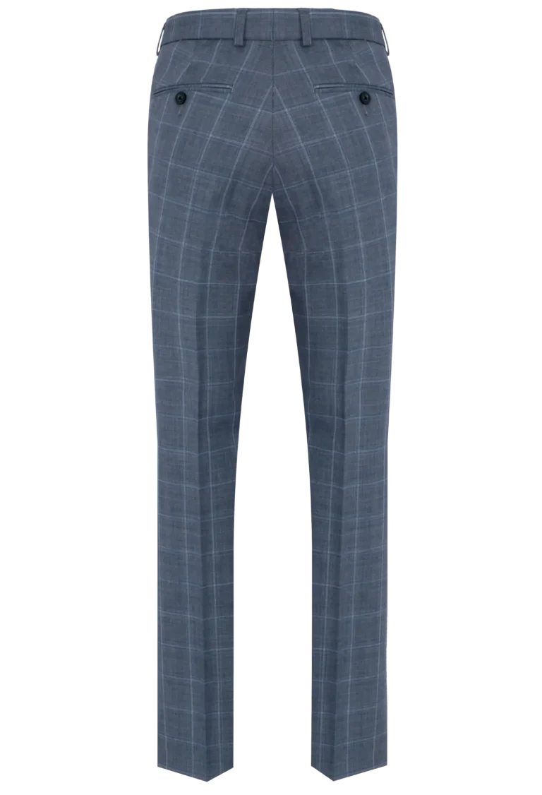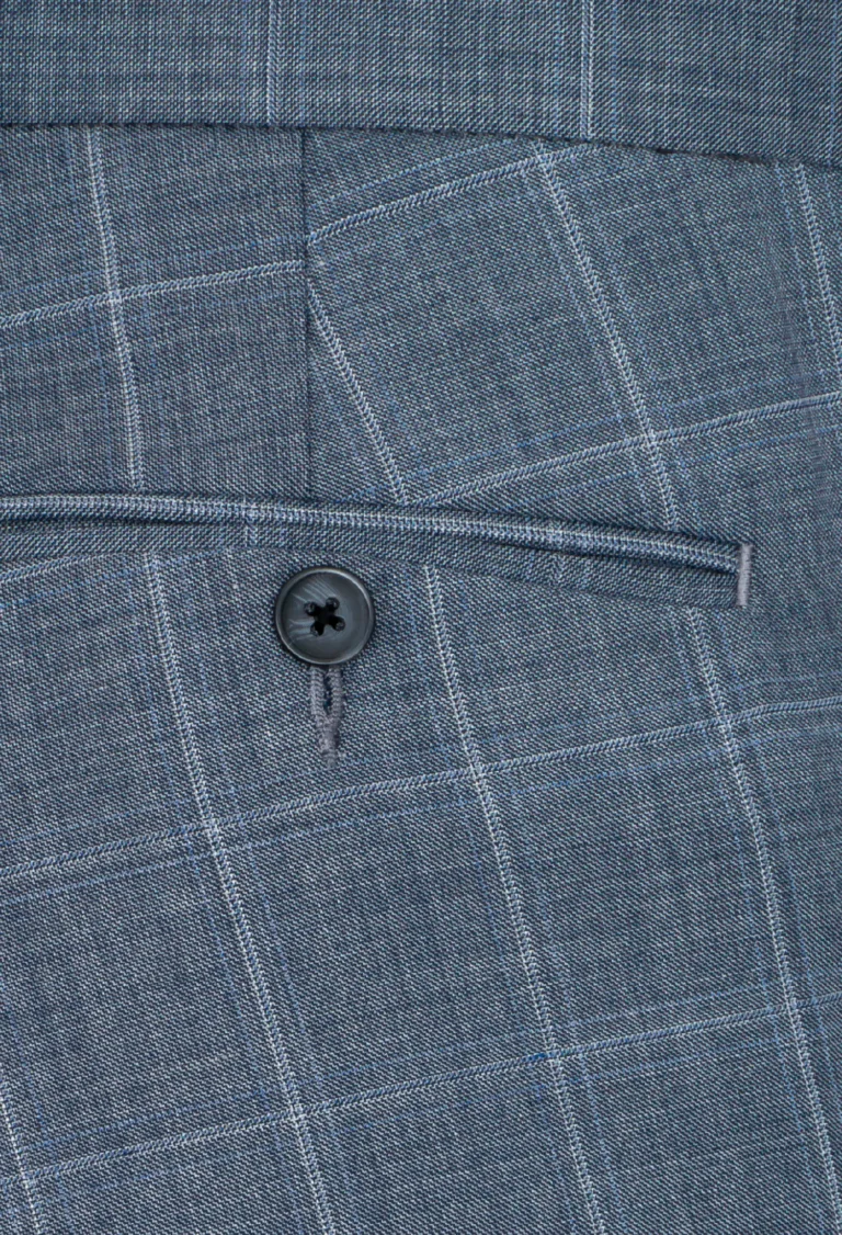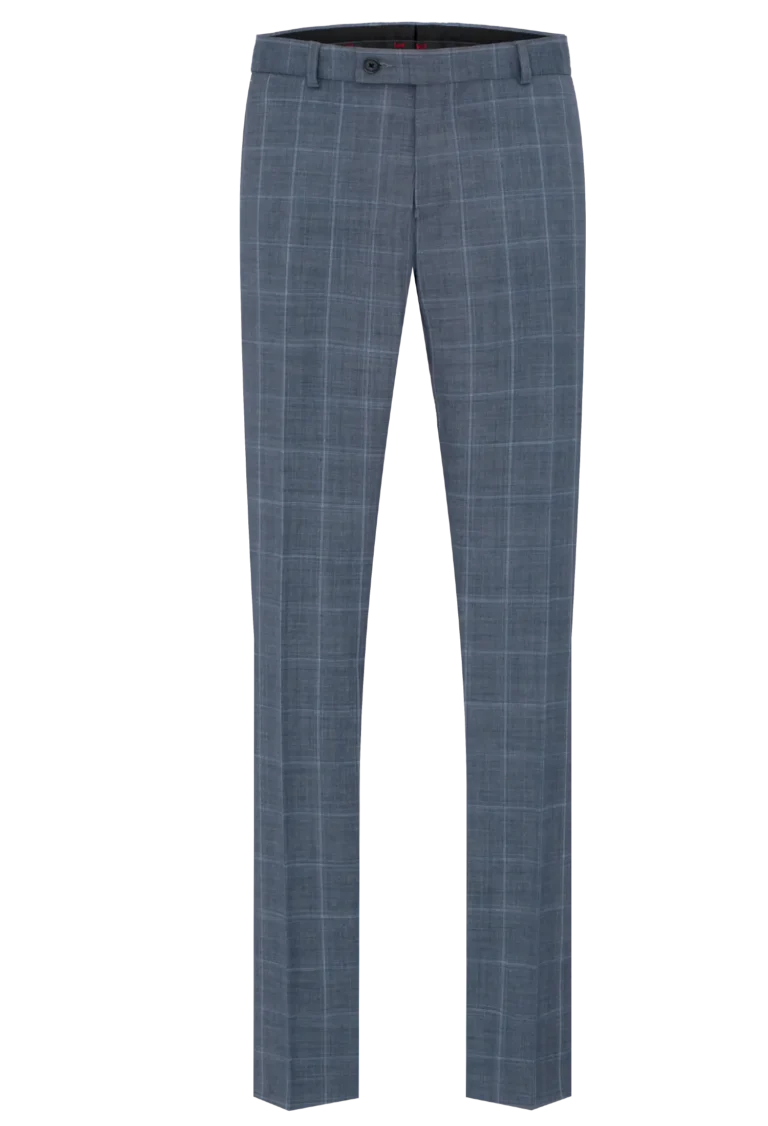 Spodnie klasyczne w kolorze popielatym w bardzo wyraźną kratkę. Posiadają w przodzie dwie kieszenie skośne z tyłu dwie kieszenie cięte zapinane na guzik, zaprasowane na kant
