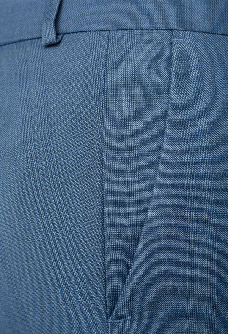 Spodnie męskie garniturowe w delikatną kratę, szaroniebieskie o dopasowanym kroju z nogawką zwężoną ku dołowi. Półformalny styl łączący w sobie cechy spodni eleganckich i tych o nieco swobodnym charakterze. Spodnie posiadają kieszenie i szlufki z rygielkami. Na wewnętrznej stronie paska umieszczony jest gurt, który zapobiega wysuwaniu się koszuli. Spodnie posiadają kantówkę co chroni je przed wypychaniem kolan.