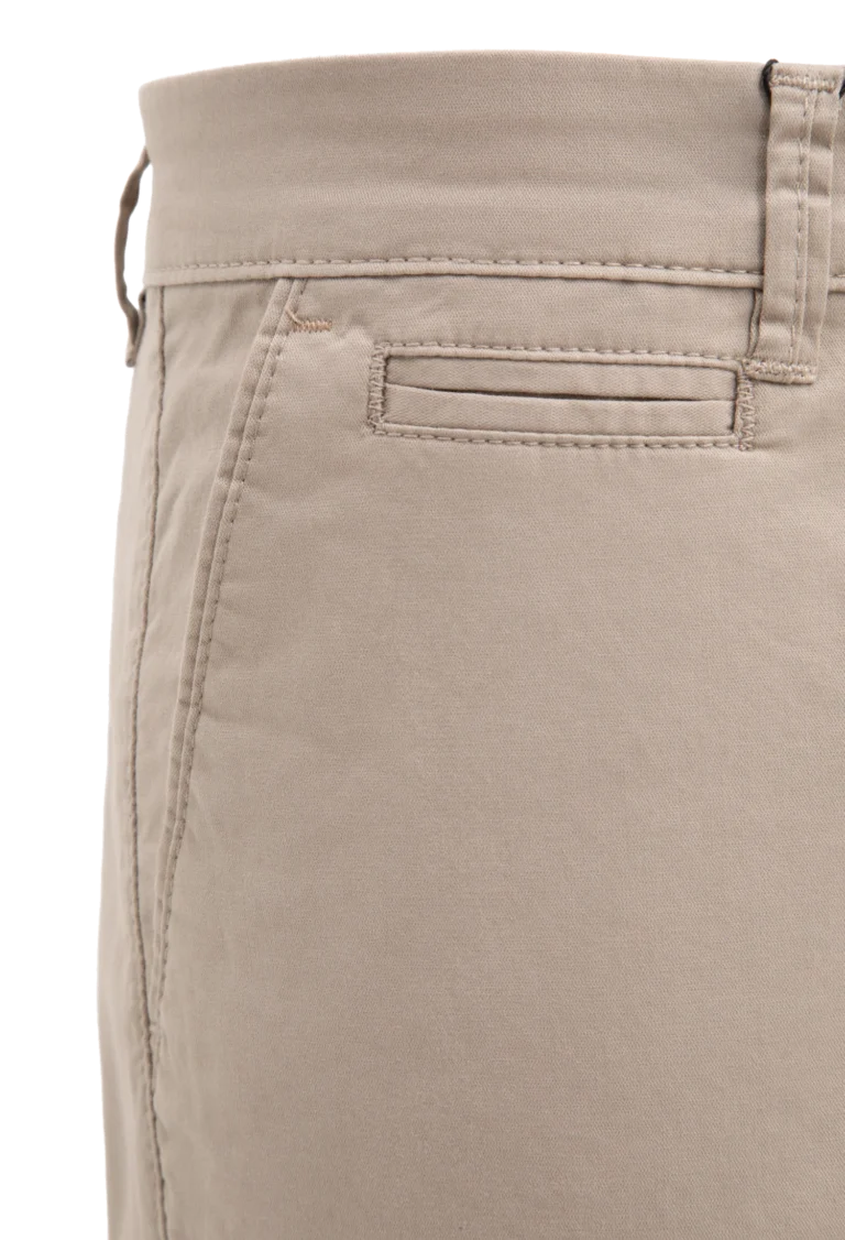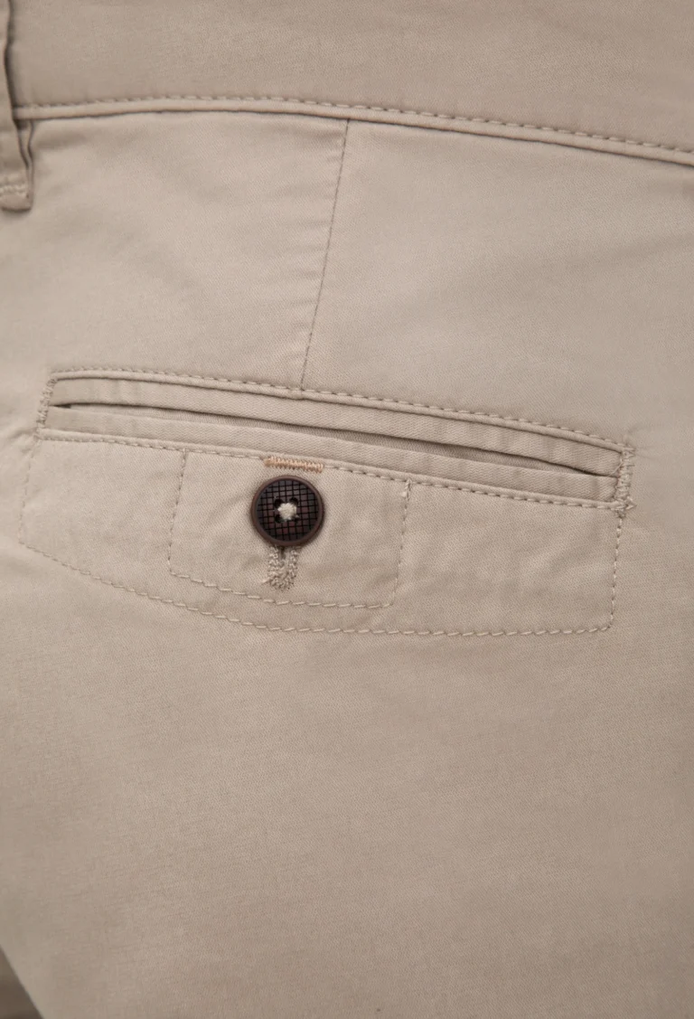 Spodnie męskie w kolorze jasnobeżowym, tkanina gładka i bardzo miła w dotyku. Typowo letnia tkanina o niższej gramaturze, przewiewna. Wykonane z wysokiej jakości bawełny z dodatkiem elastanu, co wpływa niezwykle korzystnie na komfort użytkowania.