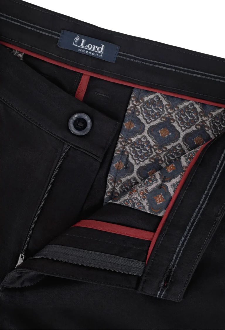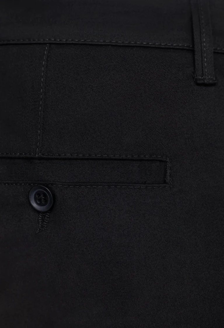 Czarne gładkie spodnie typu chinos, uszyte z wysokogatunkowej bawełny z dodatkiem elastanu. Dzięki jego zawartości spodnie są bardzo wygodne, dają dużą swobodę ruchu i są miłe w dotyku. Dobrze komponują się z casualową marynarką.