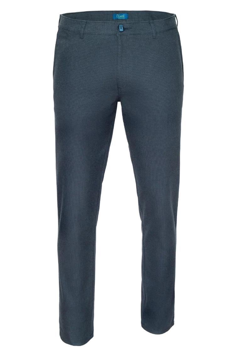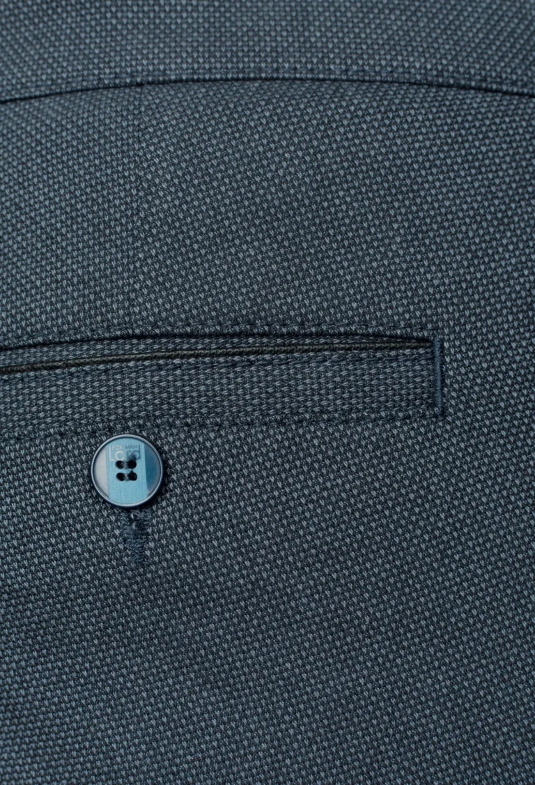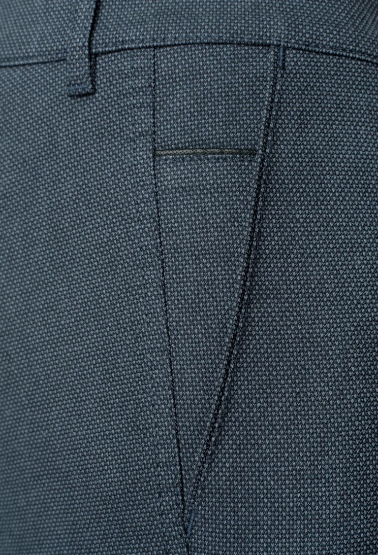 Spodnie męskie całoroczne wykonane z bawełnianej strukturalnej tkaniny z dodatkiem elastanu, w drobny wzorek w kolorze granatowo-szarym. Model posiada pięć kieszeni. Jest to propozycja dla panów poszukujących oryginalnego wzornictwa.