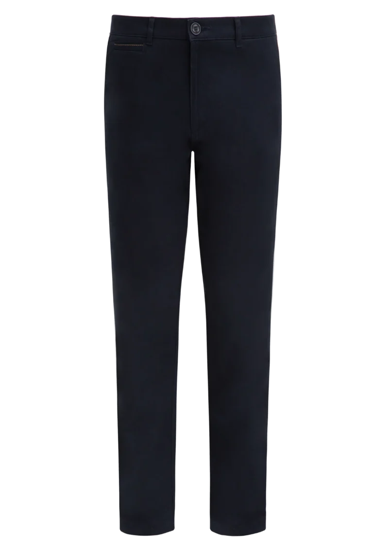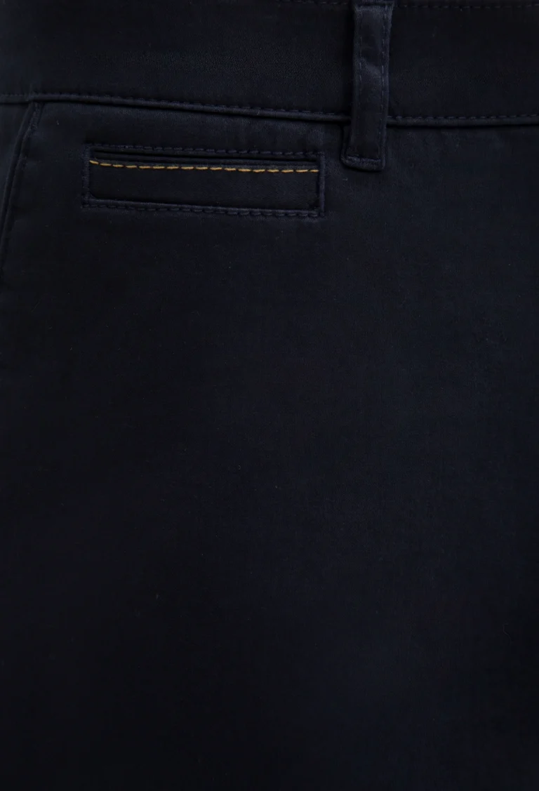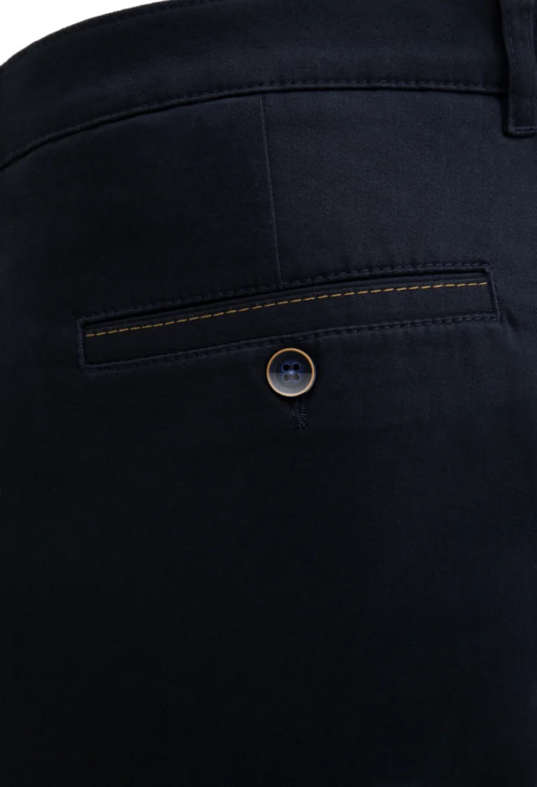 Granatowe spodnie męskie jesienno-zimowe typu chinos, wykonane z wysokogatunkowej grubszej bawełny z dodatkiem elastanu. Skład tkaniny zapewnia dobrą przewiewność, spodnie są bardzo ciepłe, wytrzymałe, nie odkształcają się podczas noszenia, są odporne na mechacenie, ładnie dopasowują się do sylwetki.