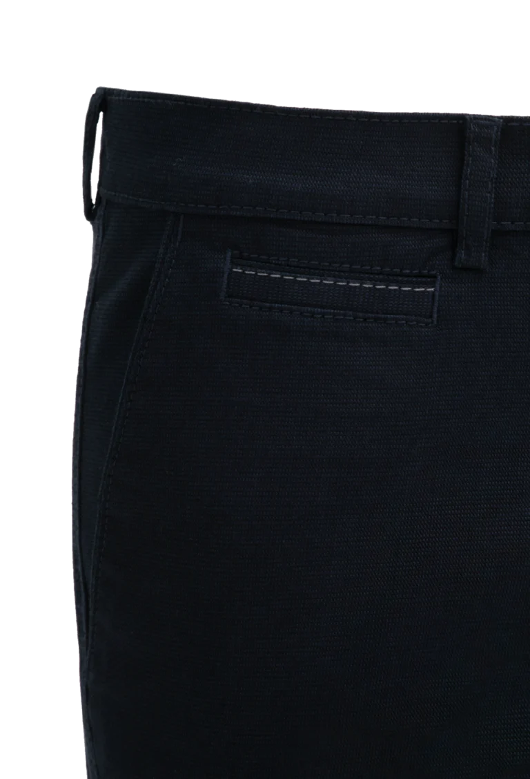 z dodatkiem elastanu, który korzystnie wpływa na wyrób, zapobiega wygniataniu się kolan. Spodnie miękkie i miłe w dotyku, wygodne, praktyczne w noszeniu. Fason świetnie pasuje na każdą sylwetkę i okazję.Spodnie męskie w kolorze granatowym wykonane z grubszej bawełnianej tkaniny