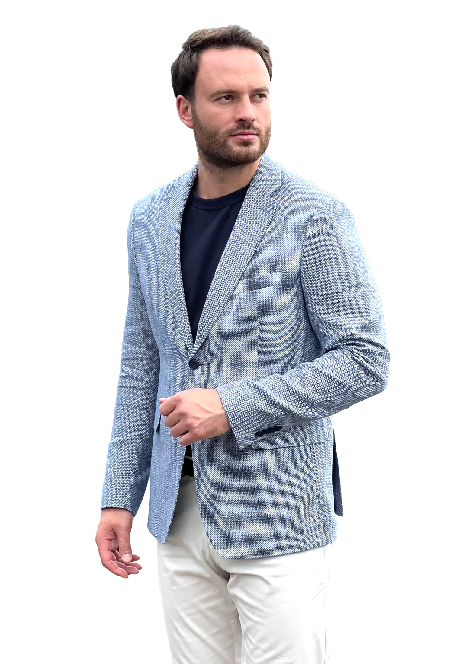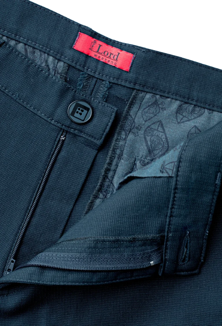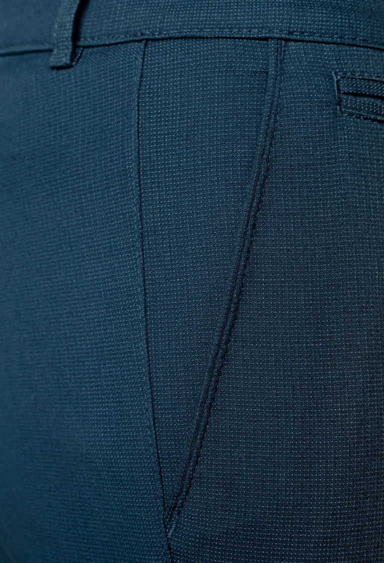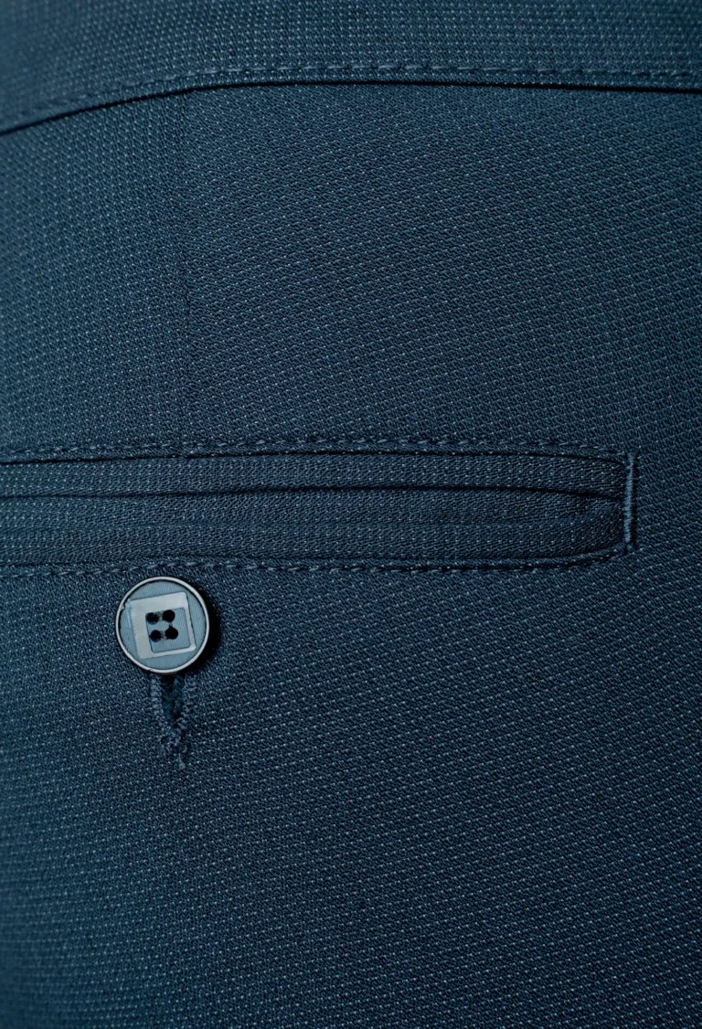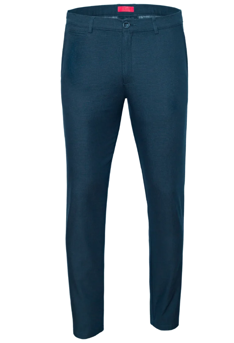 Spodnie męskie w kolorze granatowym, wykonane z tkaniny strukturalnej w bardzo drobny wzorek. Wykonane z miłej w dotyku tkaniny z dodatkiem elastanu. Idealnie pasują do wielu stylizacji.
