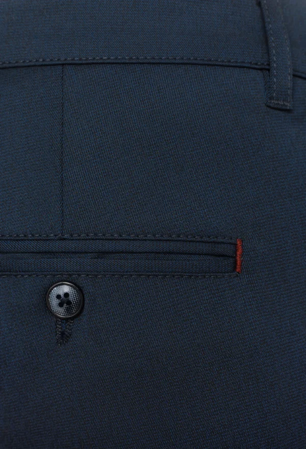 Spodnie męskie w kolorze granatowym zostały wykonane z wysokiej jakości tkaniny powstałej z odpowiednio dobranej kompozycji przędz. Dzięki zawartości elastanu spodnie doskonale dopasowują się do sylwetki, są wygodne w noszeniu i stanowią stylową alternatywę dla klasycznych spodni na kant. Materiał jest miękki, przyjemny w dotyku i odporny na pilling.