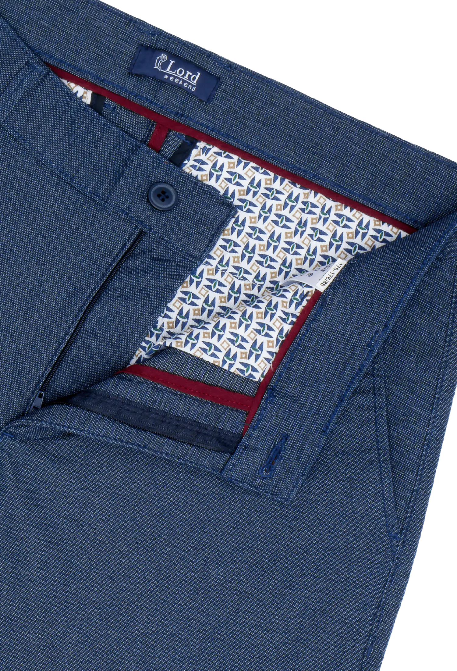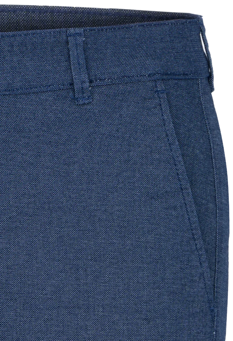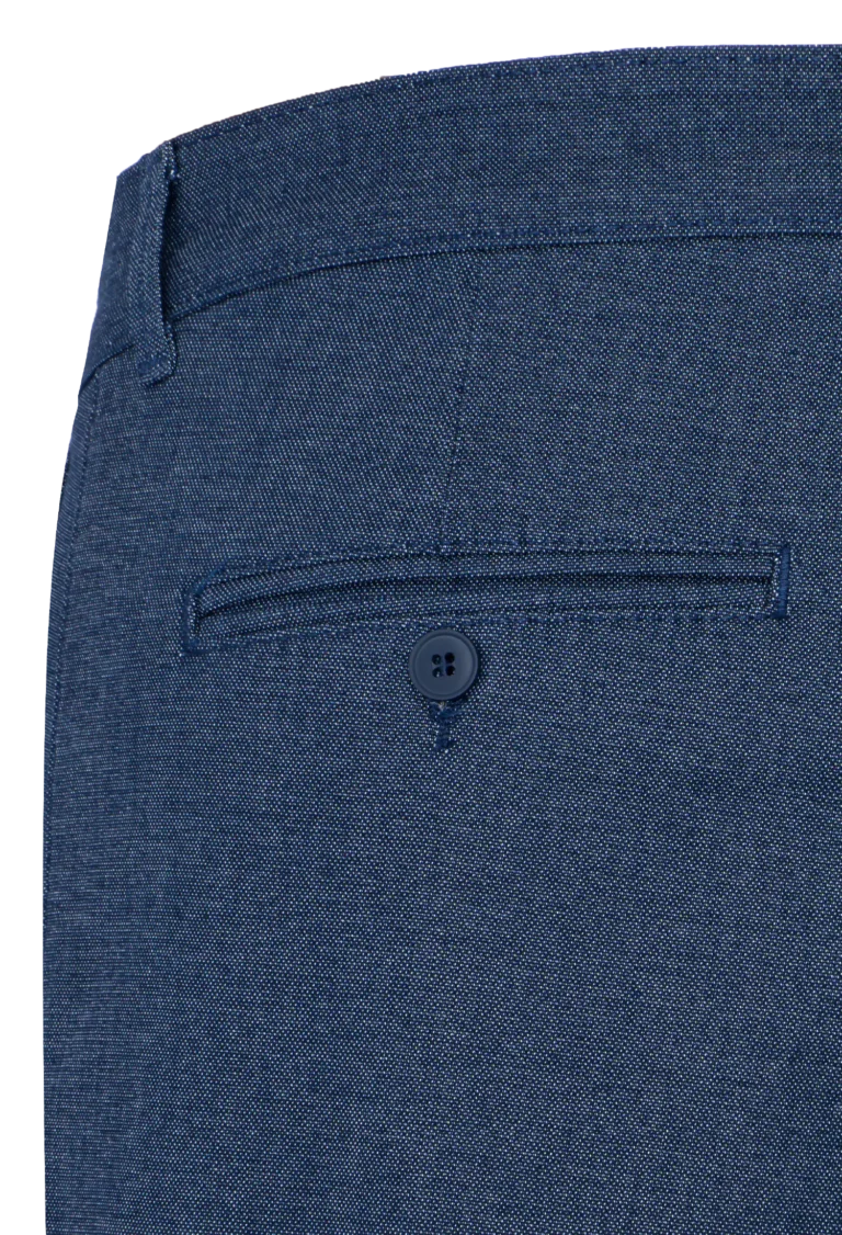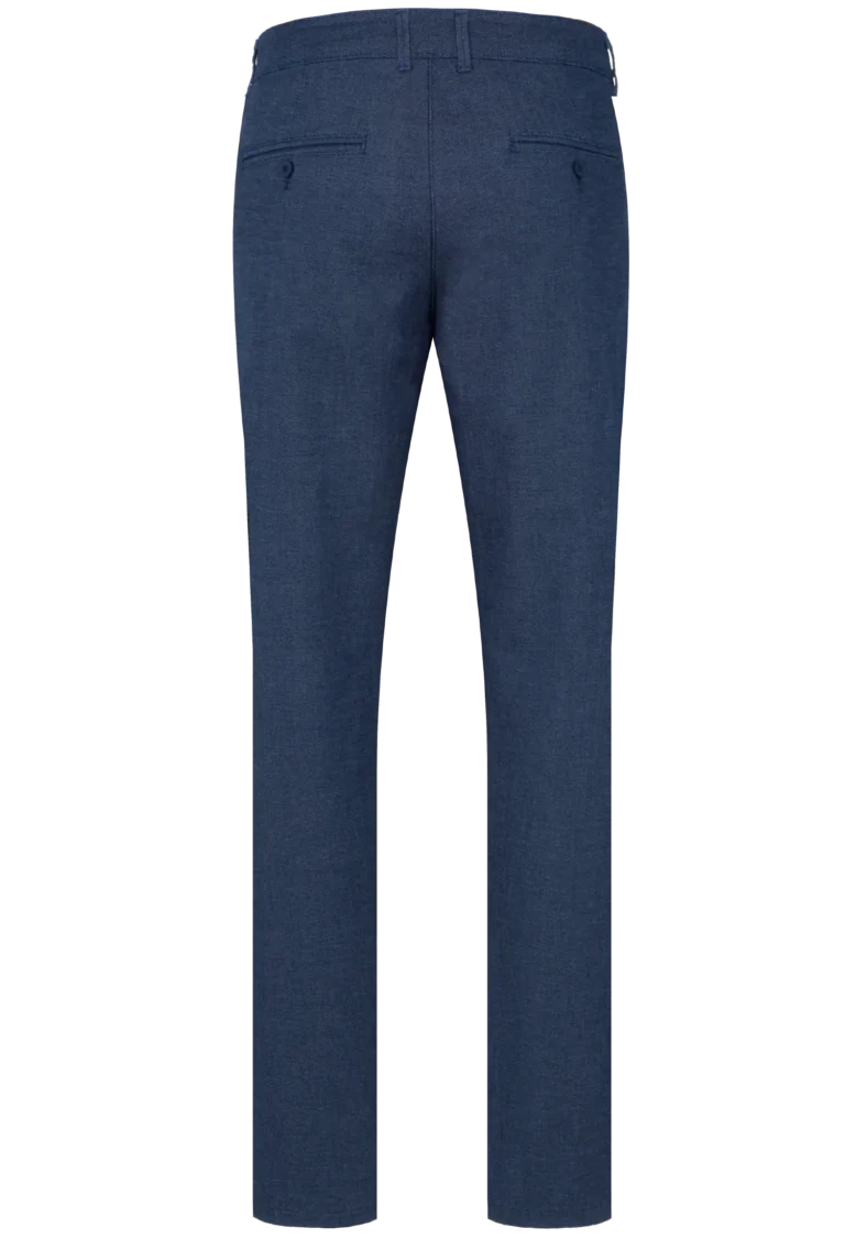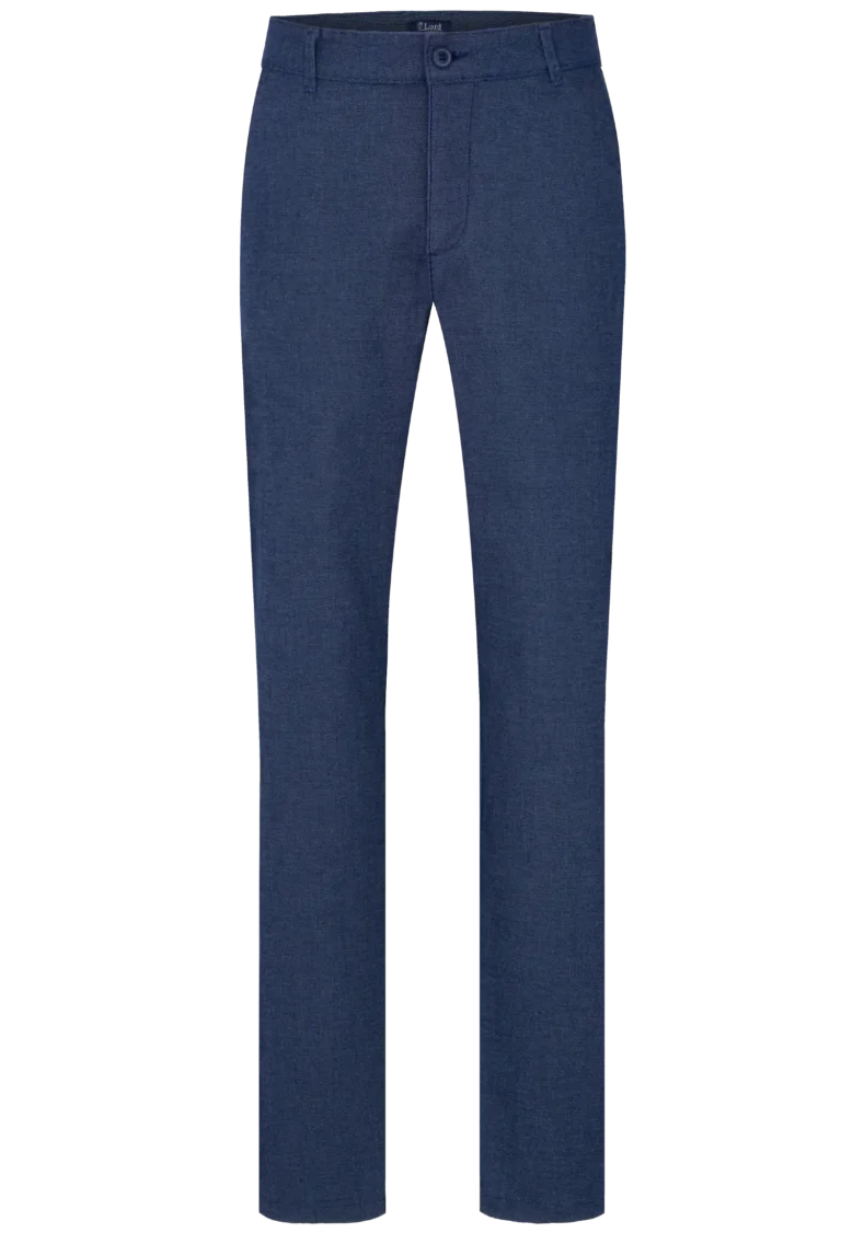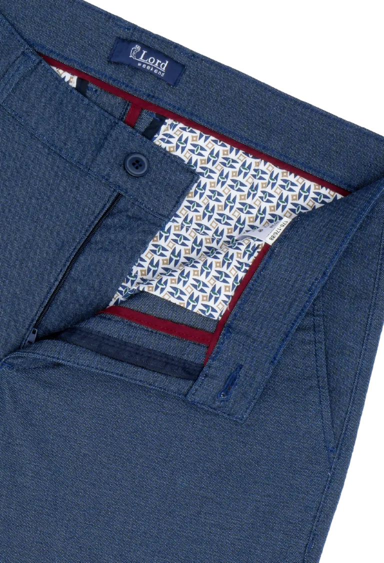 Spodnie męskie w kolorze granatowym zostały wykonane z wysokogatunkowej tkaniny zawierającej ponad 70% bawełny z dodatkiem elastanu, co korzystnie wpływa na komfort noszenia. Materiał jest miękki, sprężysty i odporny na zmechacenie. Spodnie idealnie pasujące do codziennych stylizacji.