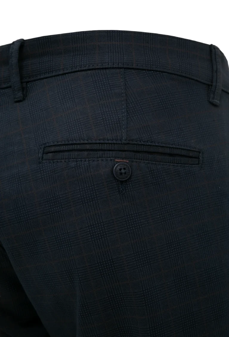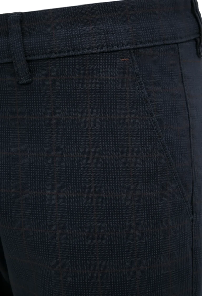 Spodnie męskie casualowe w kolorze ciemnego granatu w brązową kratkę. Spodnie bardzo wygodne, wykonane z tkaniny bawełnianej, miłe w dotyku. Świetnie dopasowują się do sylwetki i stanowią alternatywę dla spodni klasycznych.