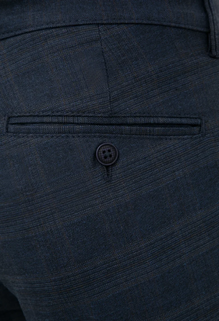 Spodnie męskie w kolorze granatowym w delikatną kratkę w odcieniu brązowym. Wykonane z miękkiej miłej w dotyku tkaniny, dzięki zawartości elastanu spodnie są bardzo wygodne, dają dużą swobodę ruchu, nie wygniatają się są łatwe w konserwacji.