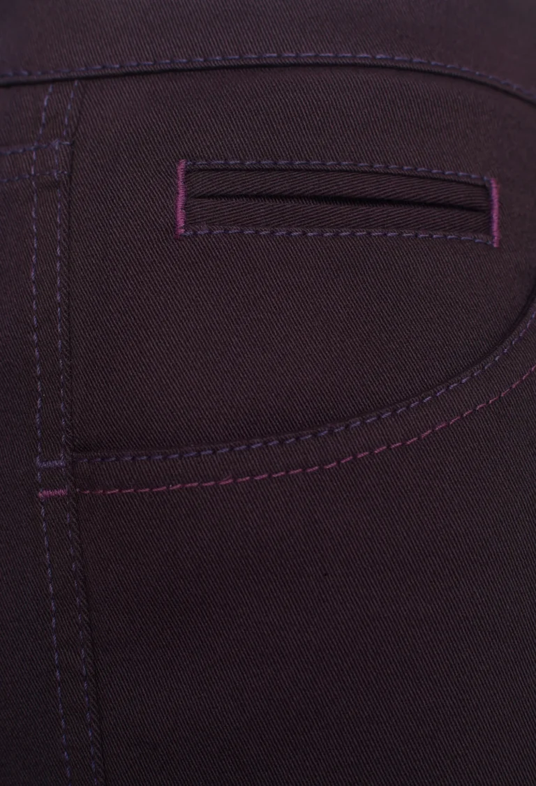 Model jesienno-zimowy wykonany z grubszej bawełnianej tkaniny z dodatkiem elastanu o splocie diagonalnym w kolorze dojrzałej śliwki. Idealny zamiennik dla jeansów. Znakiem charakterystycznym są dwie półokrągłe kieszenie w przodzie z dodatkową kieszonką tzw. zegarówką. Tył spodni z karczkiem z dwoma naszywanymi kieszeniami. Skład tkaniny z dużą przewagą bawełny powoduje, że spodnie są bardzo wygodne, miękkie a dodatek elastanu daje dobre dopasowanie i utrzymanie pożądanego kształtu. Świetnie wyglądają w towarzystwie sportowej marynarki.