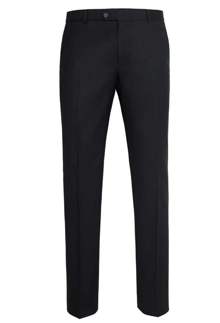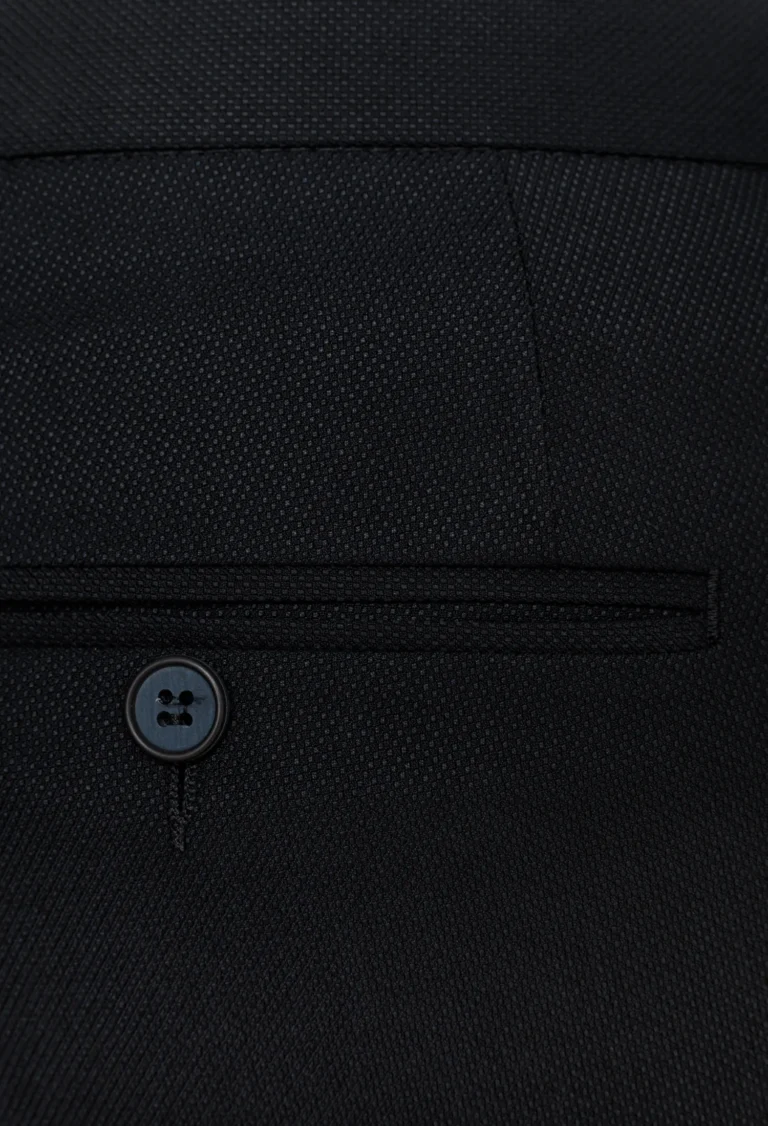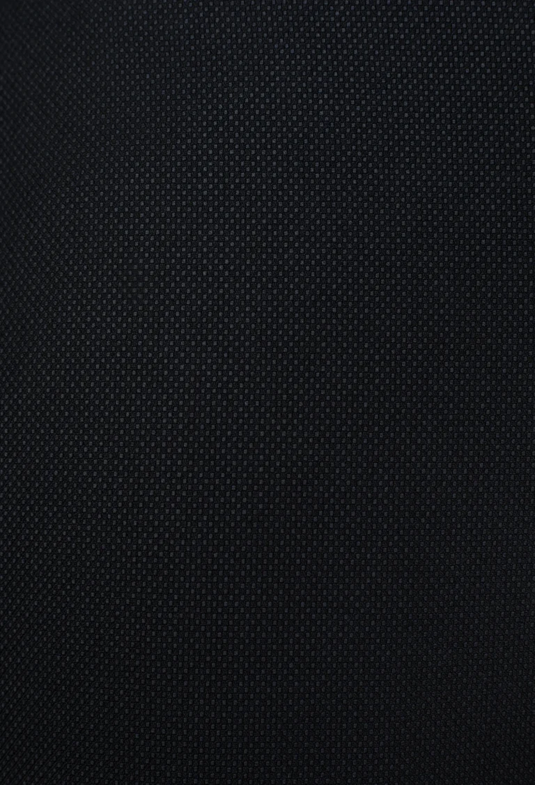 Garniturowe spodnie męskie w kolorze granatu w delikatny mikrowzór. Spodnie na kant bez zaszewek z dwoma kieszeniami po bokach i dwoma z tyłu. Pasek spodniowy z gurtem. Spodnie klasyczne z podniesionym stanem, lekko zwężona nogawka dołem. Spodnie zestawione z marynarką z tej samej tkaniny świetnie pasują na oficjalne spotkania biznesowe jak również na niej formalne.