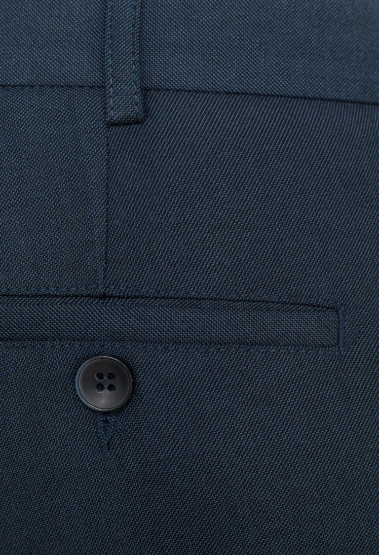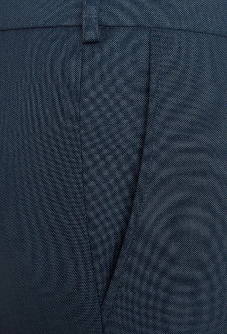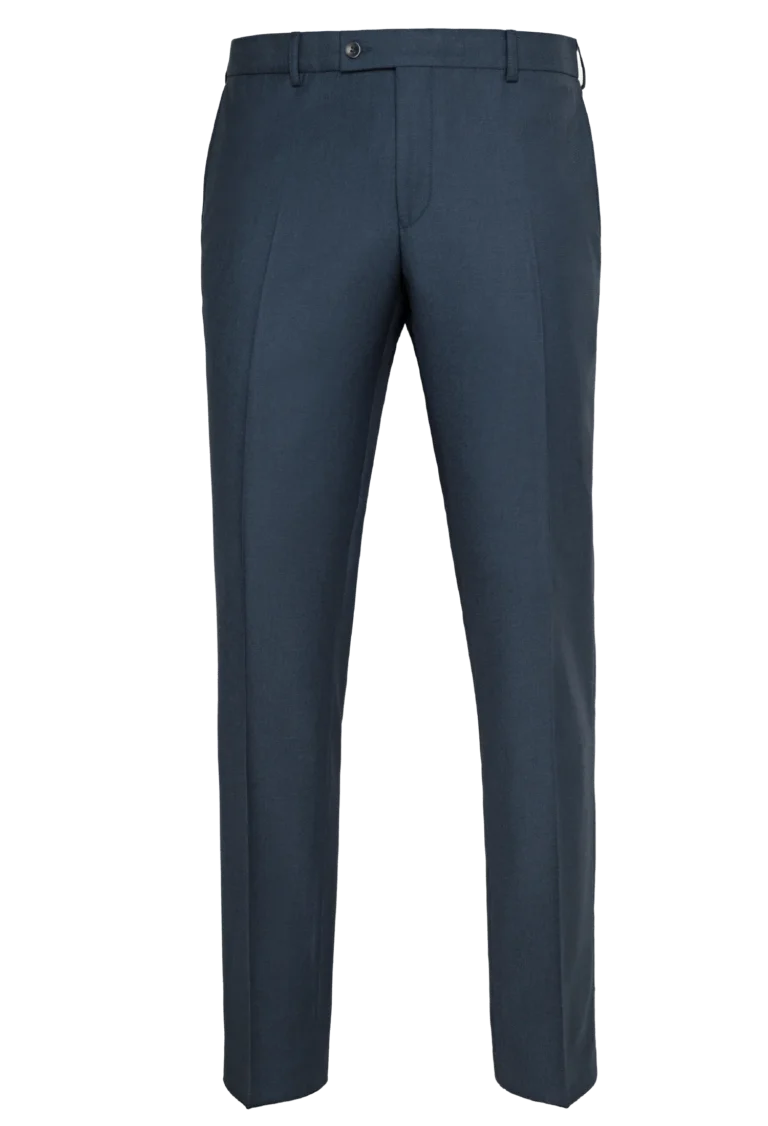 Spodnie męskie klasyczne na kant w kolorze granatowym z tkaniny melanżowej wpadającej w odcień popielu. Całoroczne wykonane z mieszanki włókien syntetycznych i elastanu. Model posiada dwie kieszenie skośne w przodzie oraz z tyłu dwie cięte jednowypustkowe zapinane na guzik. Spodnie posiadają kolanówkę co chroni je przed wypychaniem kolan. Połączenie wełny i włókien poliestrowych zapewnia trwałość i dobre dopasowanie. Pasek spodni wykończony gurtem. Konstrukcja spodni wyszczuplona z podniesionym stanem. Spodnie noszone z marynarką z tej samej tkaniny tworzą garnitur, ale nadają się również do casualowej stylizacji.