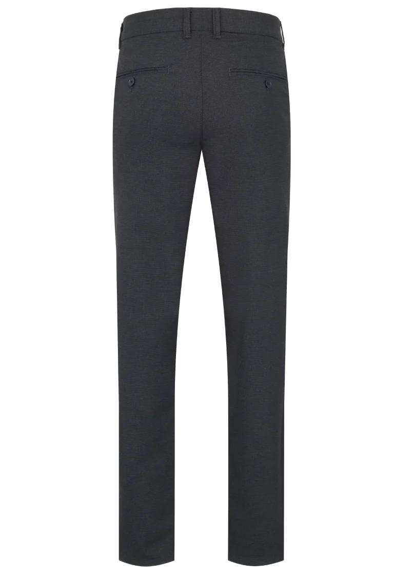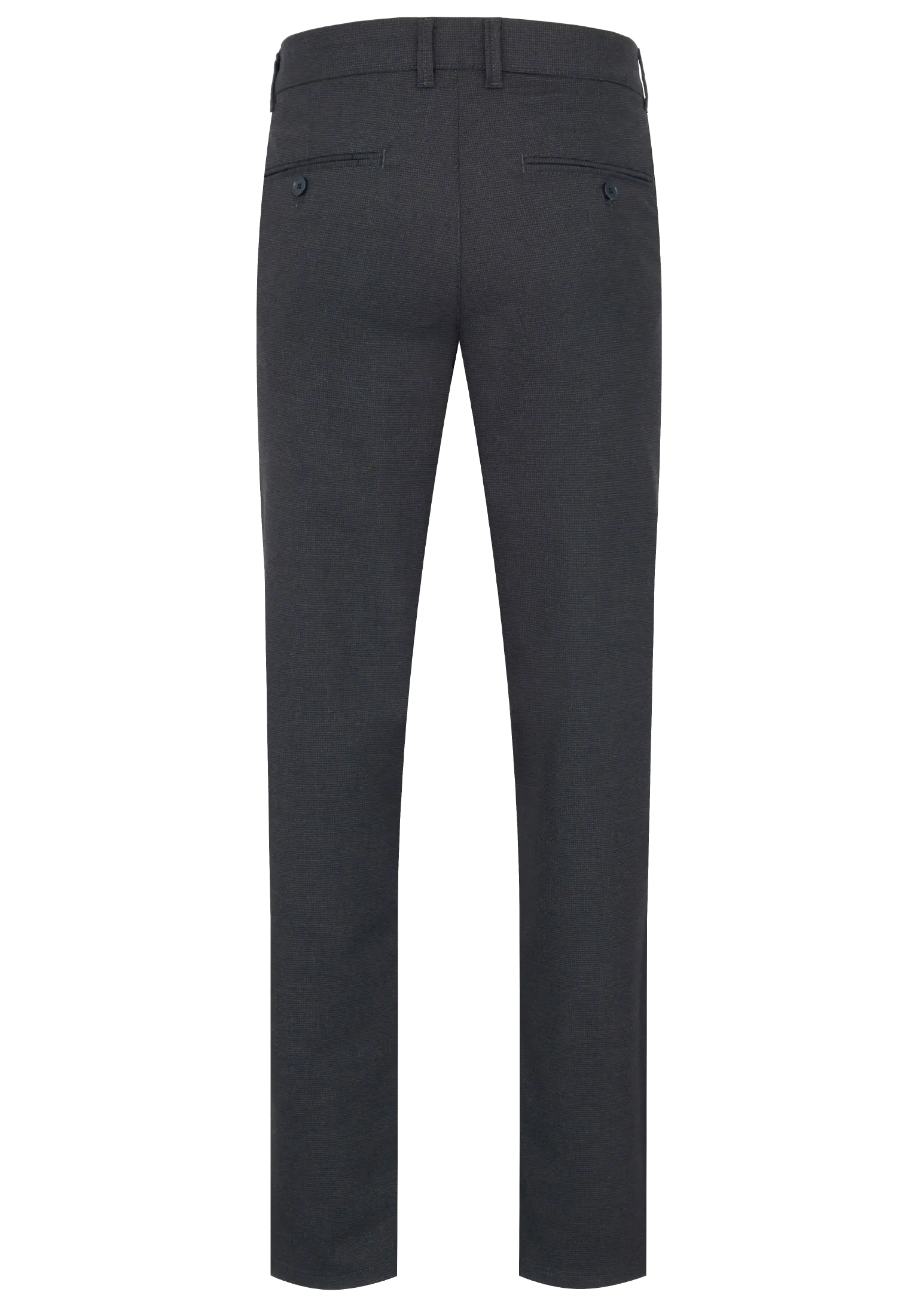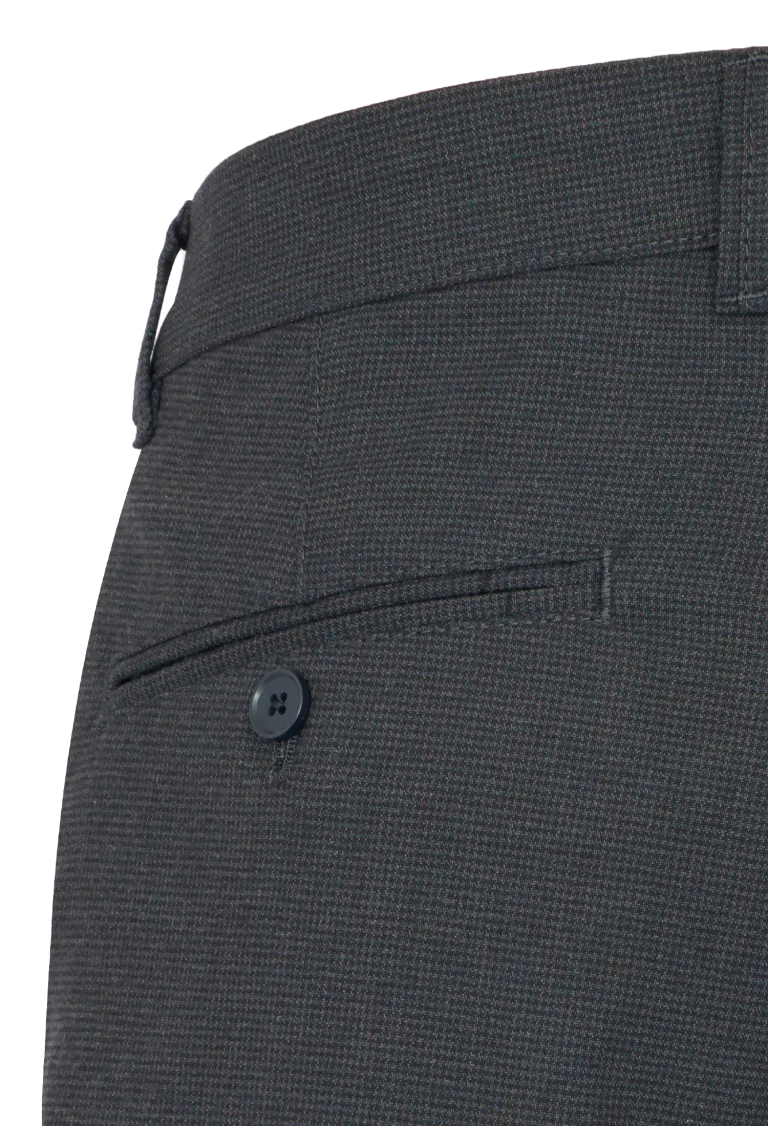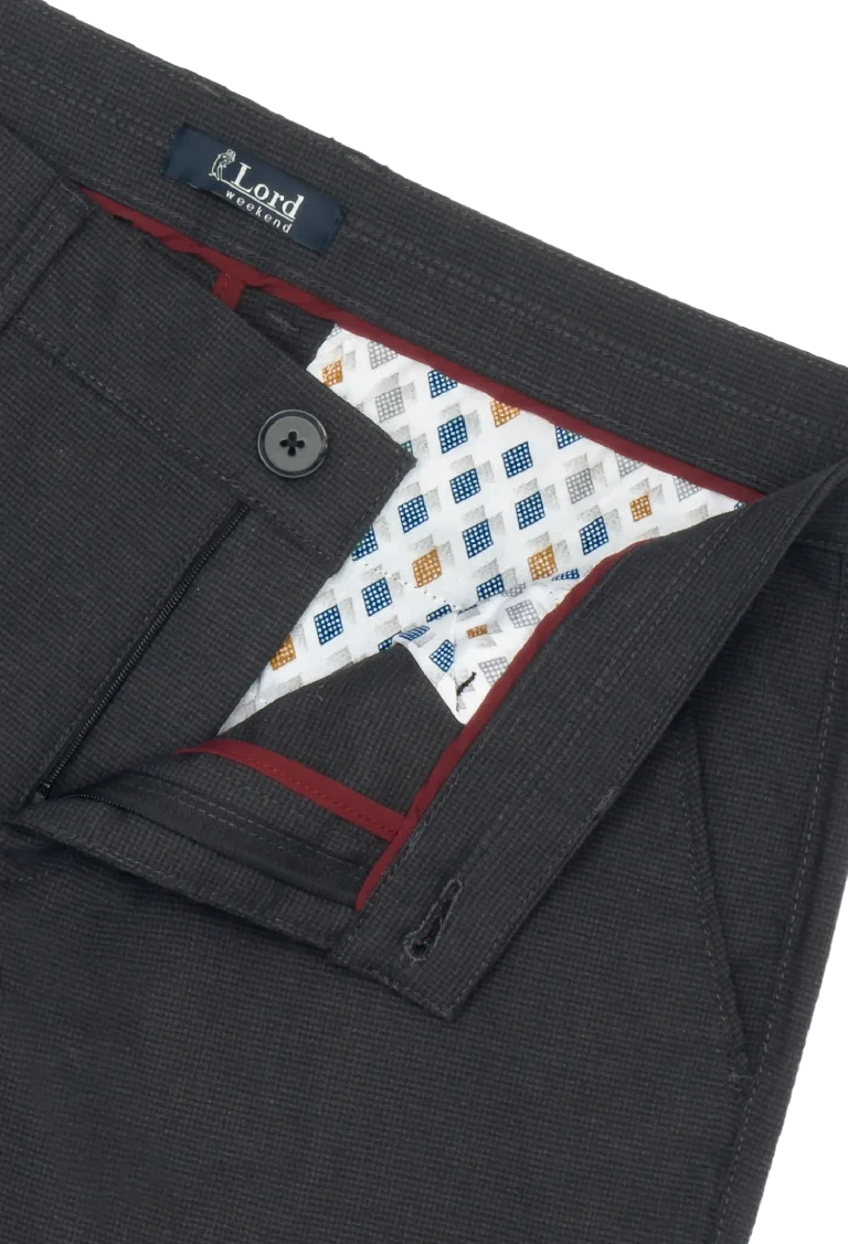 Spodnie męskie w kolorze antracytowym w drobne pepitko zostały wykonane z wysokiej jakości tkaniny powstałej z odpowiednio dobranej kompozycji przędz. Dzięki zawartości elastanu spodnie doskonale dopasowują się do sylwetki, są wygodne w noszeniu i stanowią stylową alternatywę dla klasycznych spodni na kant. Materiał jest miękki, przyjemny w dotyku i odporny na pilling.