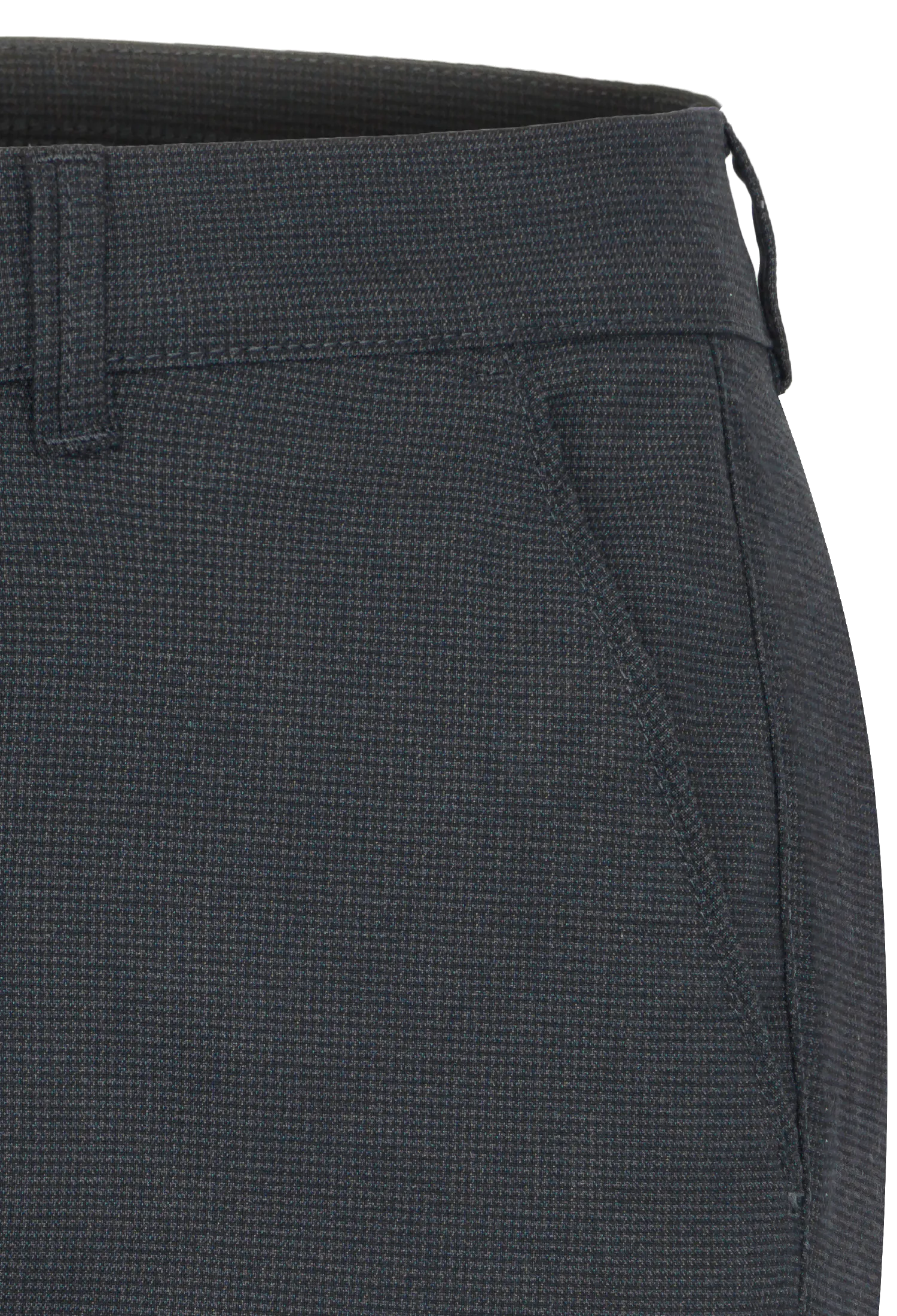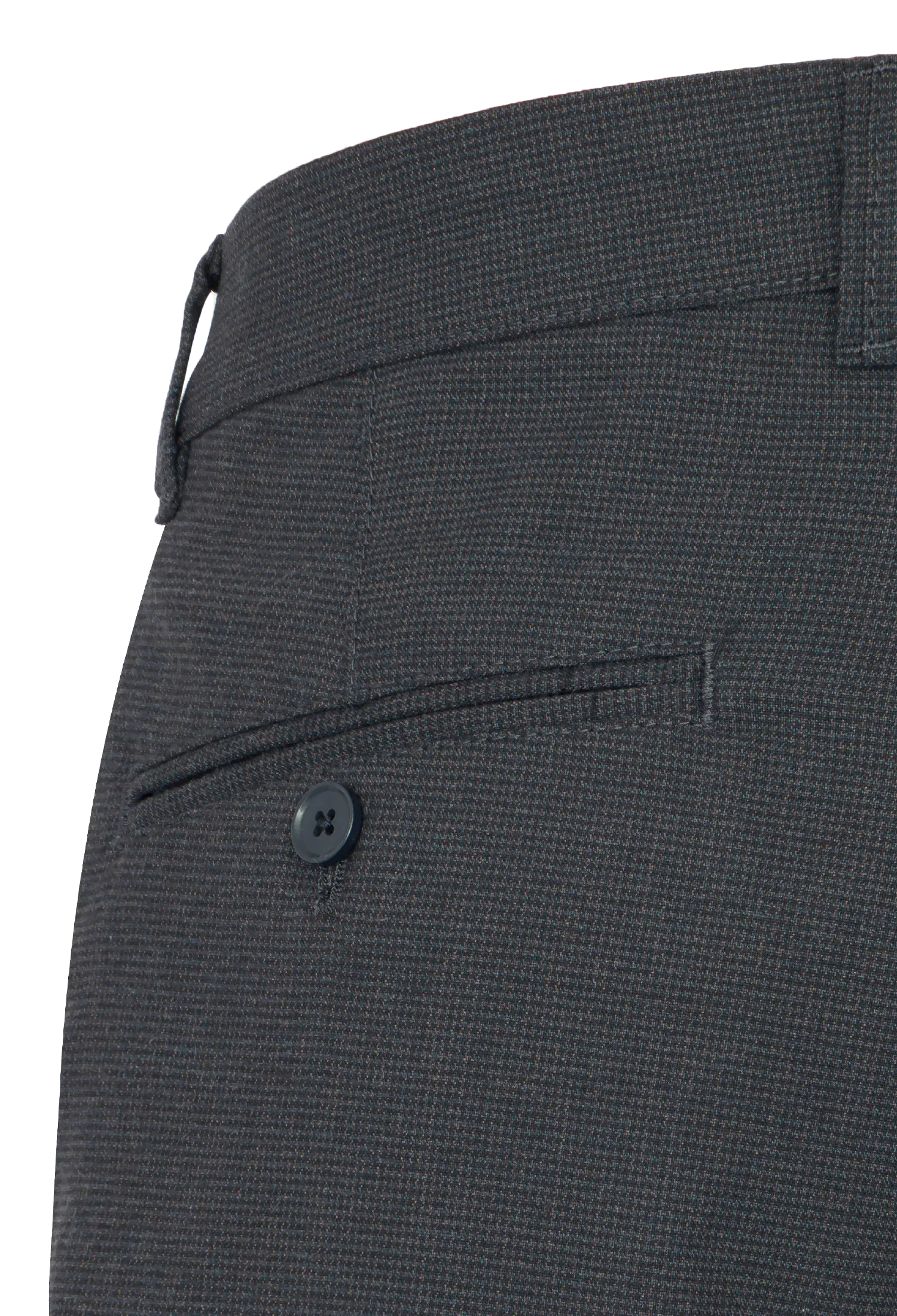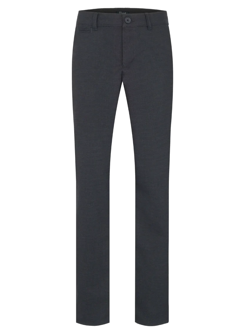 Spodnie męskie w kolorze antracytowym w drobne pepitko zostały wykonane z wysokiej jakości tkaniny powstałej z odpowiednio dobranej kompozycji przędz. Dzięki zawartości elastanu spodnie doskonale dopasowują się do sylwetki, są wygodne w noszeniu i stanowią stylową alternatywę dla klasycznych spodni na kant. Materiał jest miękki, przyjemny w dotyku i odporny na pilling.