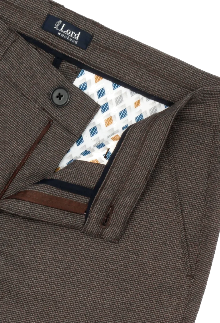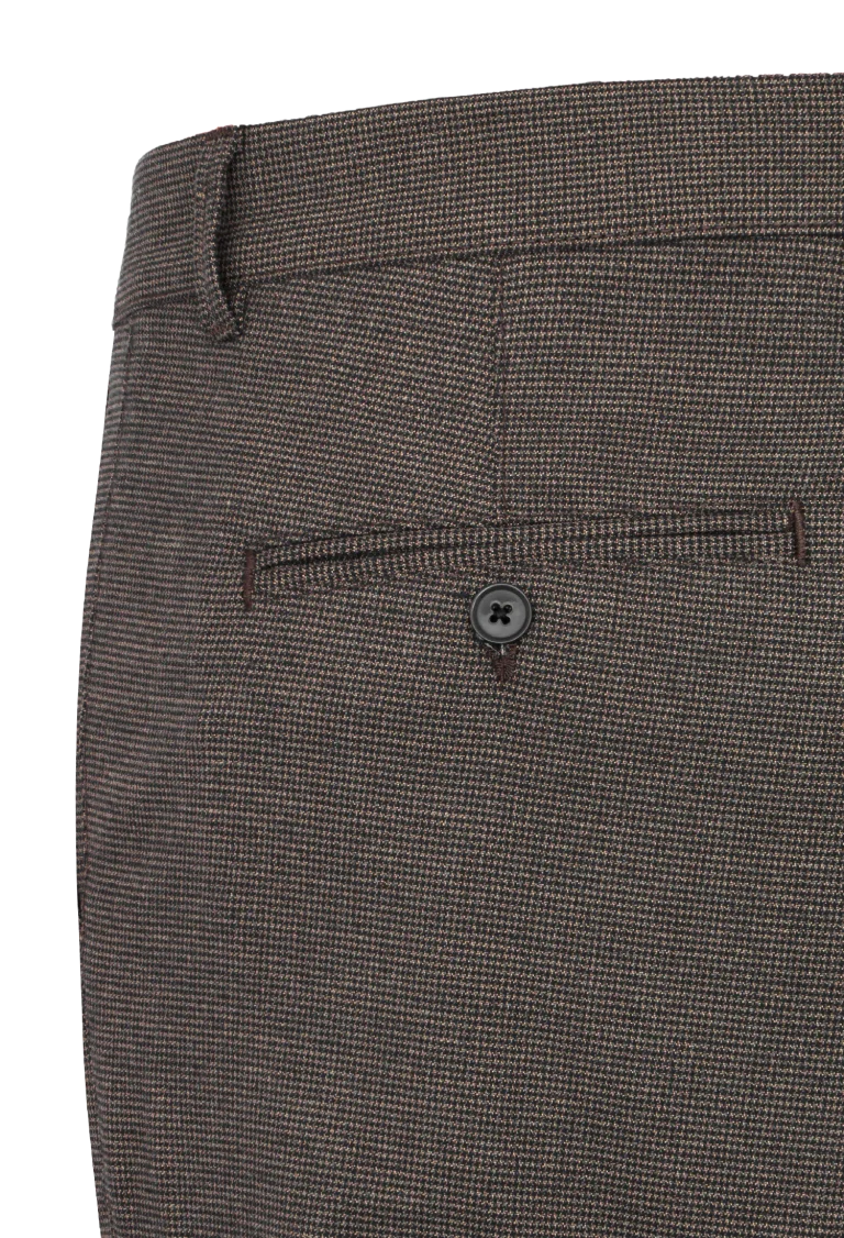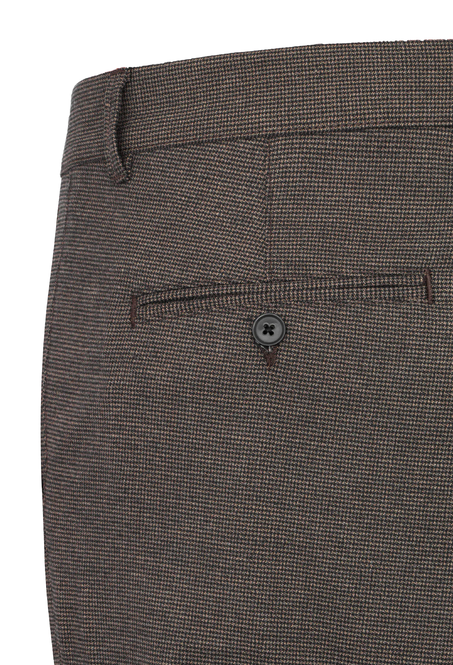 Spodnie męskie w kolorze camelowym w drobne pepitko zostały wykonane z wysokiej jakości tkaniny powstałej z odpowiednio dobranej kompozycji przędz. Dzięki zawartości elastanu spodnie doskonale dopasowują się do sylwetki, są wygodne w noszeniu i stanowią stylową alternatywę dla klasycznych spodni na kant. Materiał jest miękki, przyjemny w dotyku i odporny na pilling.