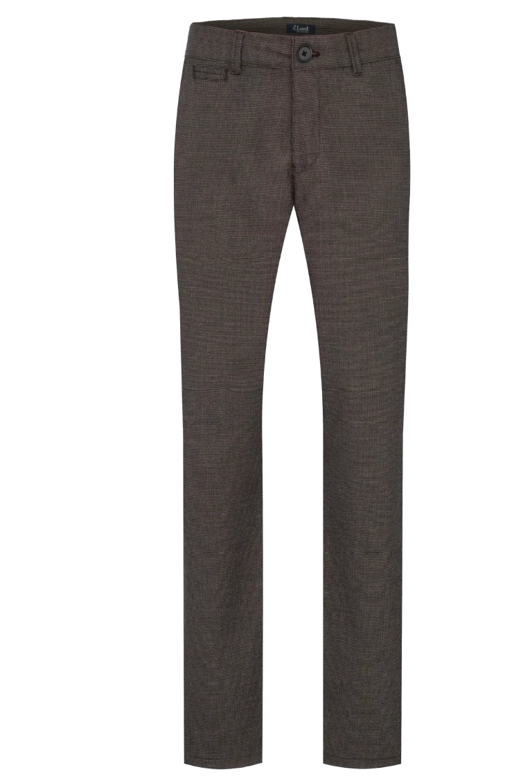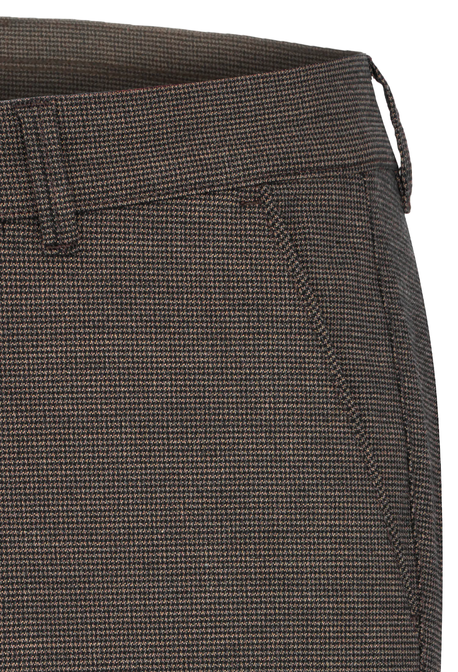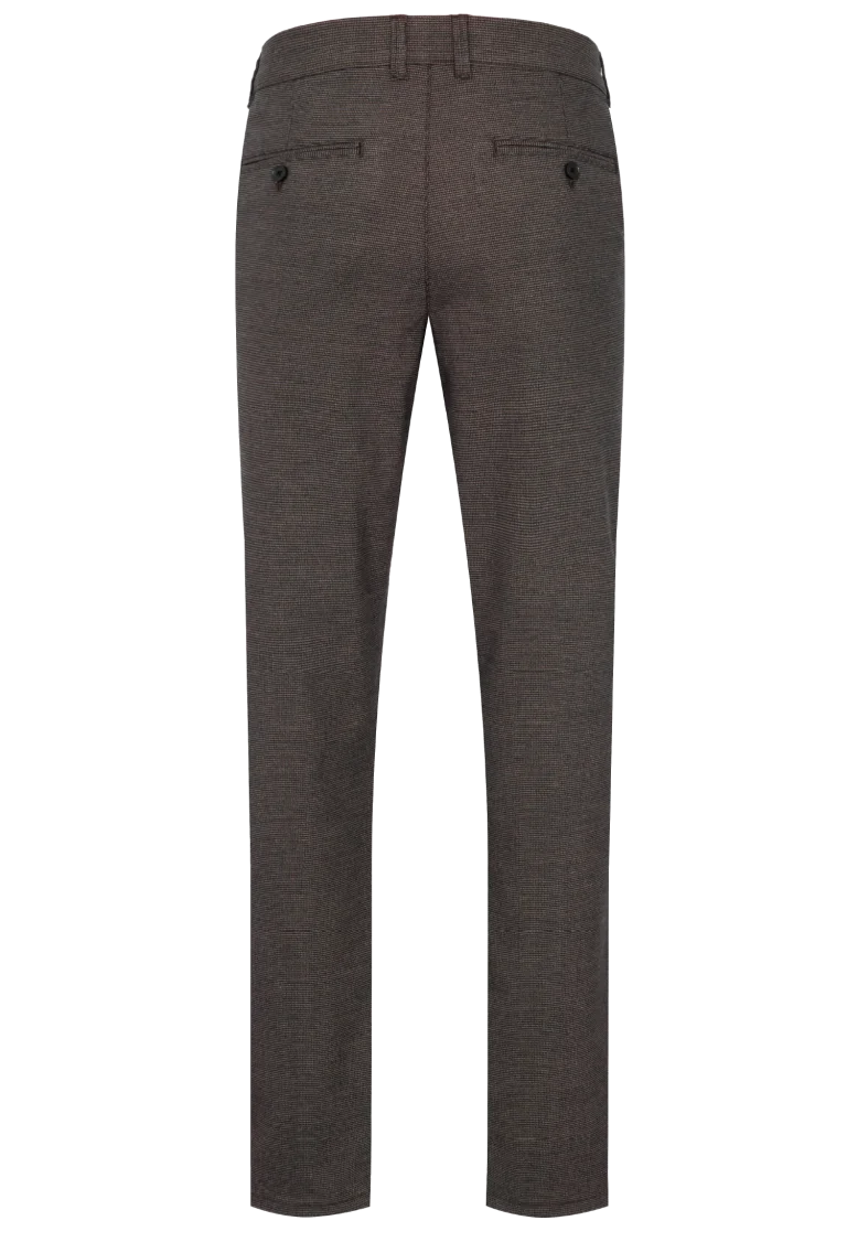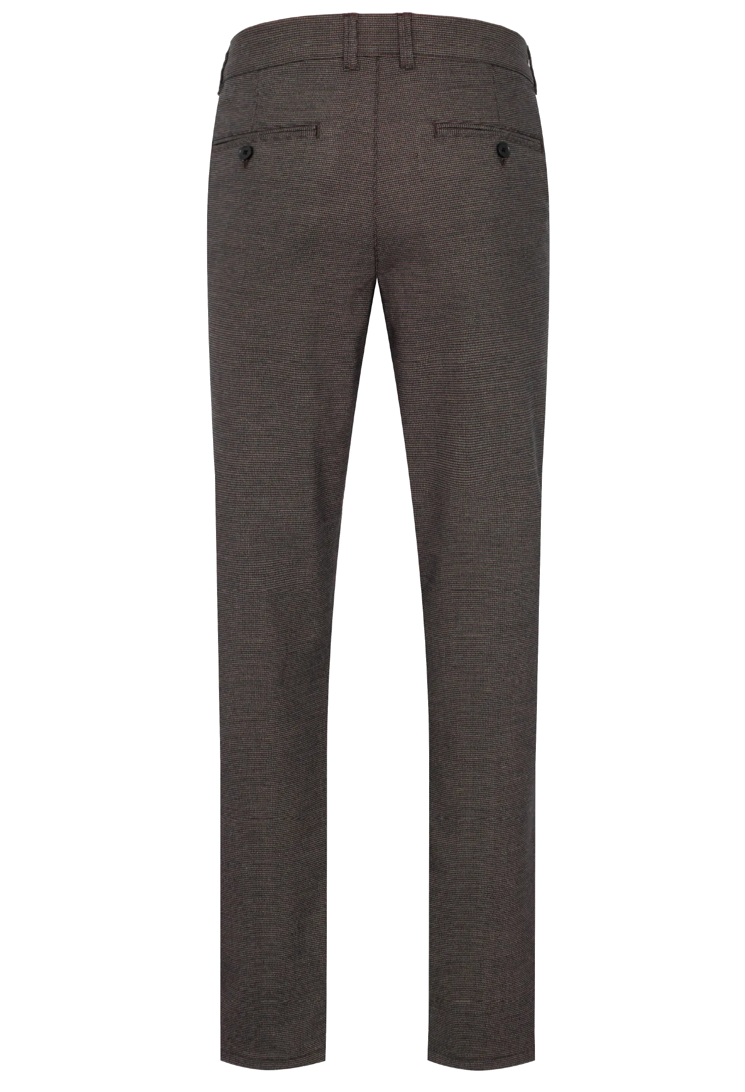 Spodnie męskie w kolorze camelowym w drobne pepitko zostały wykonane z wysokiej jakości tkaniny powstałej z odpowiednio dobranej kompozycji przędz. Dzięki zawartości elastanu spodnie doskonale dopasowują się do sylwetki, są wygodne w noszeniu i stanowią stylową alternatywę dla klasycznych spodni na kant. Materiał jest miękki, przyjemny w dotyku i odporny na pilling.