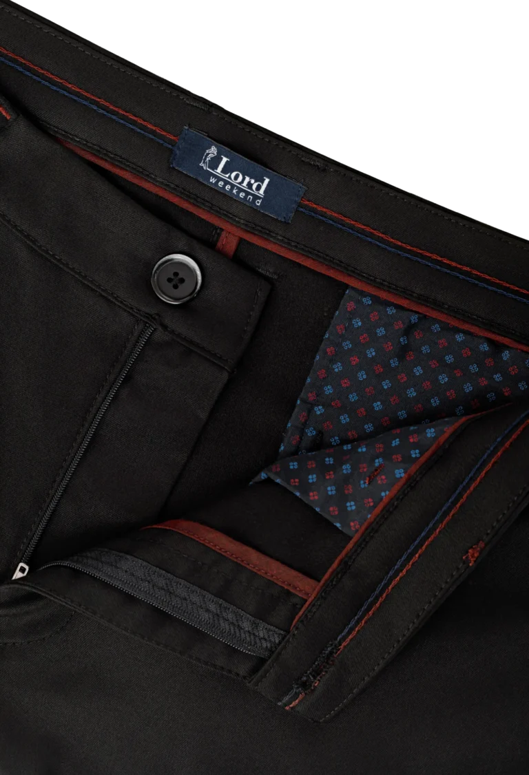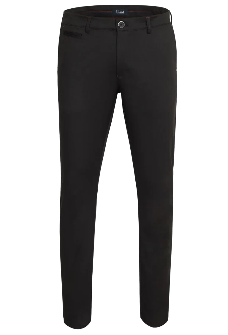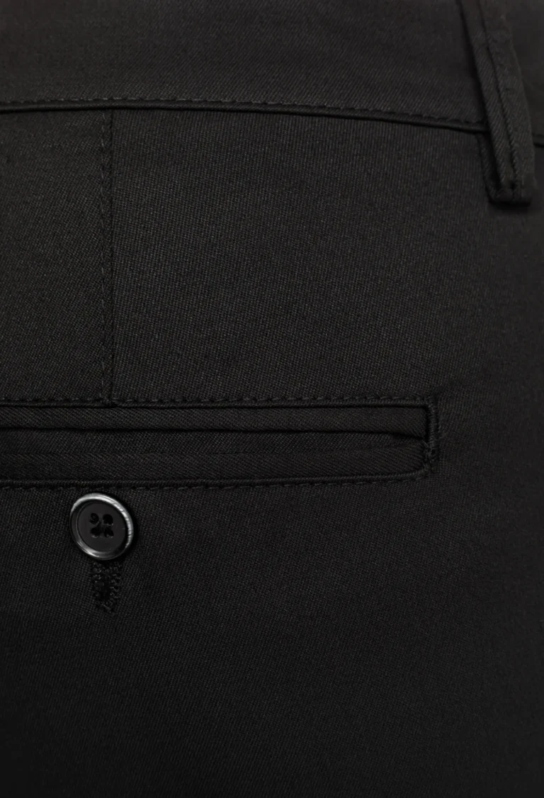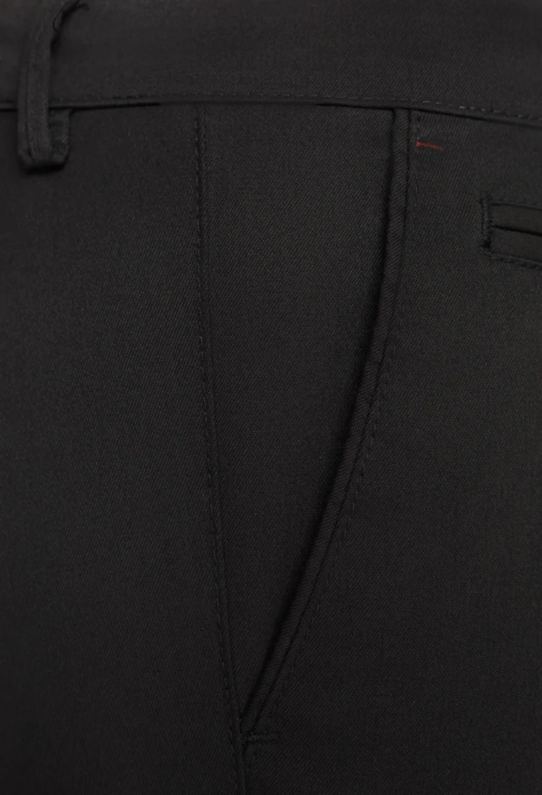 Spodnie męskie w kolorze czarnym zostały wykonane z wysokiej jakości tkaniny powstałej z odpowiednio dobranej kompozycji przędz. Dzięki zawartości elastanu spodnie doskonale dopasowują się do sylwetki, są wygodne w noszeniu i stanowią stylową alternatywę dla klasycznych spodni na kant. Materiał jest miękki, przyjemny w dotyku i odporny na pilling.