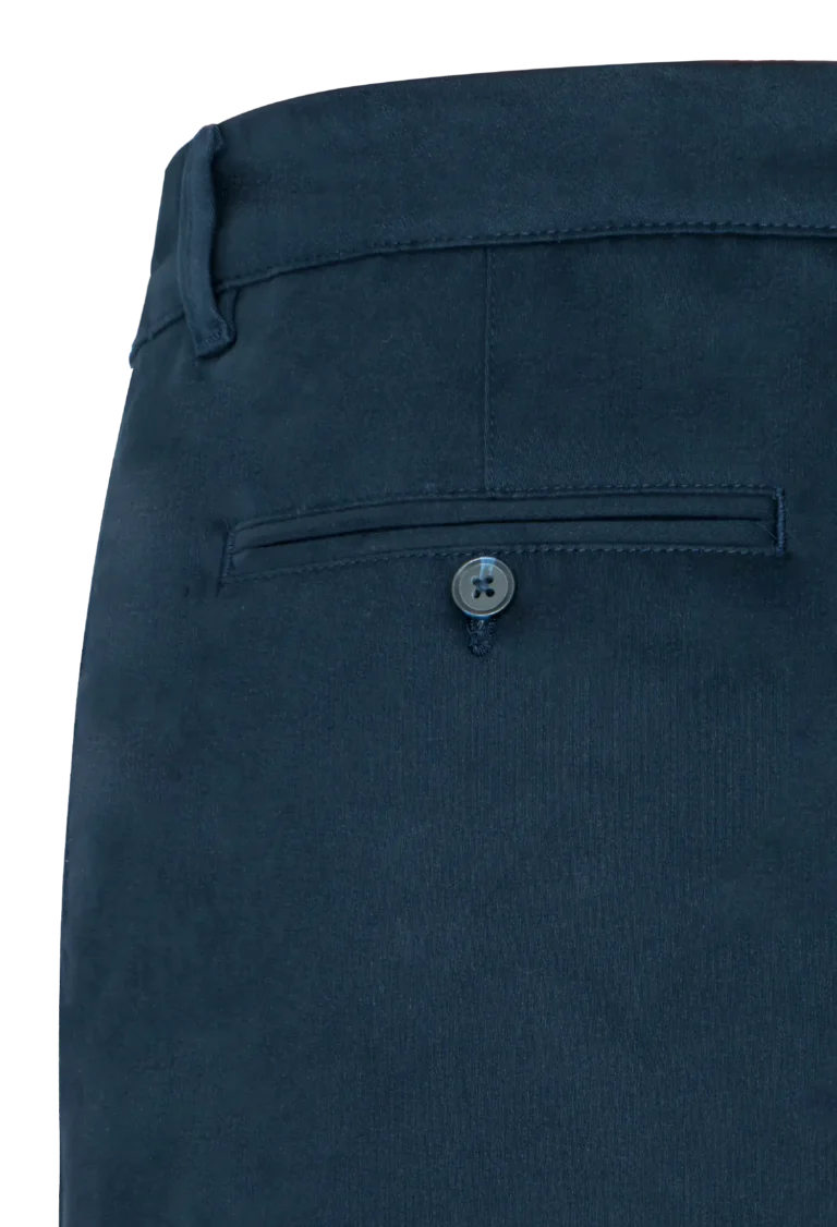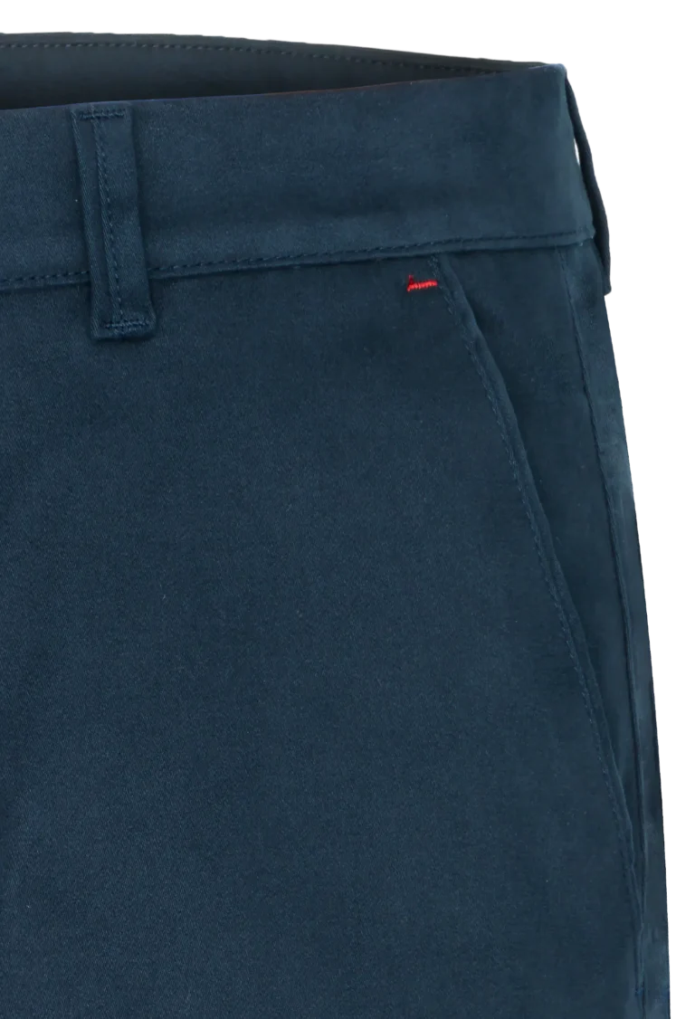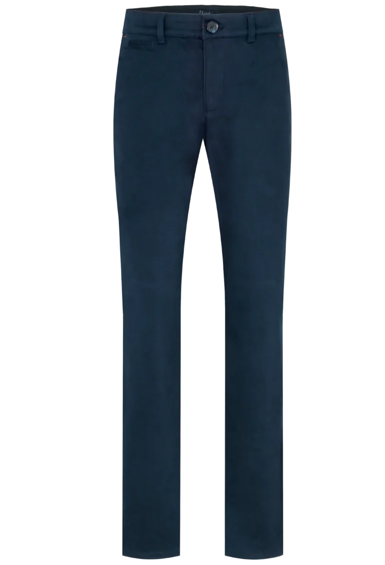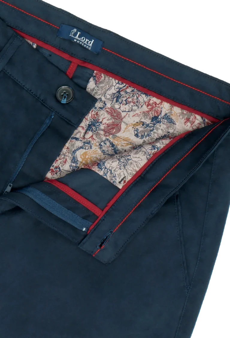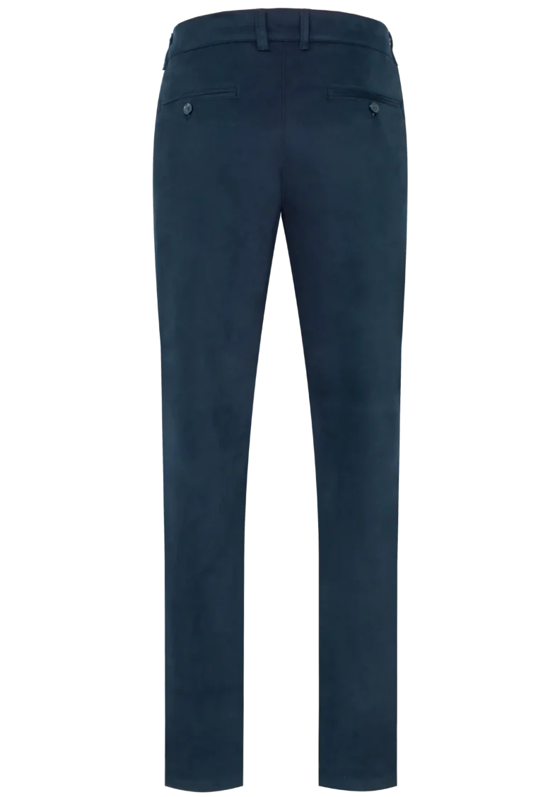 Spodnie męskie w kolorze granatowym wykonane z wysokogatunkowej bawełny z dodatkiem elastanu. Dzięki jego zawartości spodnie są bardzo wygodne i zapewniają dużą swobodę ruchu. Prosty, klasyczny krój nogawek dodaje im elegancji. Materiał jest miękki i przyjemny w dotyku.