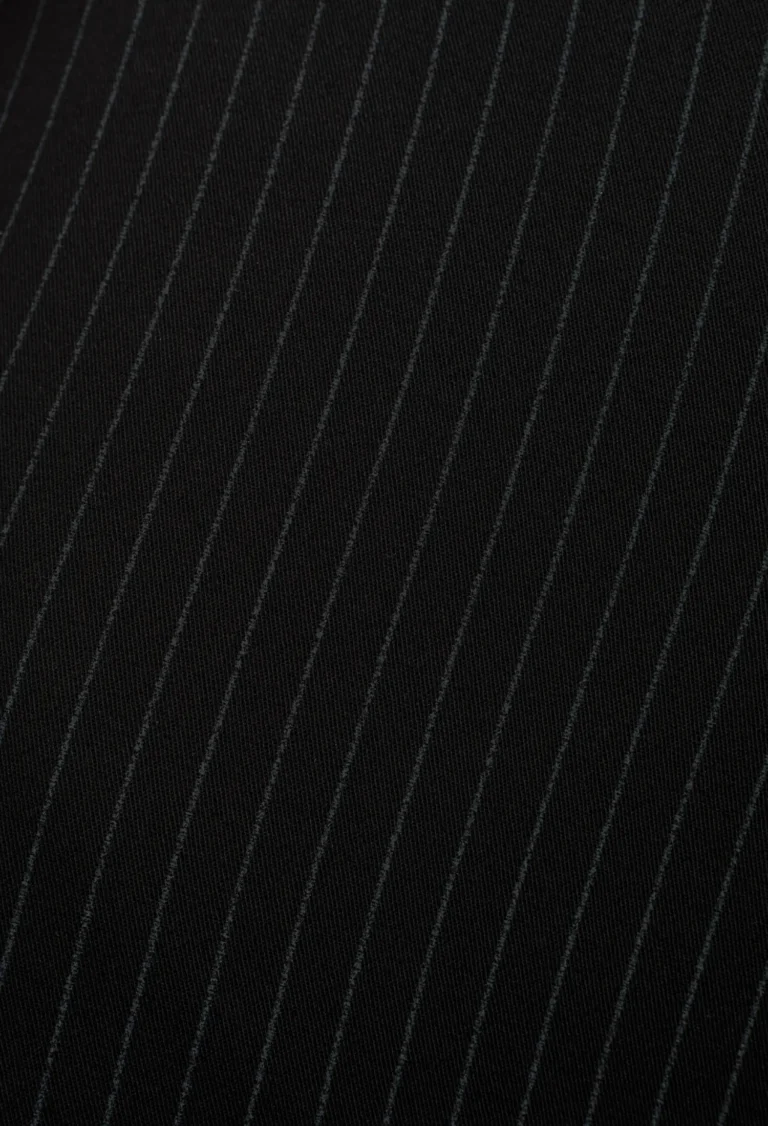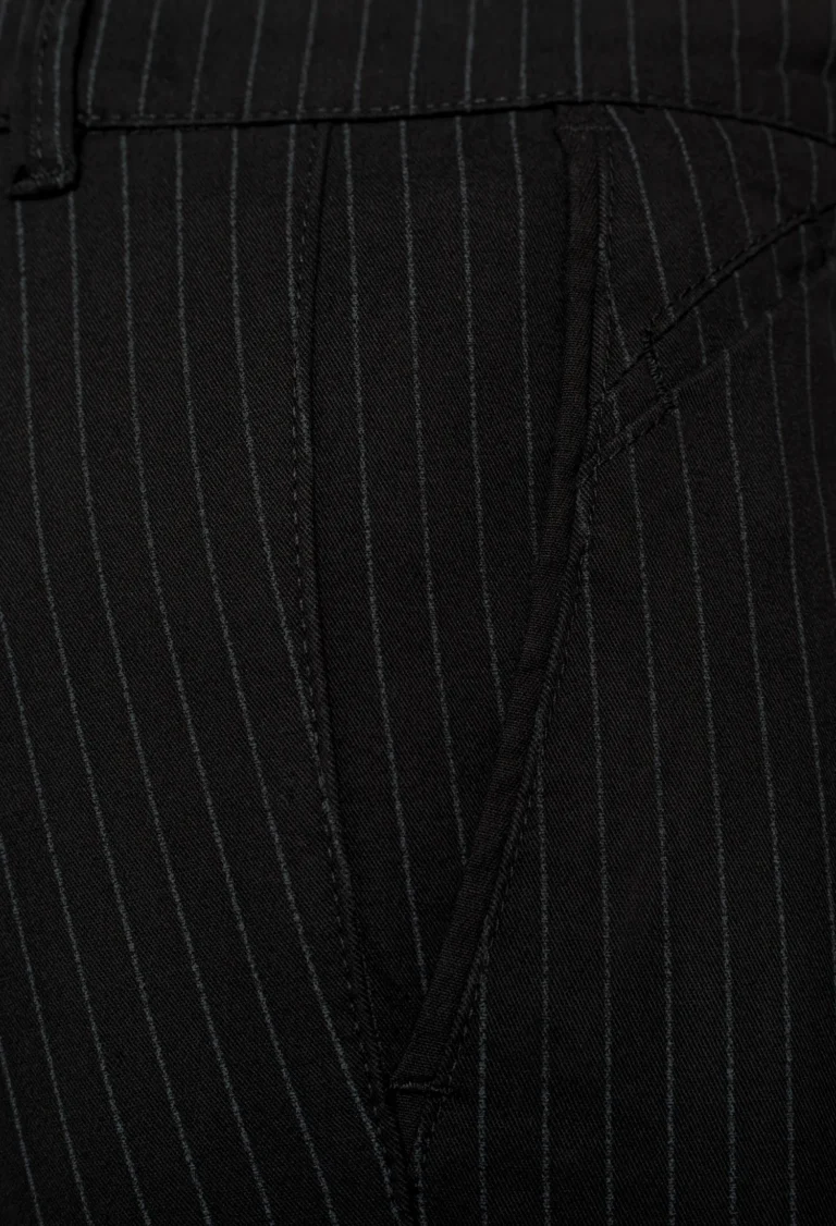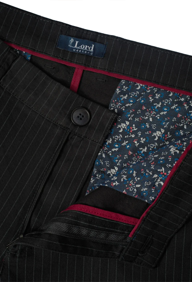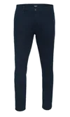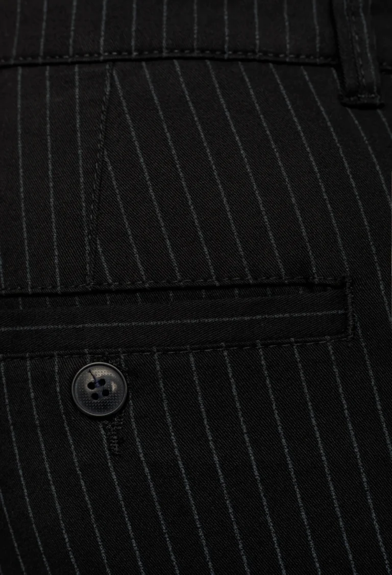 Spodnie wykonane z jesienno-zimowej wysokogatunkowej bawełnianej tkaniny w kolorze granatowym w delikatny tenis o rozstawie 0,8 mm z dodatkiem elastanu. Model posiada pięć kieszeni, dwie skośne kieszenie w przodzie z finezyjnie odszytą zegarkówką po skosie i dwie w tyle cięte kieszenie z jedną szeroką wypustką, zapinane na guzik. Są to niezwykle wygodne spodnie, miłe w dotyku, stanowią podstawę do swobodnych jak i bardziej eleganckich stylizacji.
